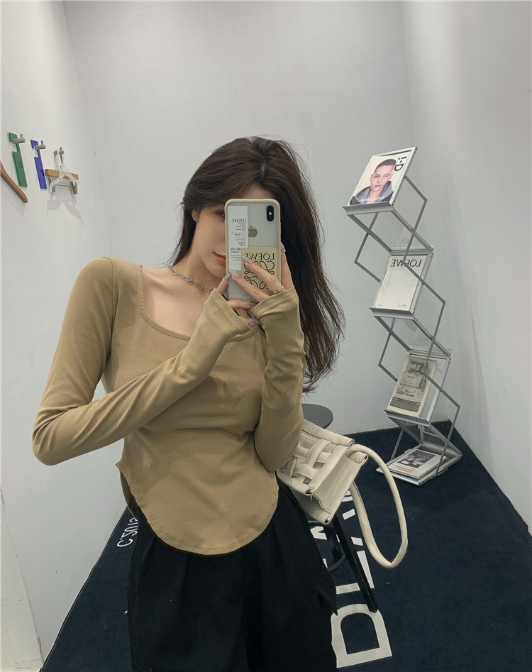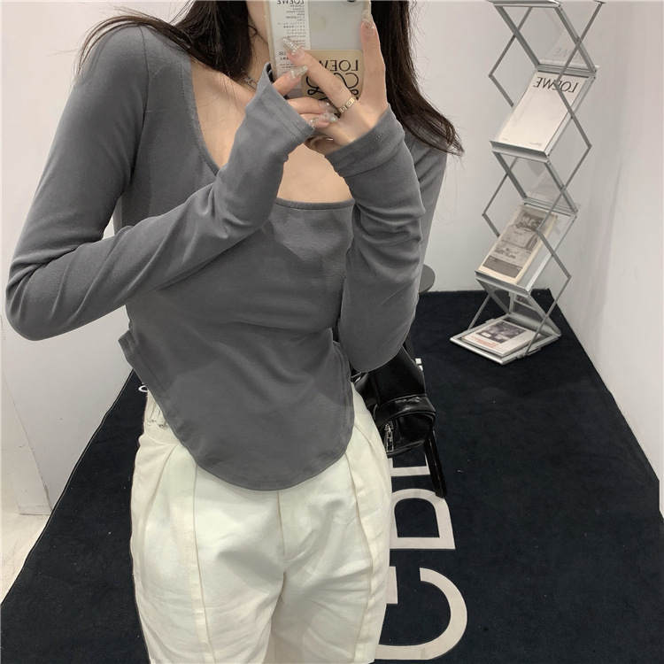GW-532 秋裝新款U領純色性感低領不規則修身長袖T內搭打底衫