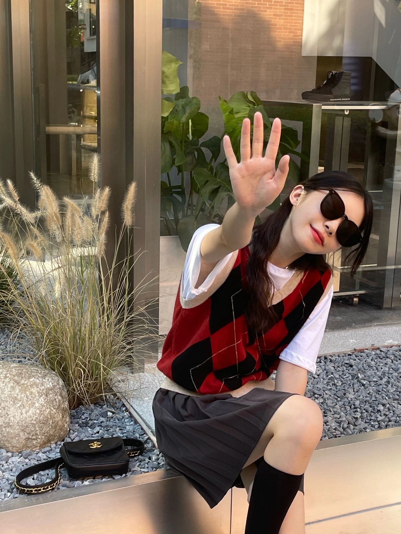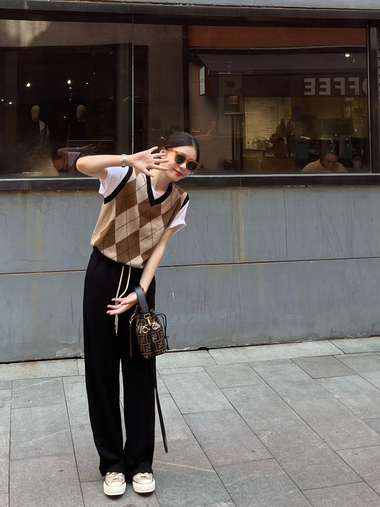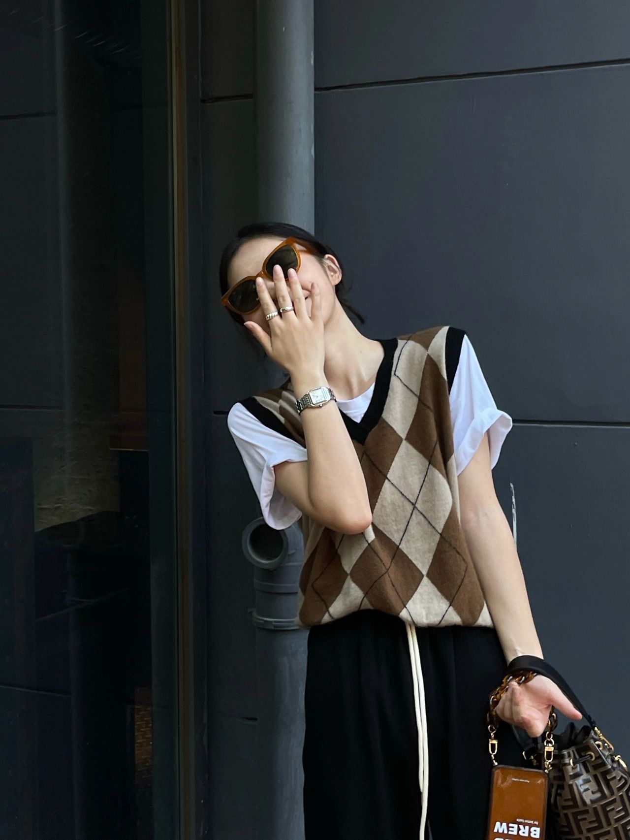 JMA-392 实拍 2023秋冬季新款韩版复古菱格针织学院V领格子毛衣马甲背心女