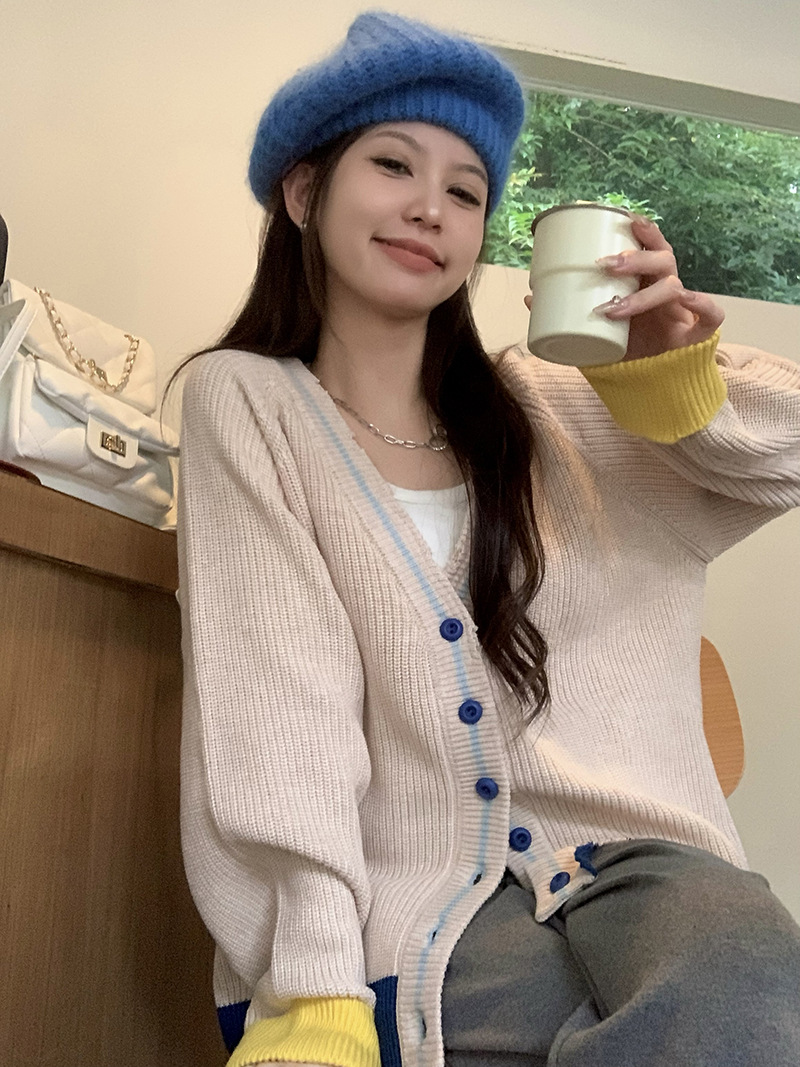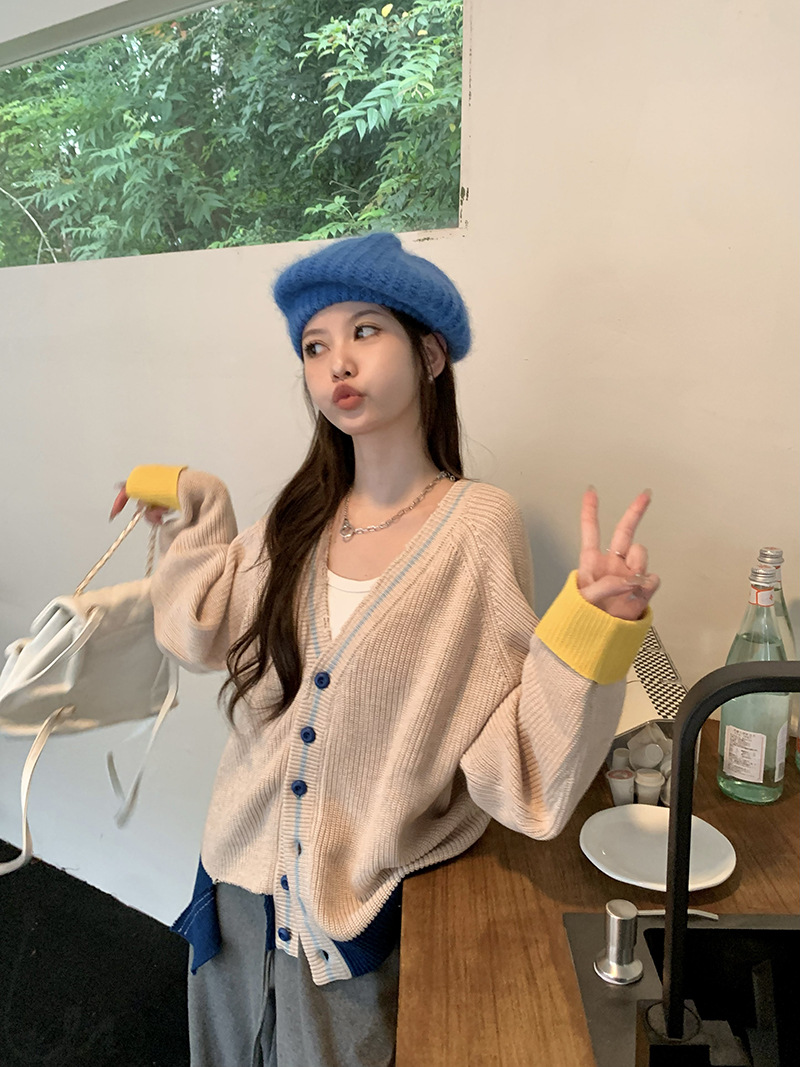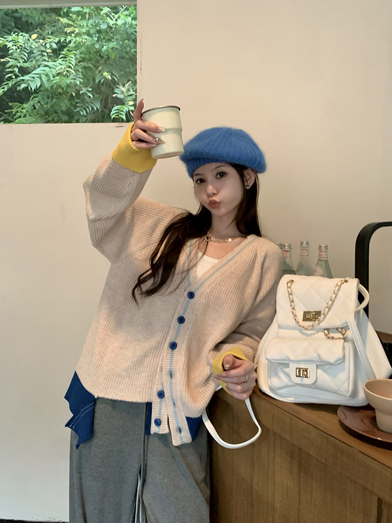 JMA-393 实拍2023秋冬韩版撞色甜美慵懒风拼接软糯针织衫开衫毛衣外套上衣