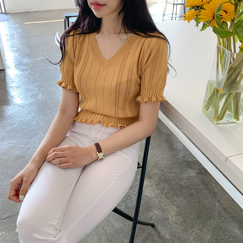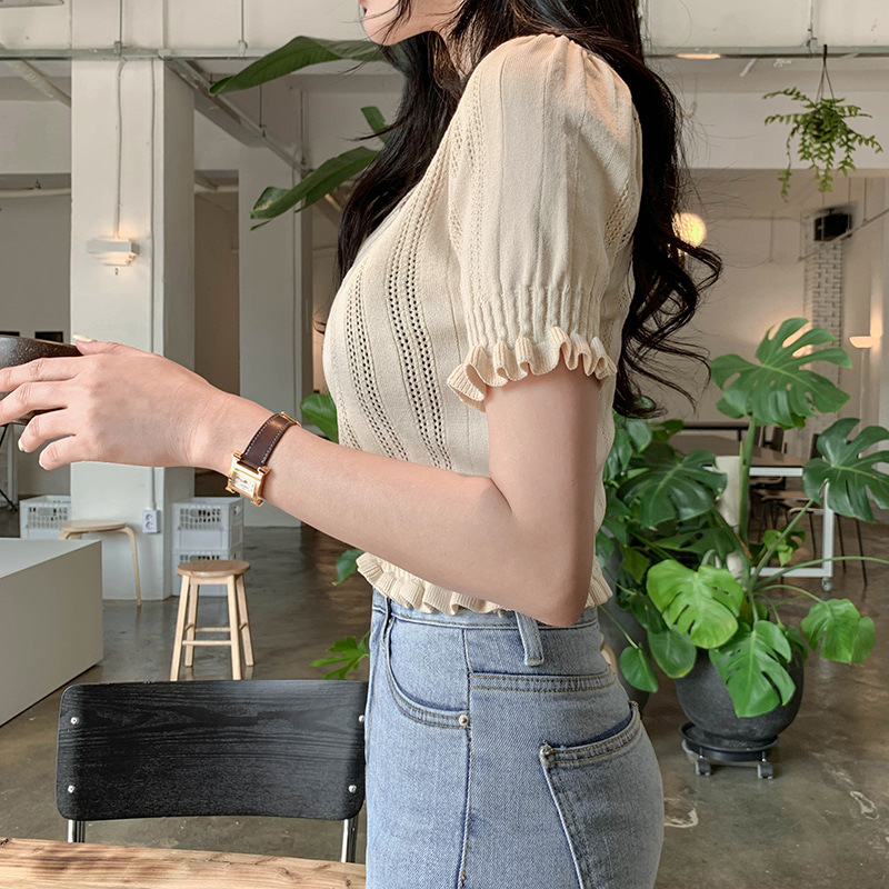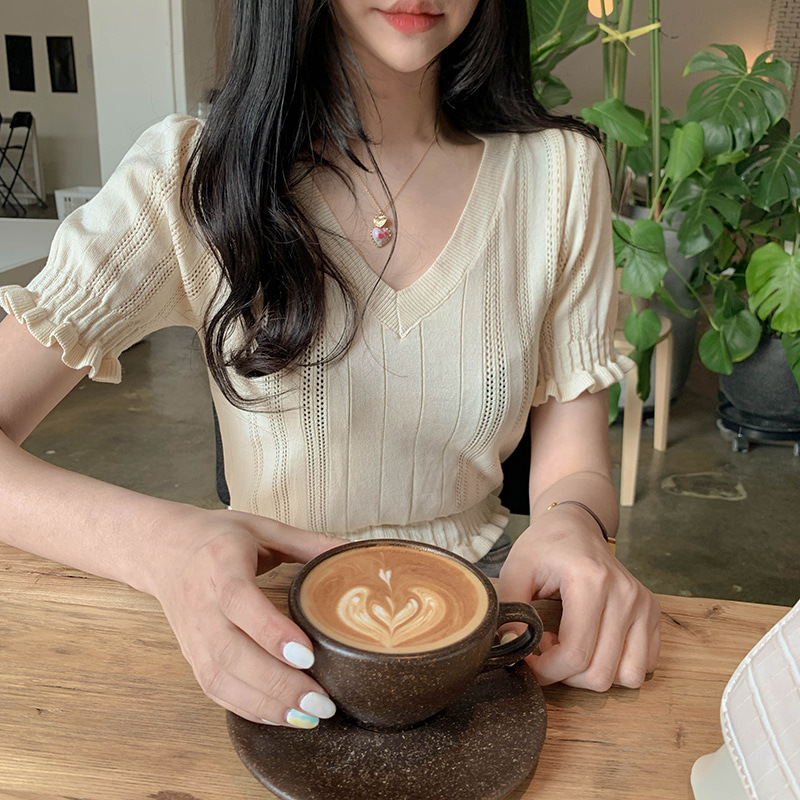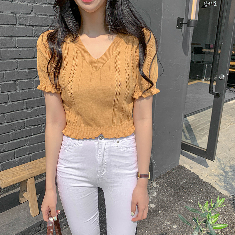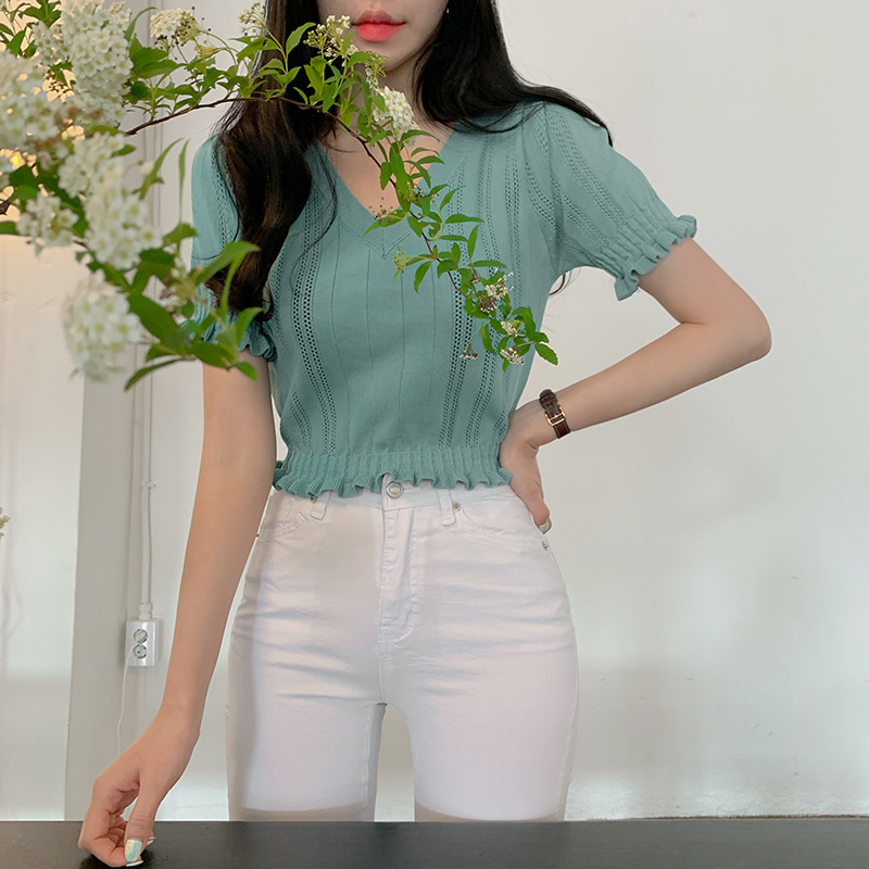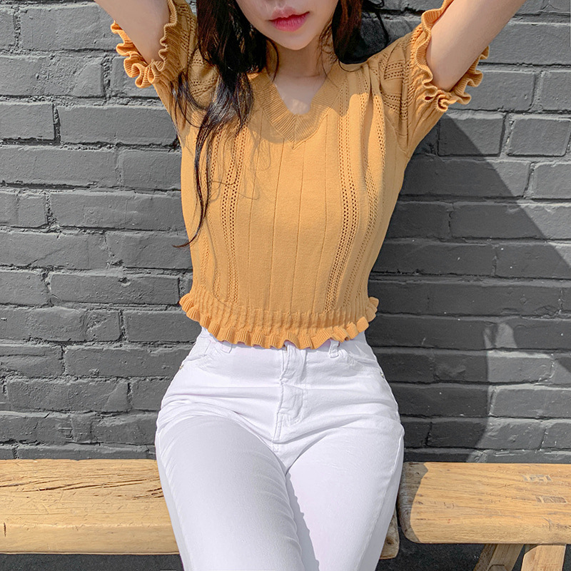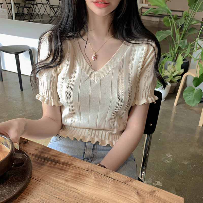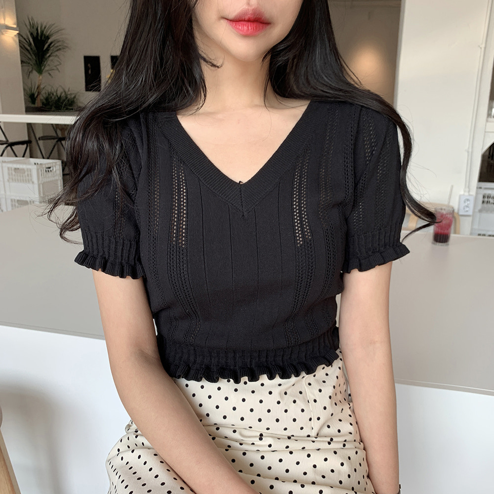 MNH-9712 夏季新款短袖小清新透氣鏤空顯瘦露腰小性感木耳邊V領針織 上衣