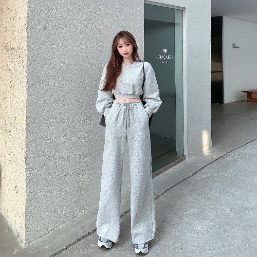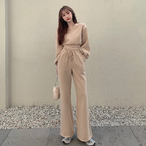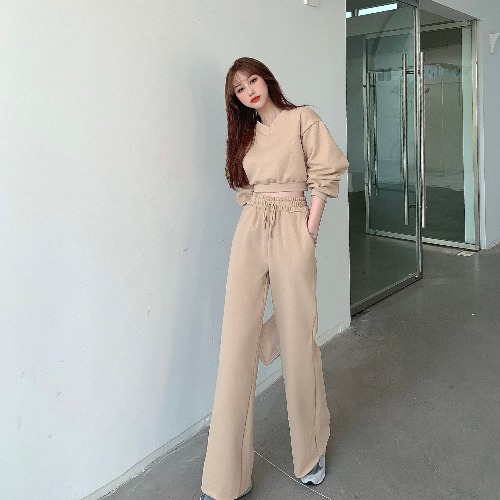 WBX-H0007 韓版V領炸街短款衛衣+高腰顯瘦闊腿長褲運動時套裝拖地長 褲