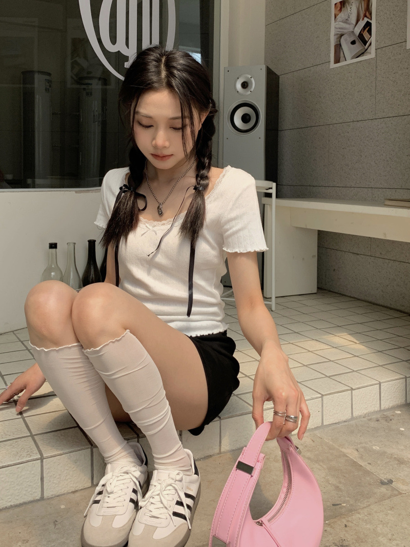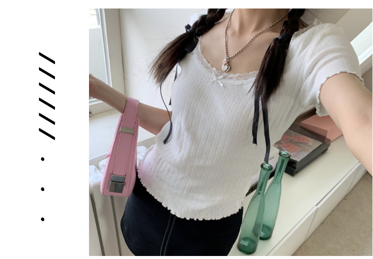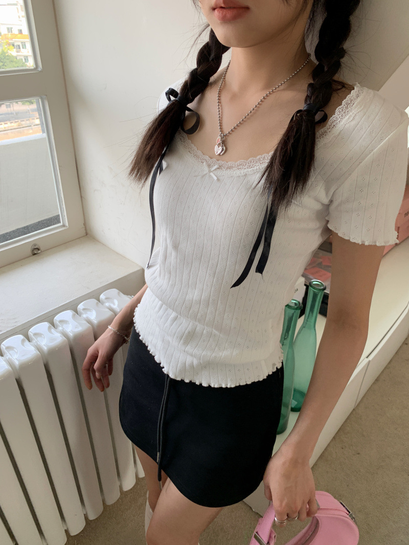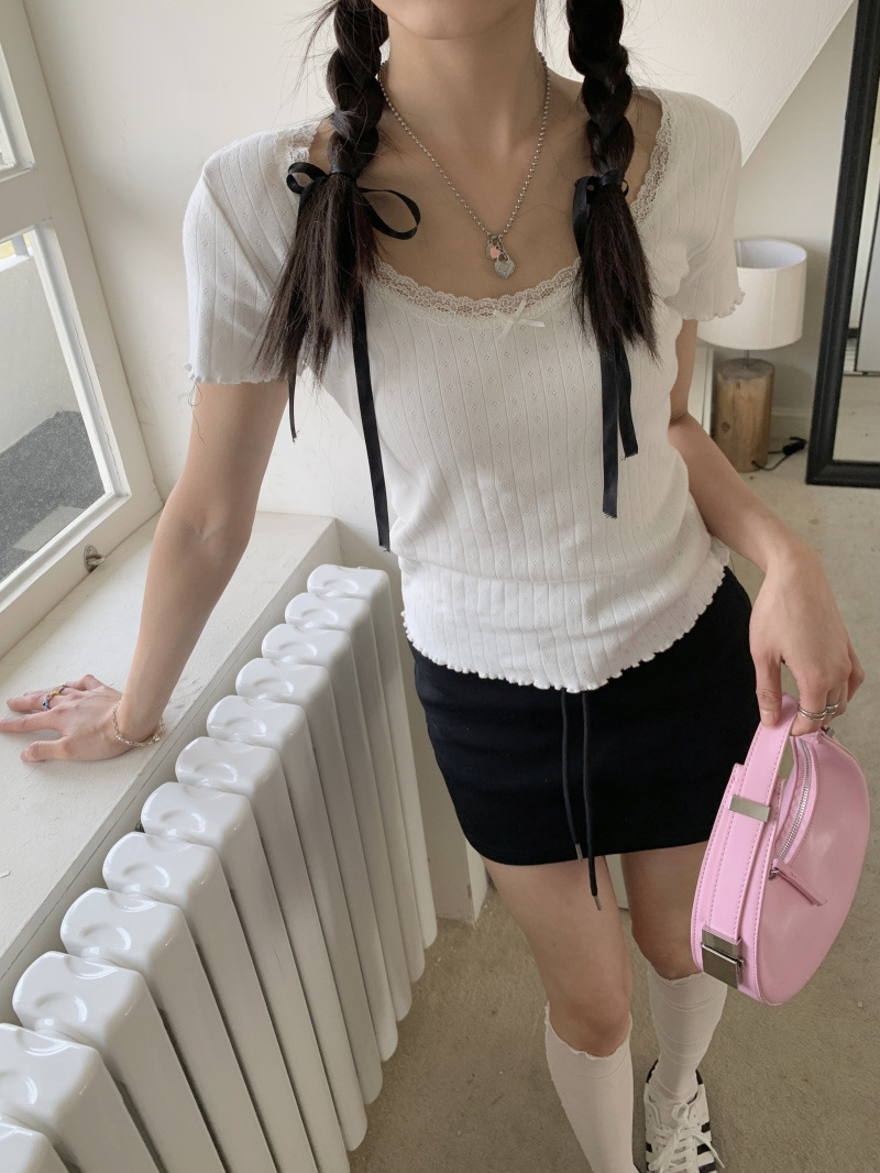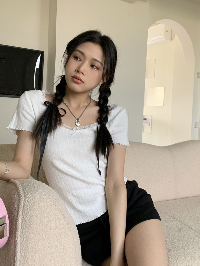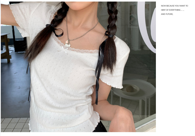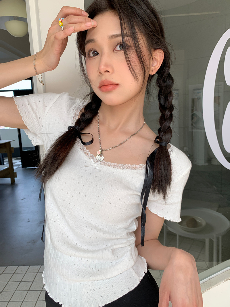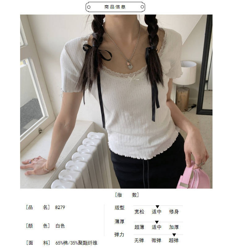 LXFS8279 純欲風蕾絲蝴蝶結短袖T夏季新款韓版圓領白色 上衣