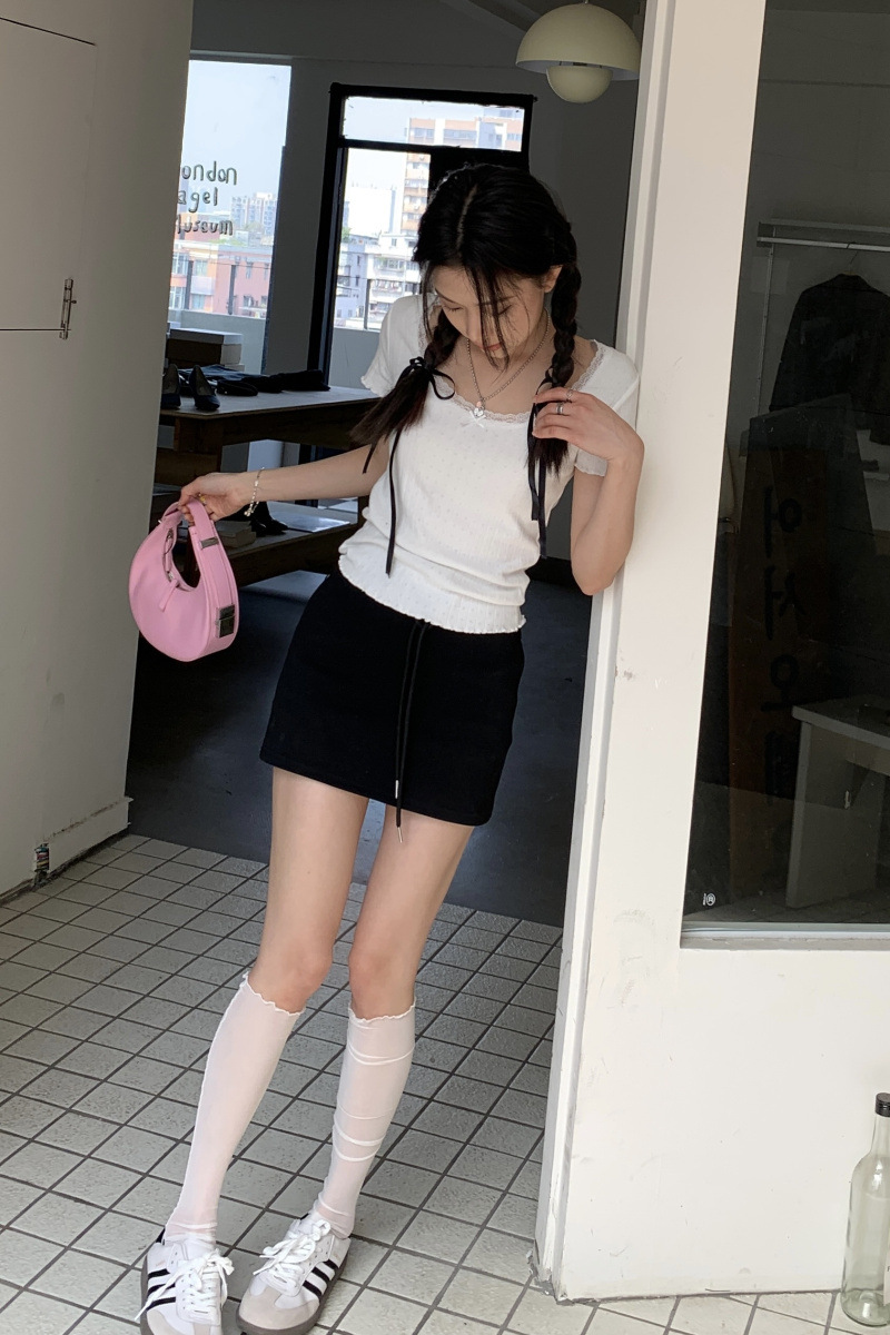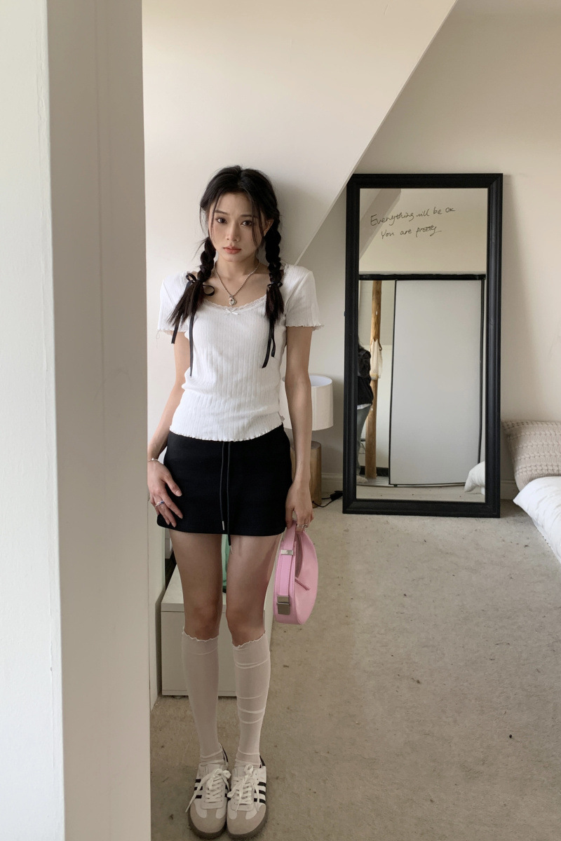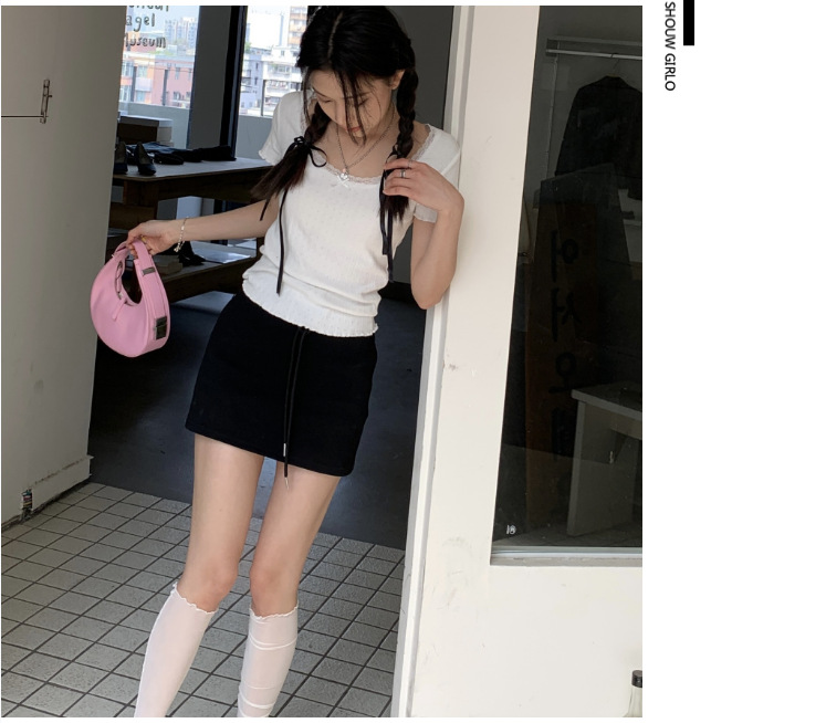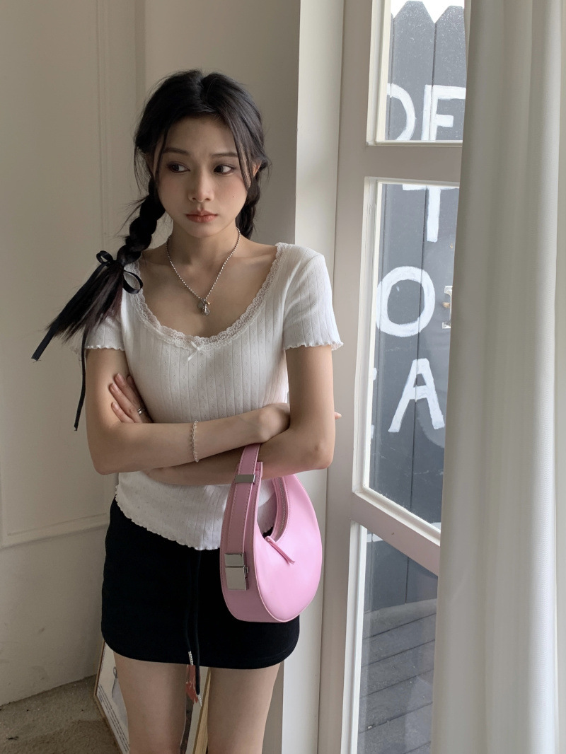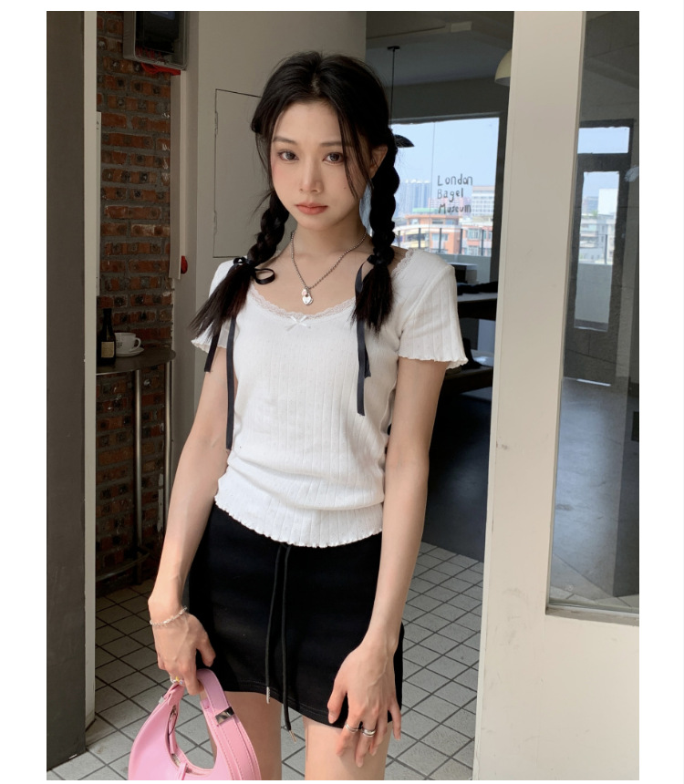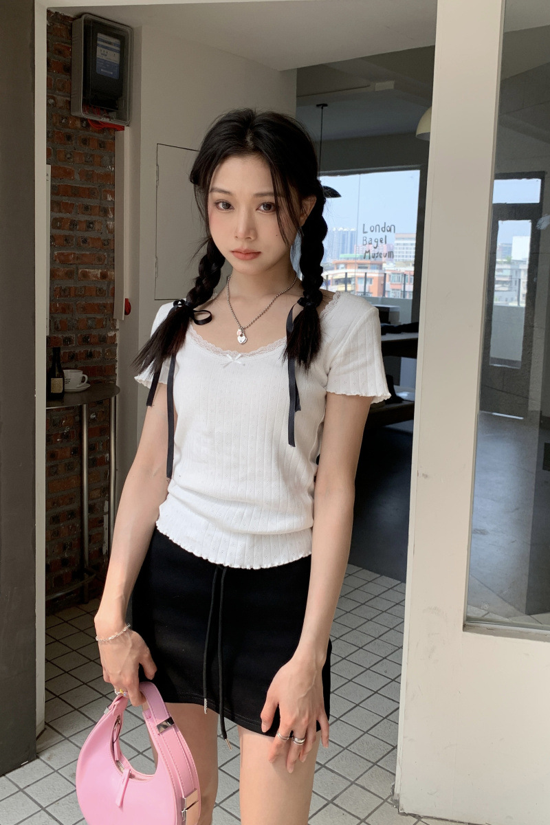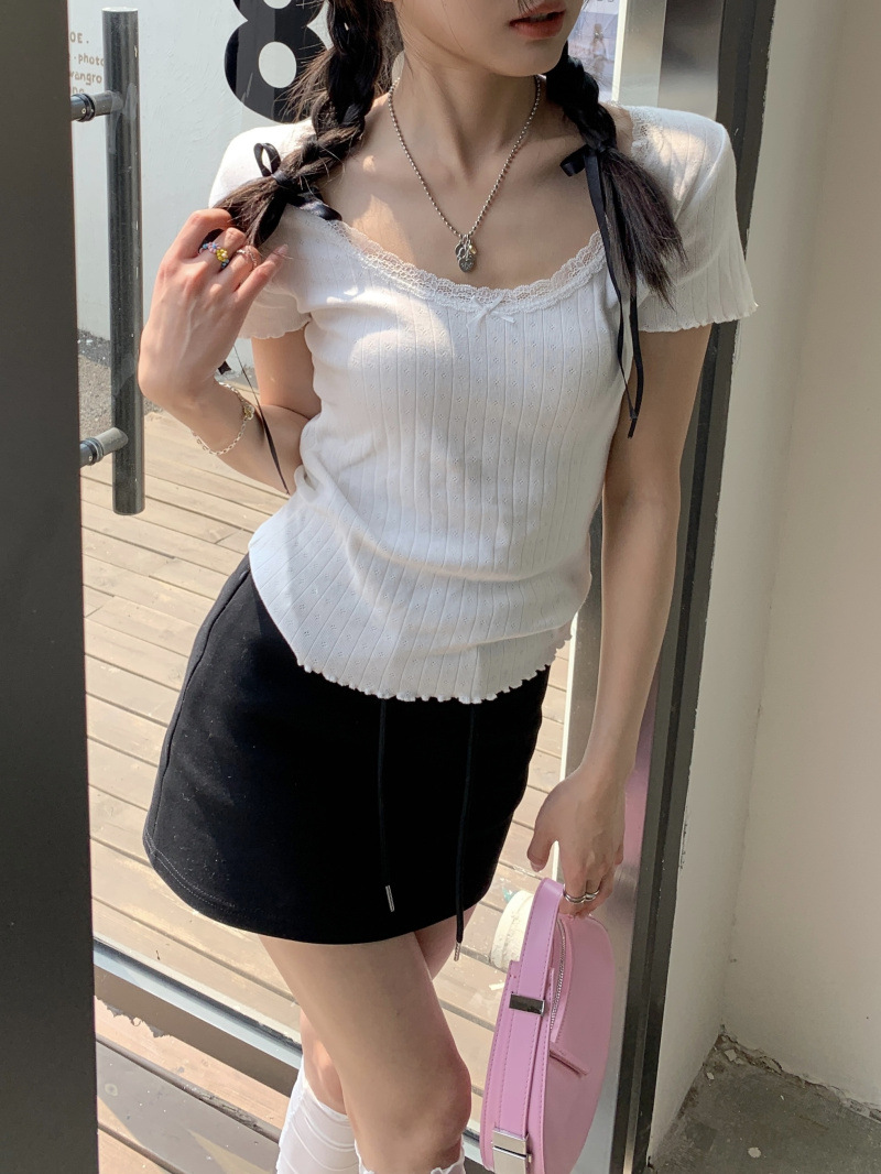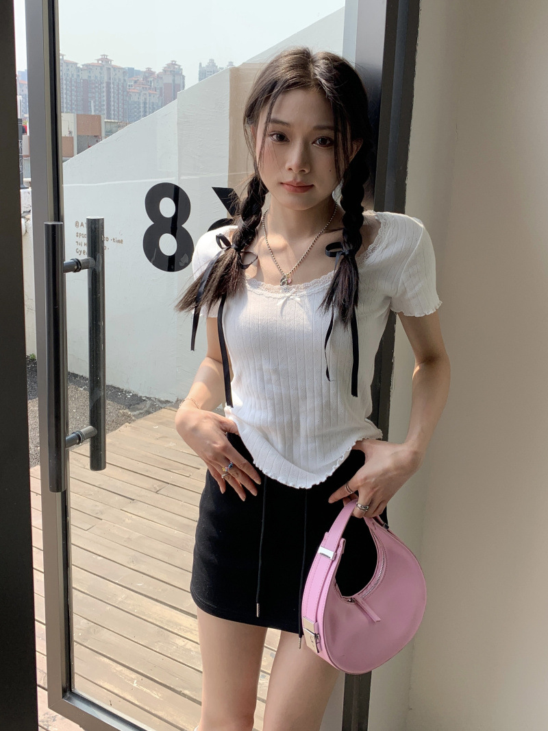 LXFS8279 純欲風蕾絲蝴蝶結短袖T夏季新款韓版圓領白色 上衣