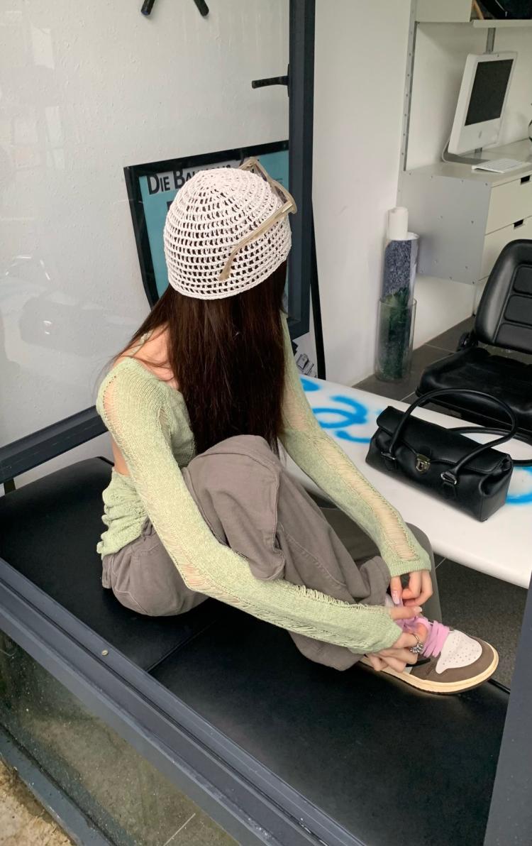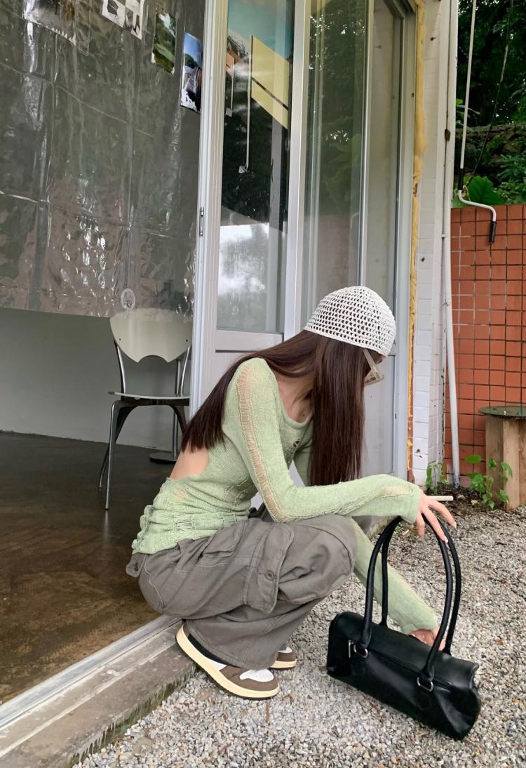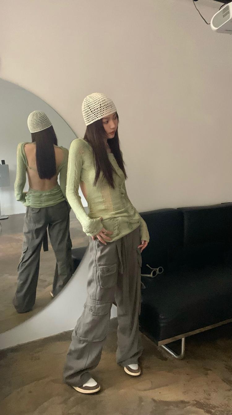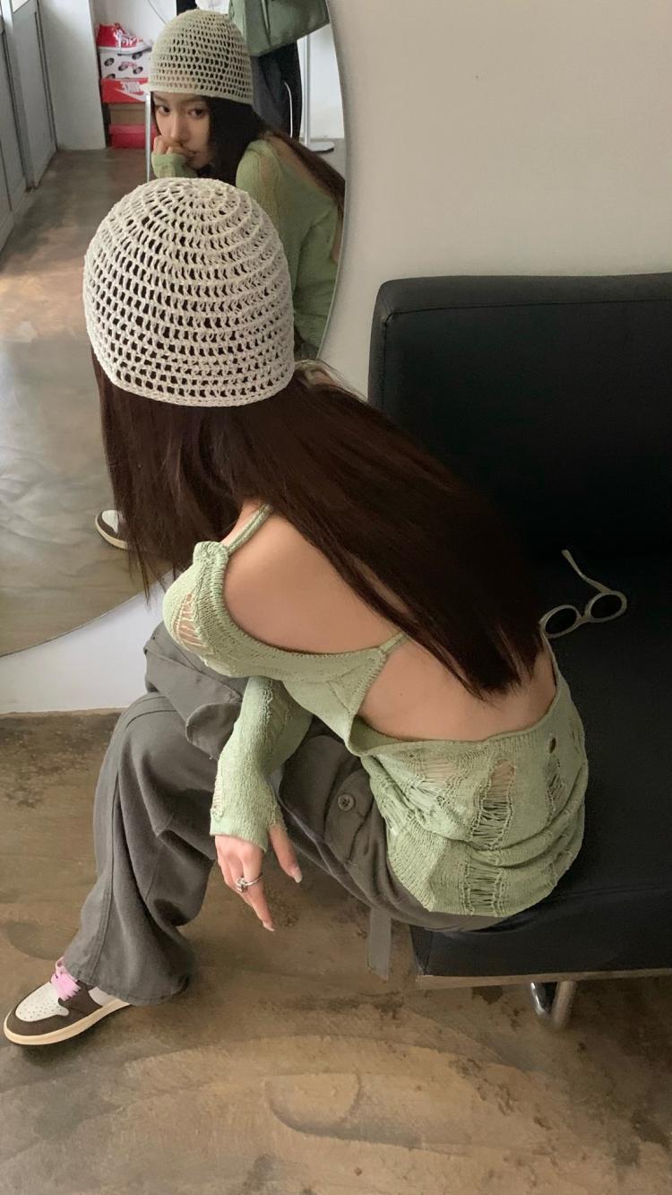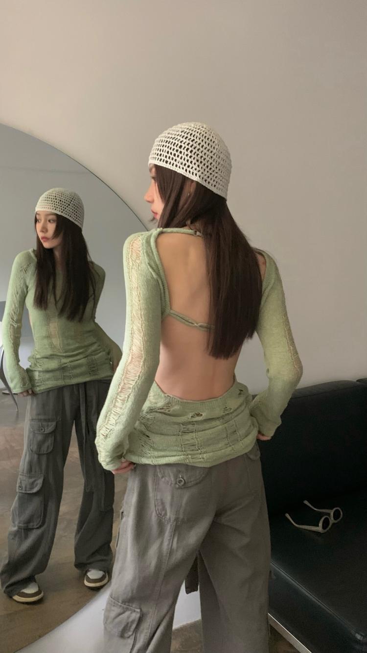 AMFS3292 顯瘦百搭辣妹鏤空露背針織衫 薄款修身設計感別緻綠色 上衣