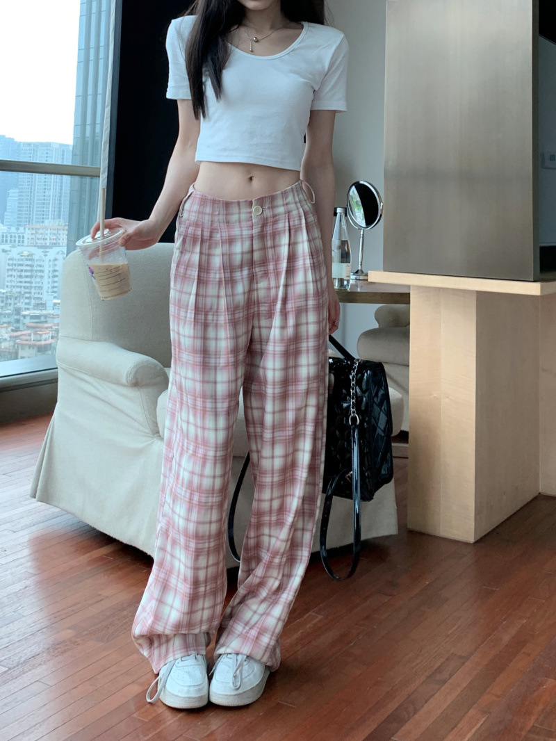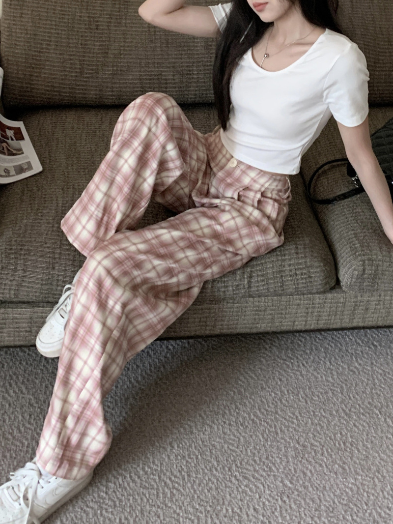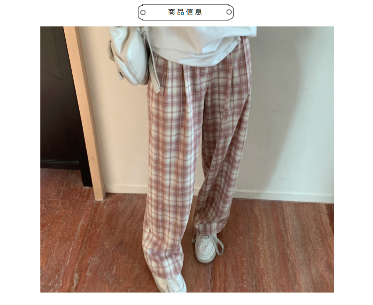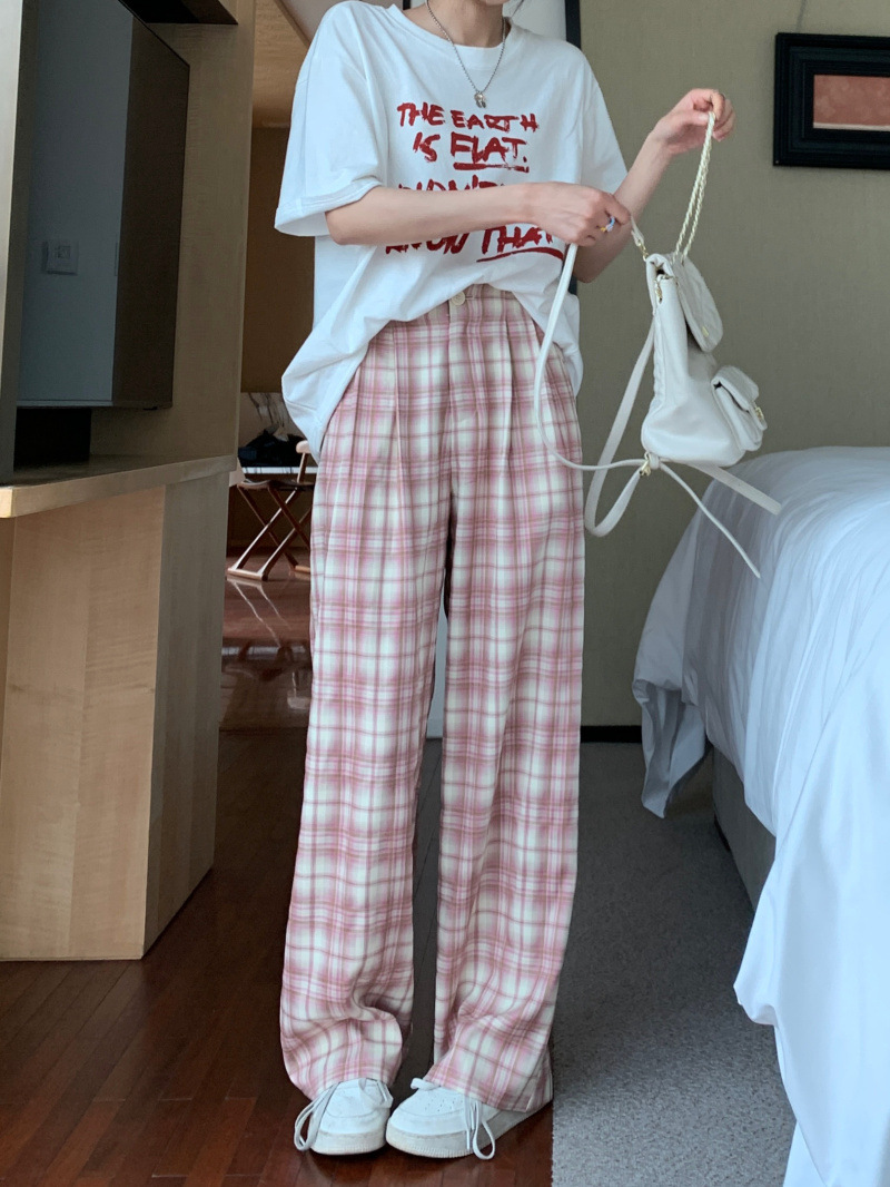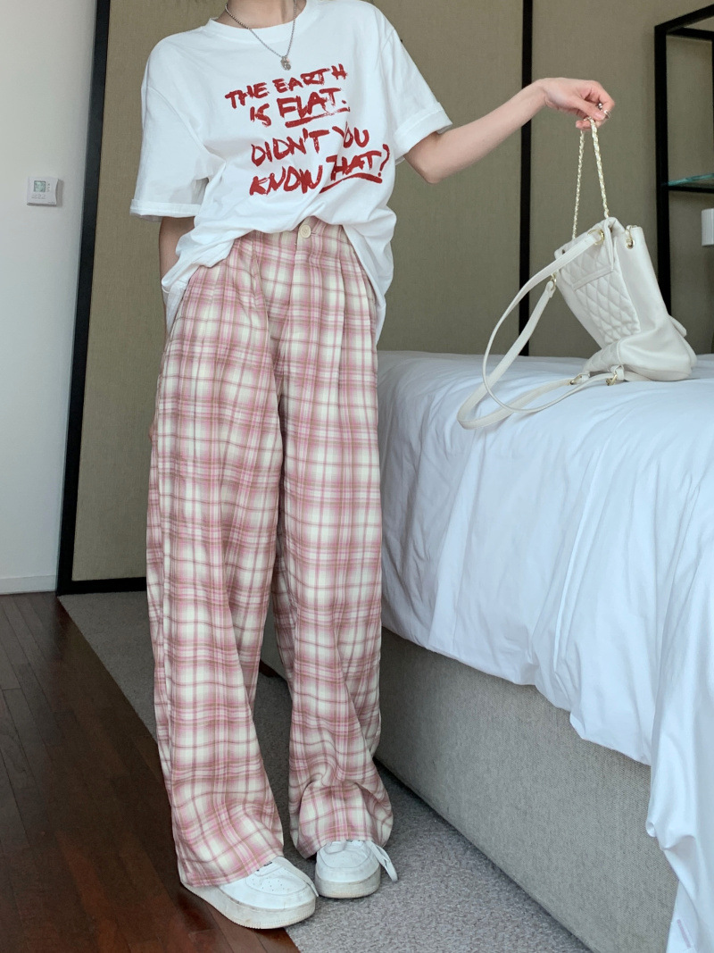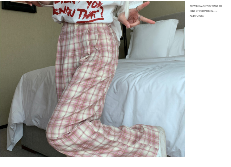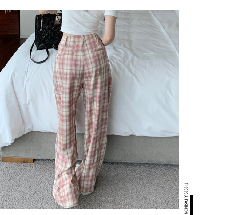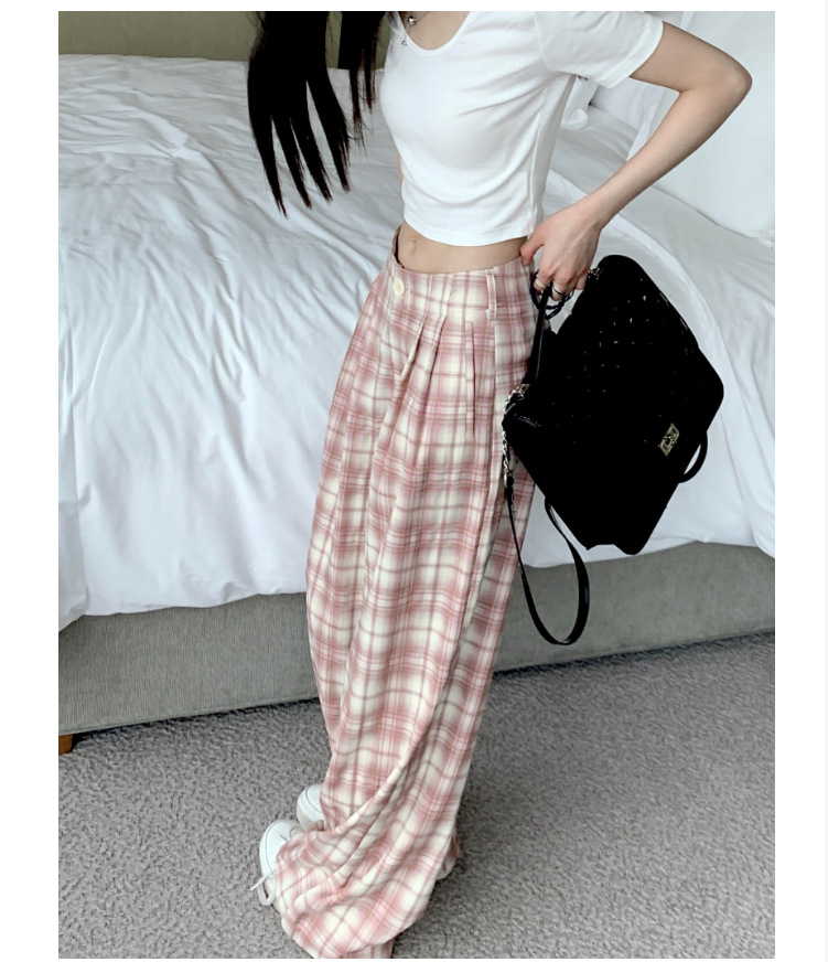 LXFS8296 粉色格子褲女款韓版高腰寬鬆休閒垂感拖地闊腿 褲