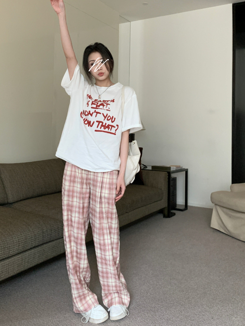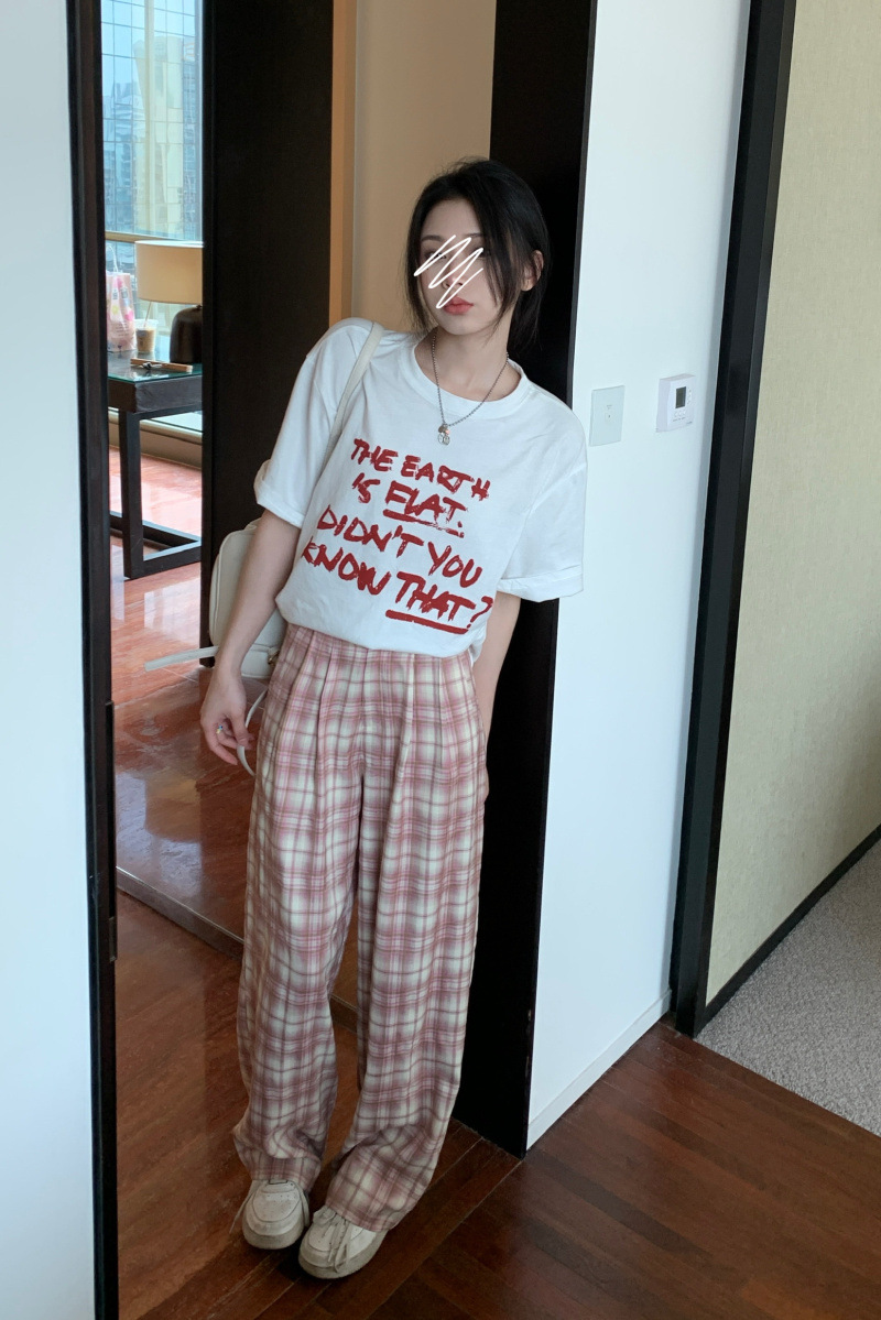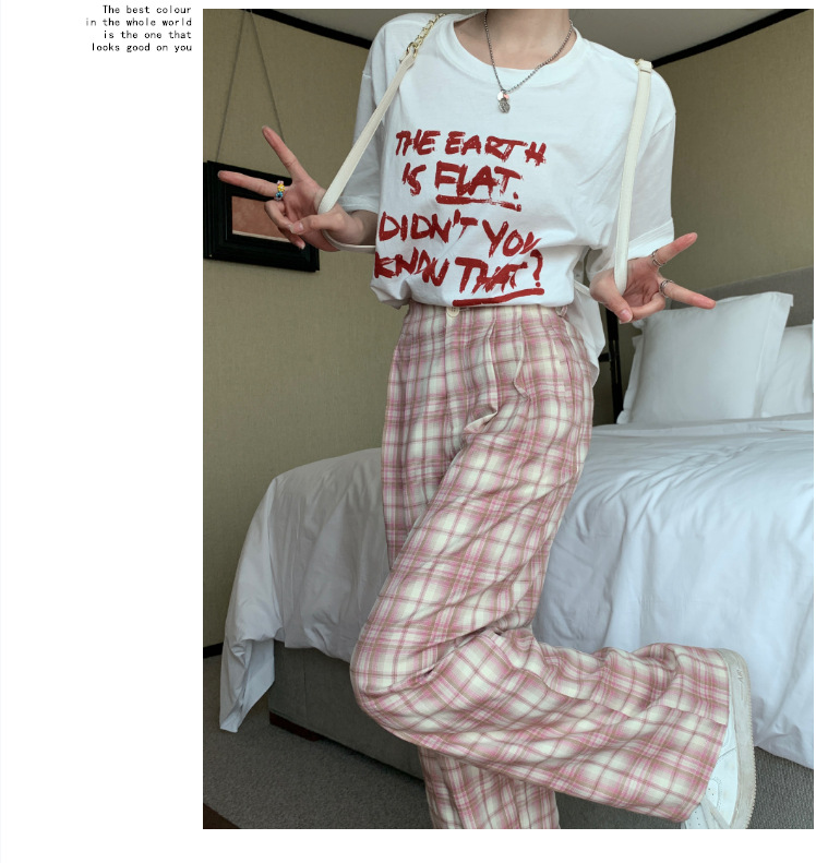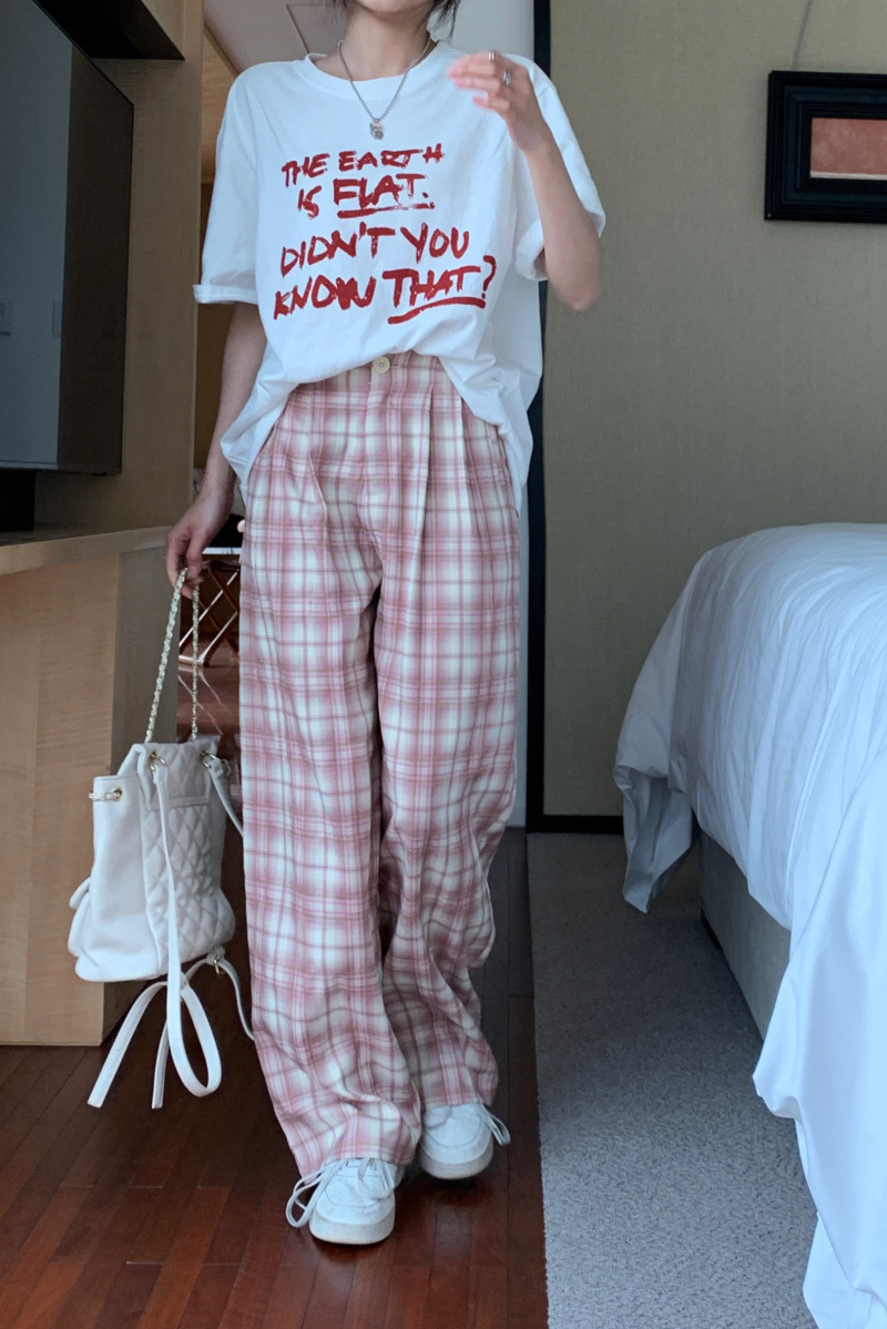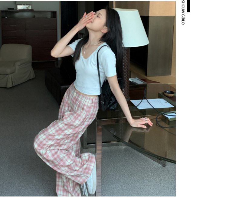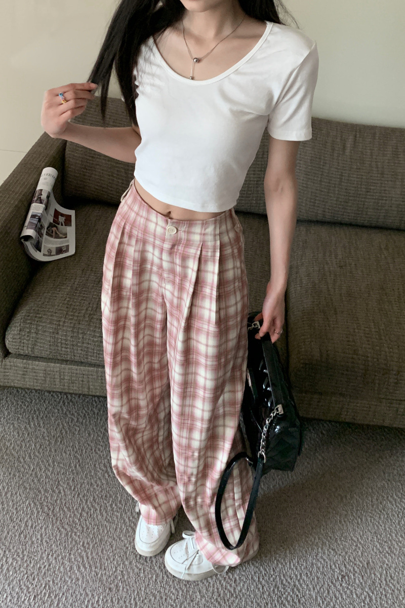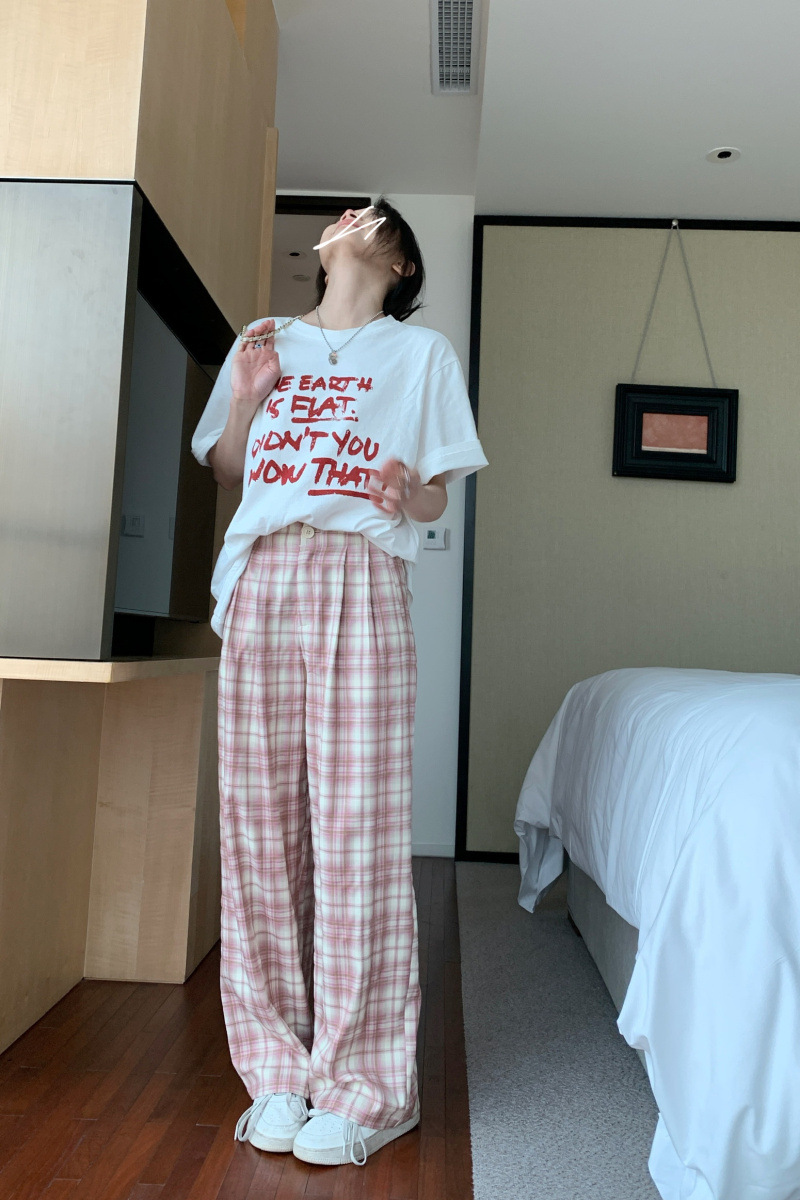 LXFS8296 粉色格子褲女款韓版高腰寬鬆休閒垂感拖地闊腿 褲
