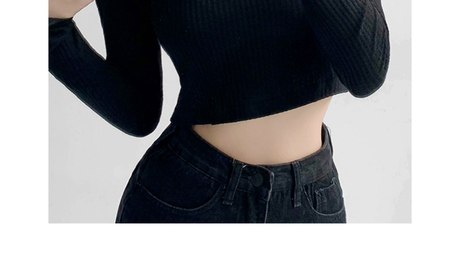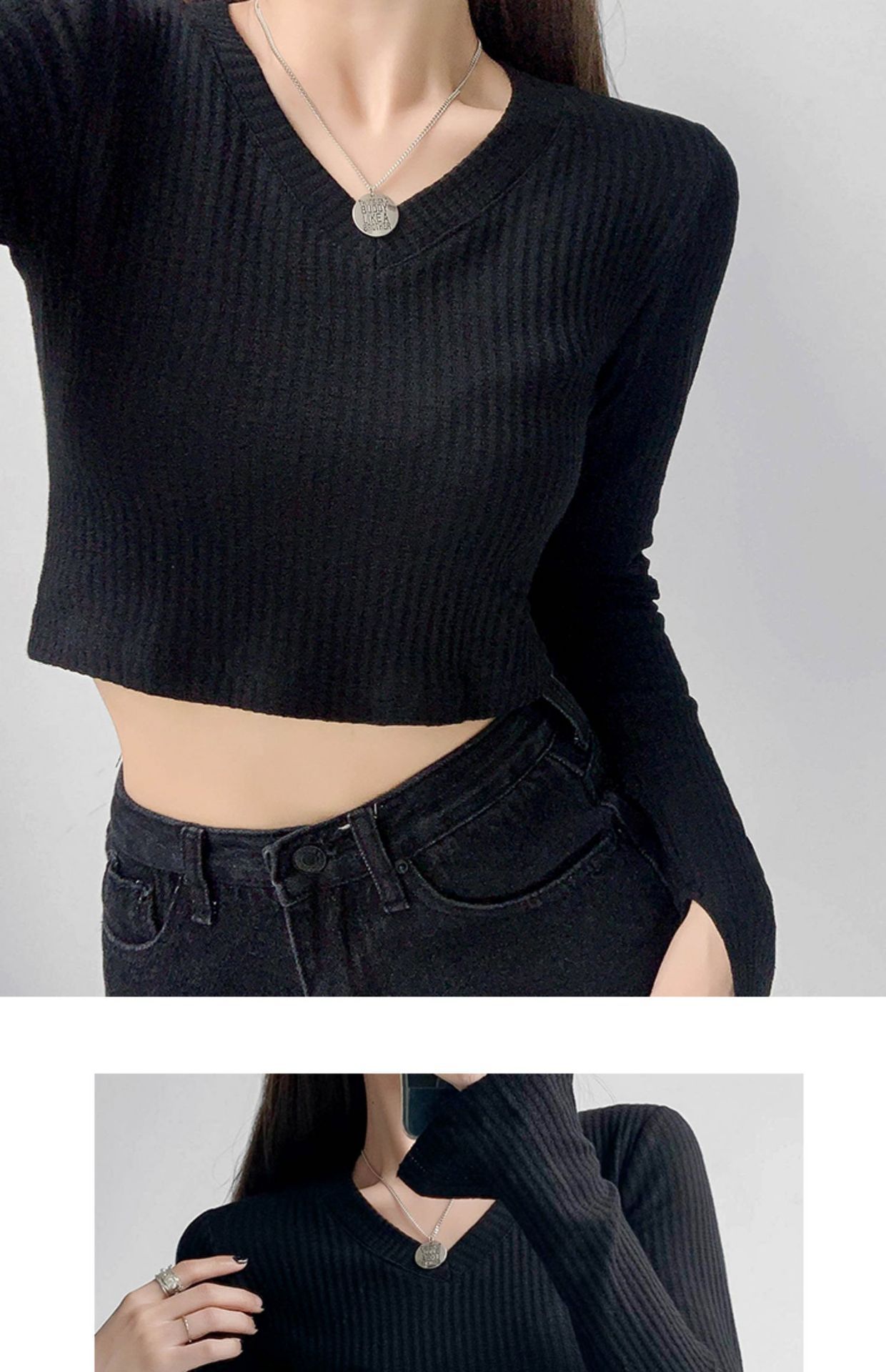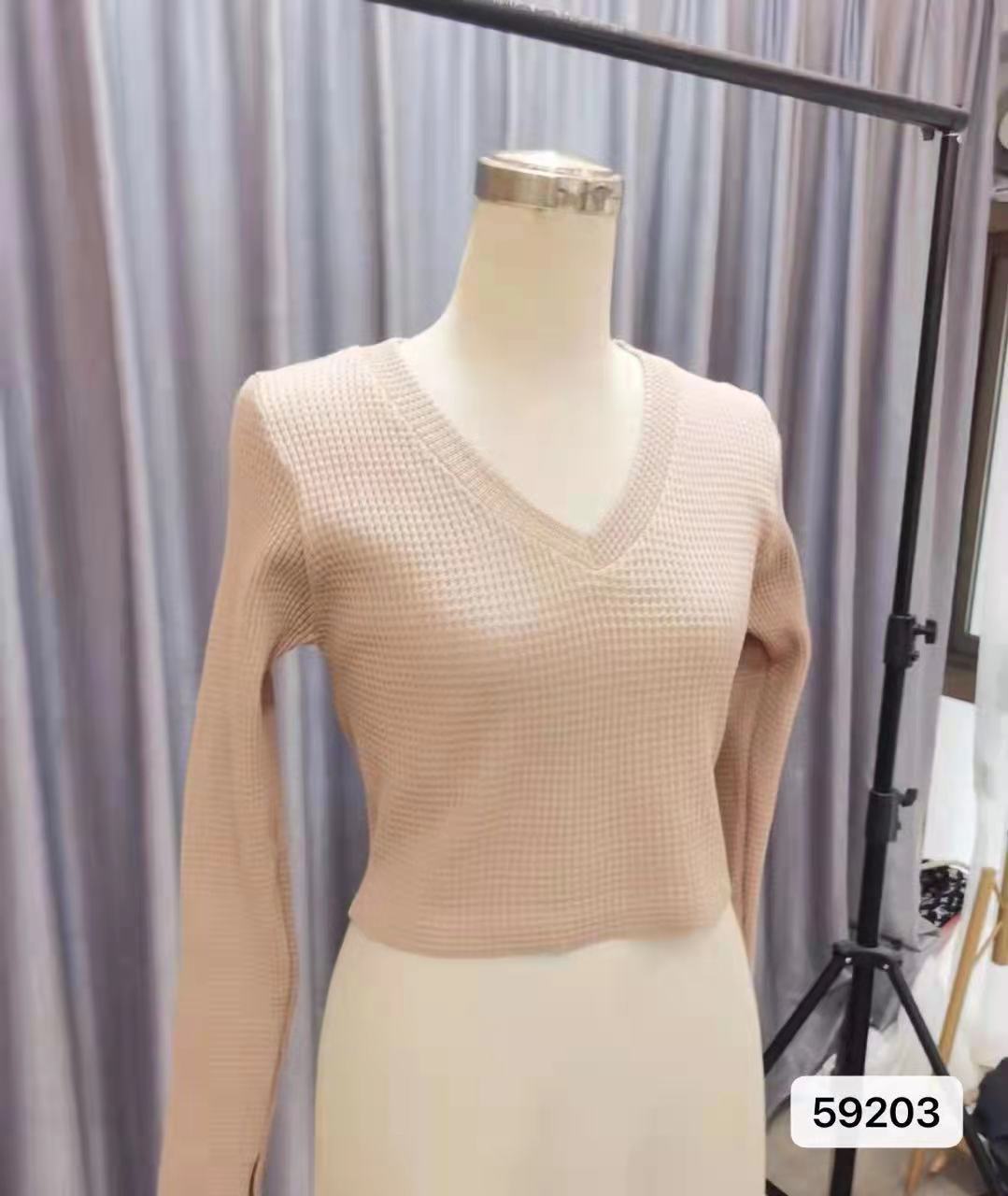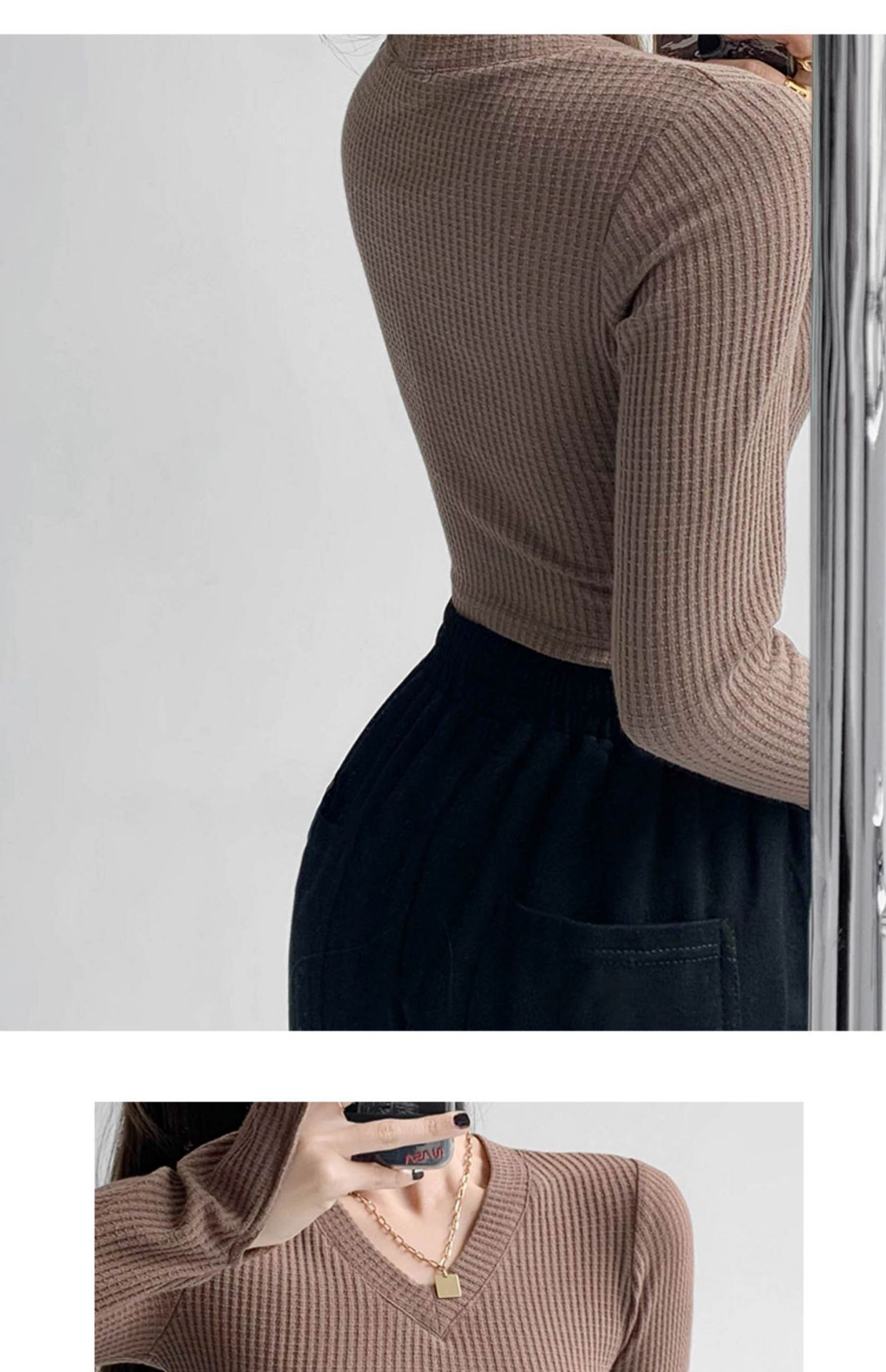 WBX-M002 春秋華夫格針織修身鎖骨V領顯瘦小心機露臍開叉袖口短款 上衣