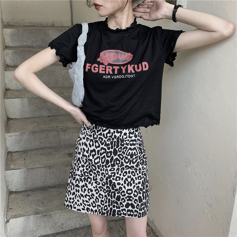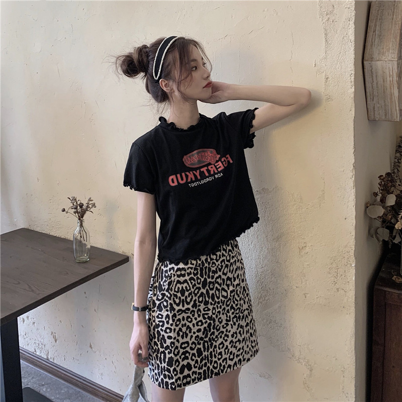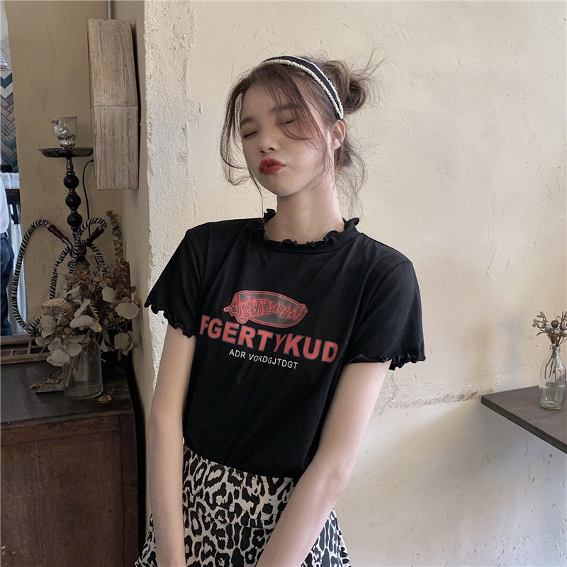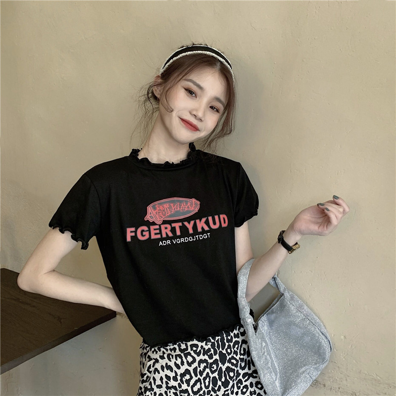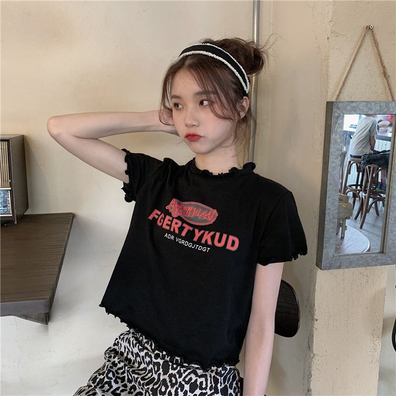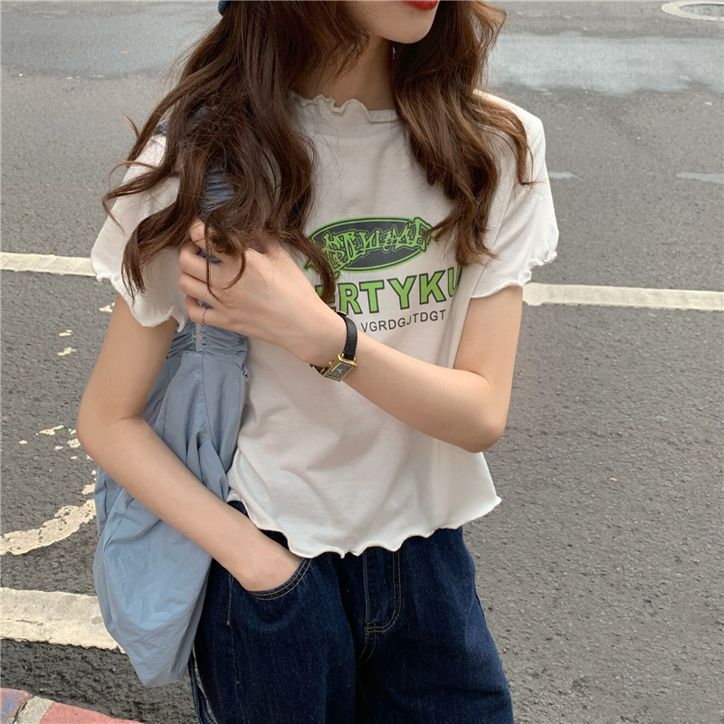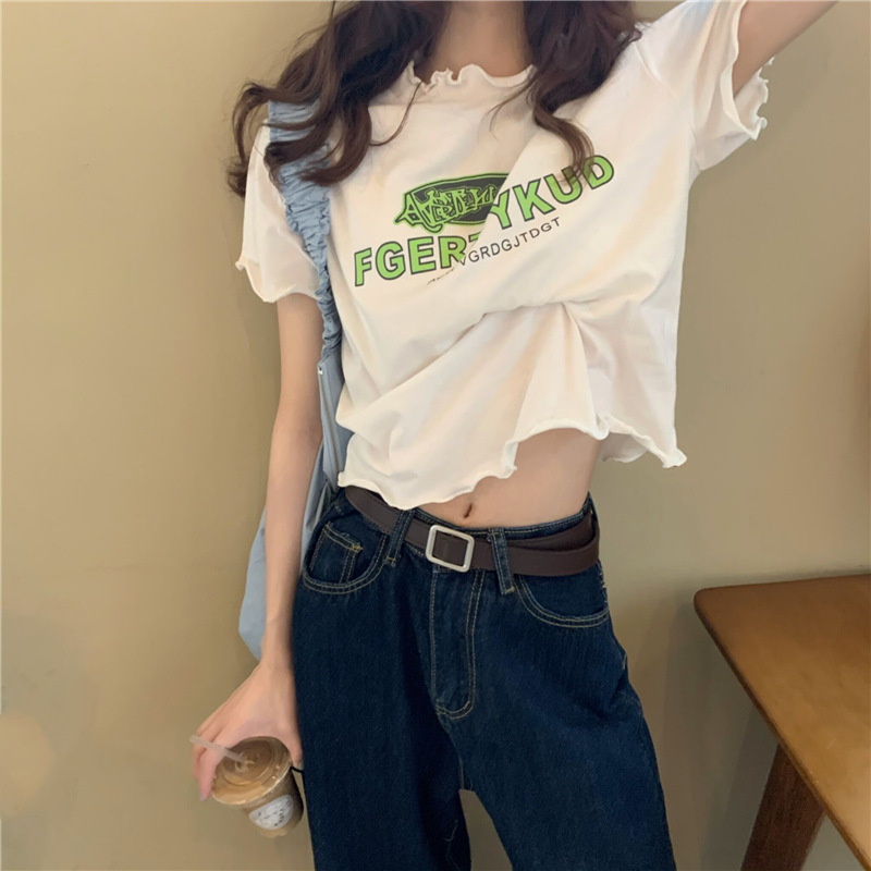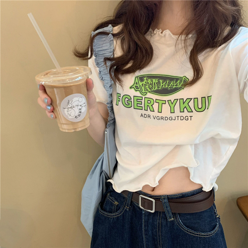 WBX-T0046 木耳邊短款設計感修身顯瘦小心機字母印花露臍短袖T 上衣