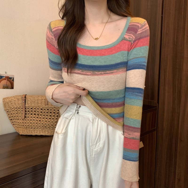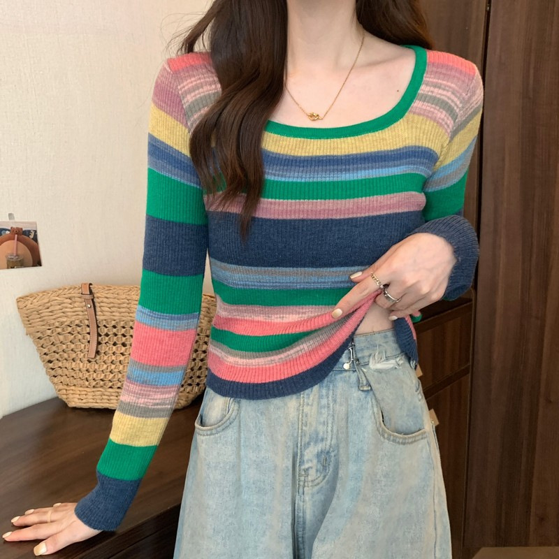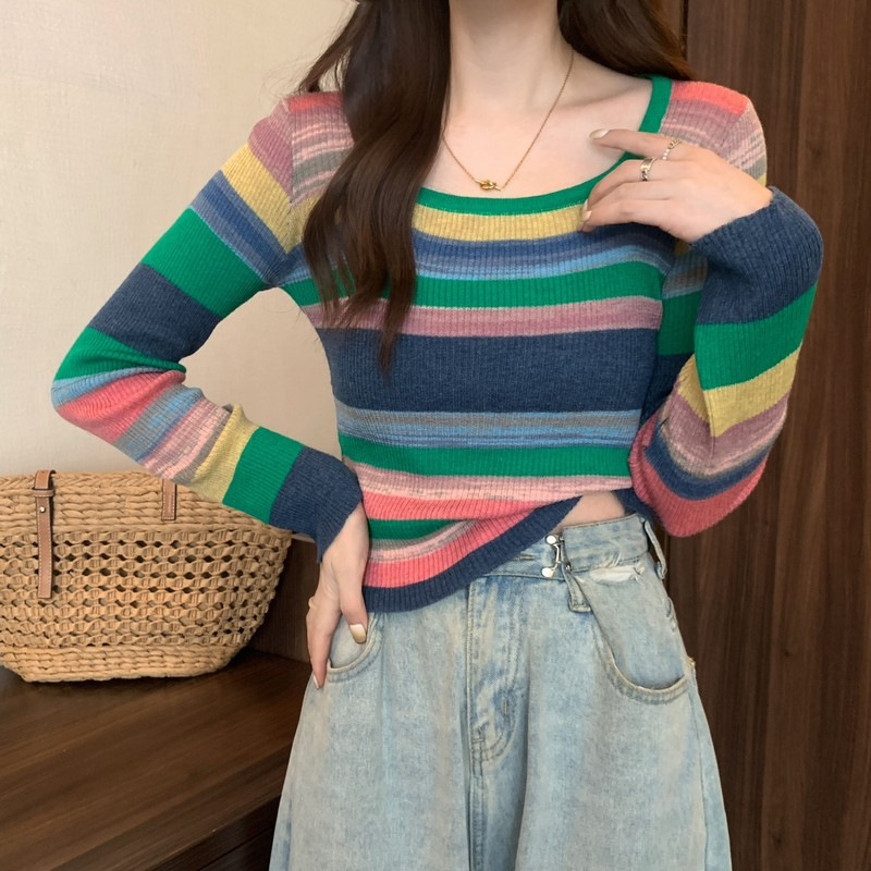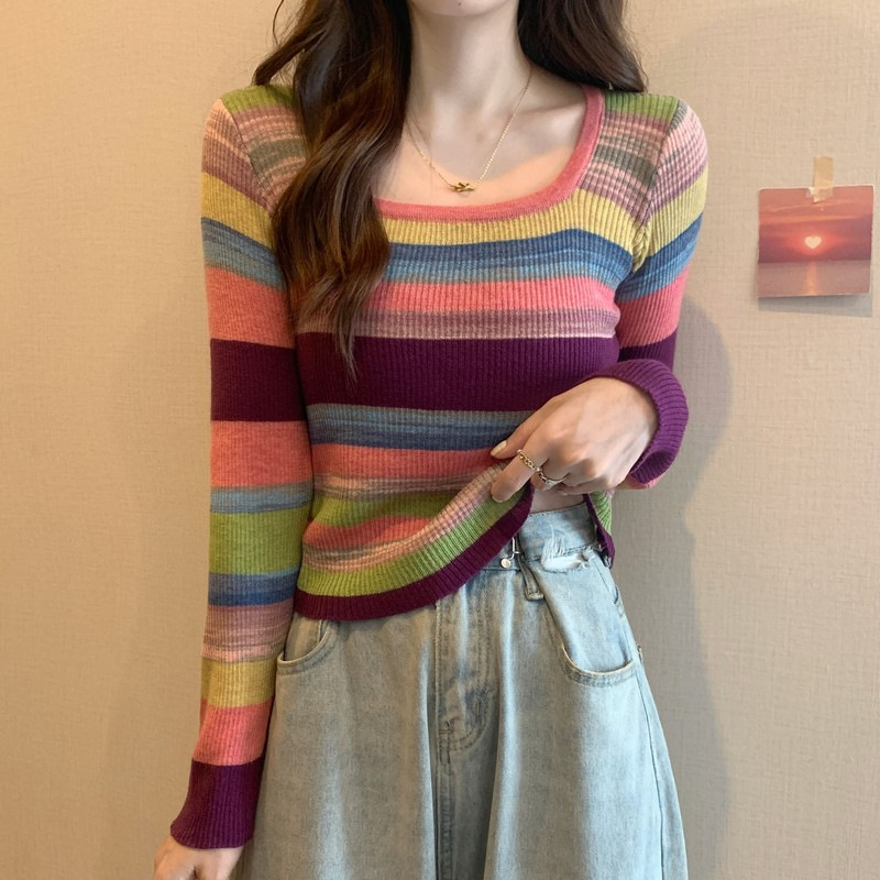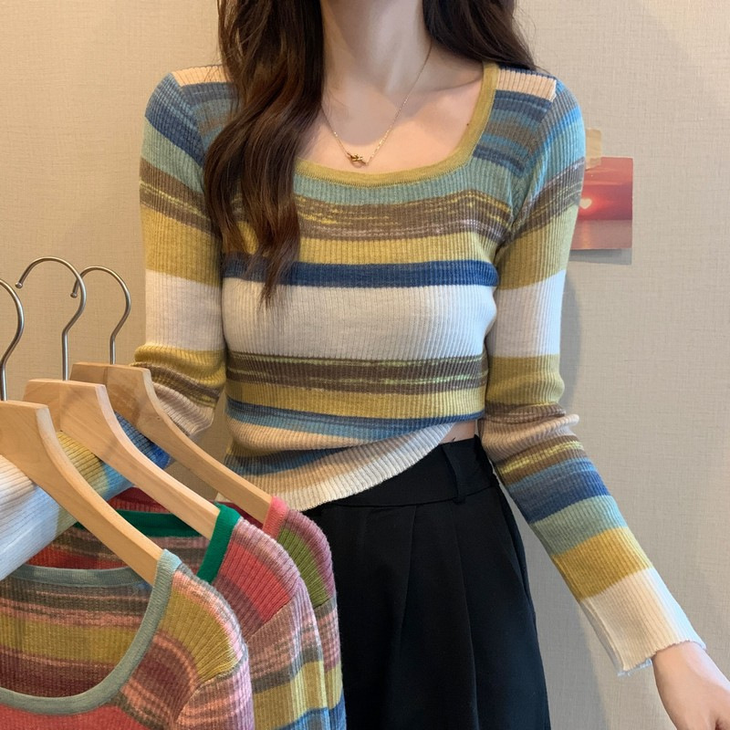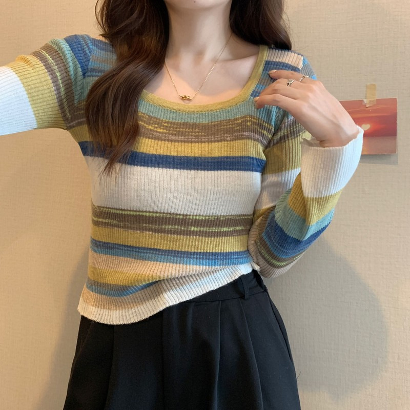 MNH-Z544 秋冬新款韓版甜辣風方領小眾撞色條紋針織衫修身顯瘦學生T 上衣
