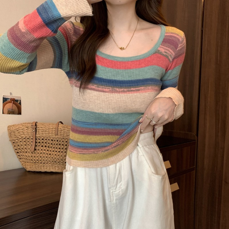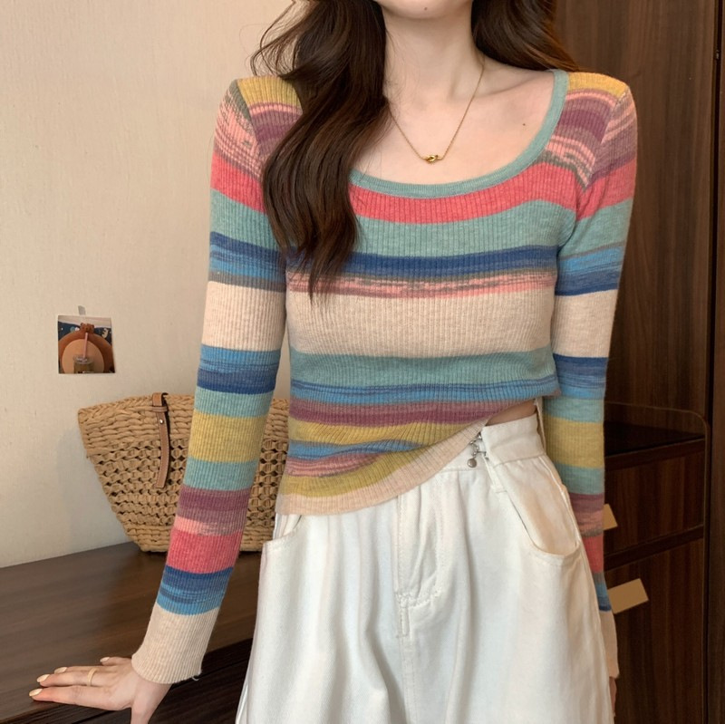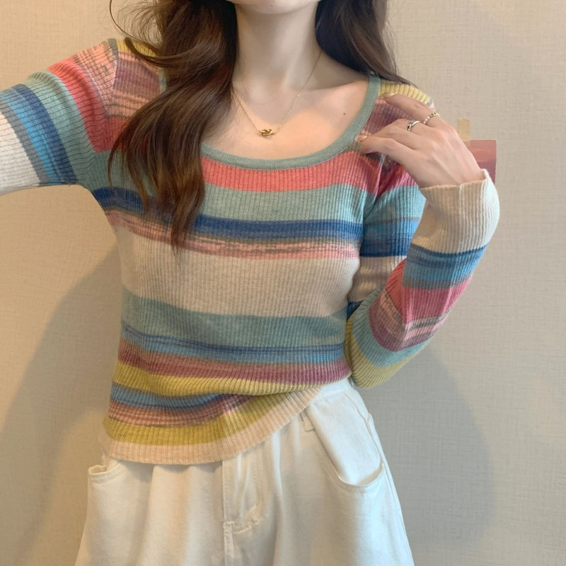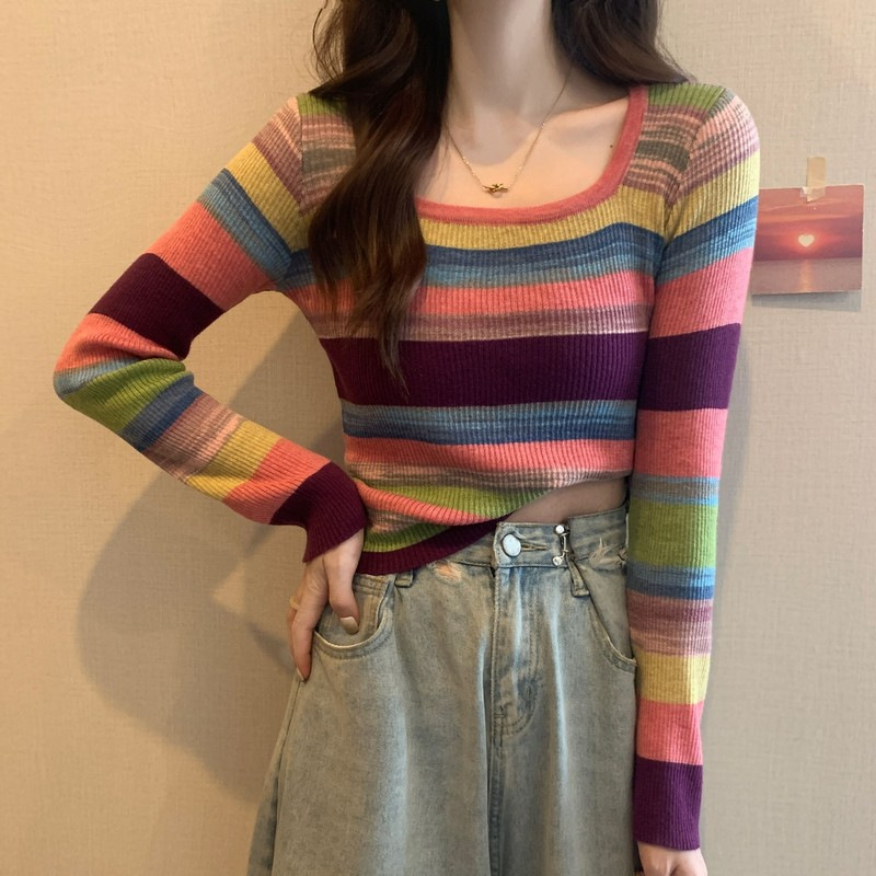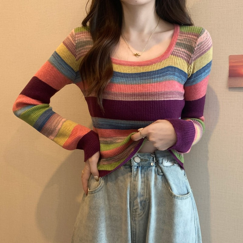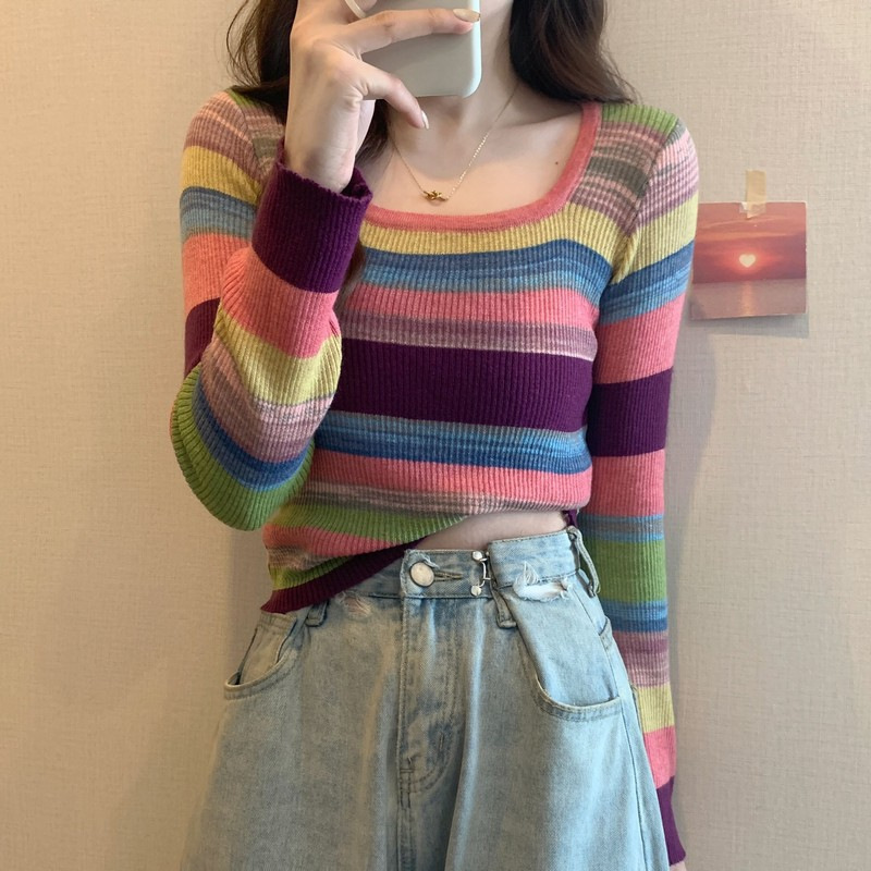 MNH-Z544 秋冬新款韓版甜辣風方領小眾撞色條紋針織衫修身顯瘦學生T 上衣