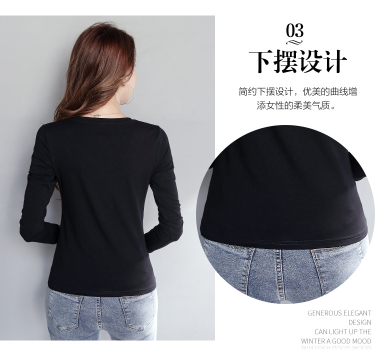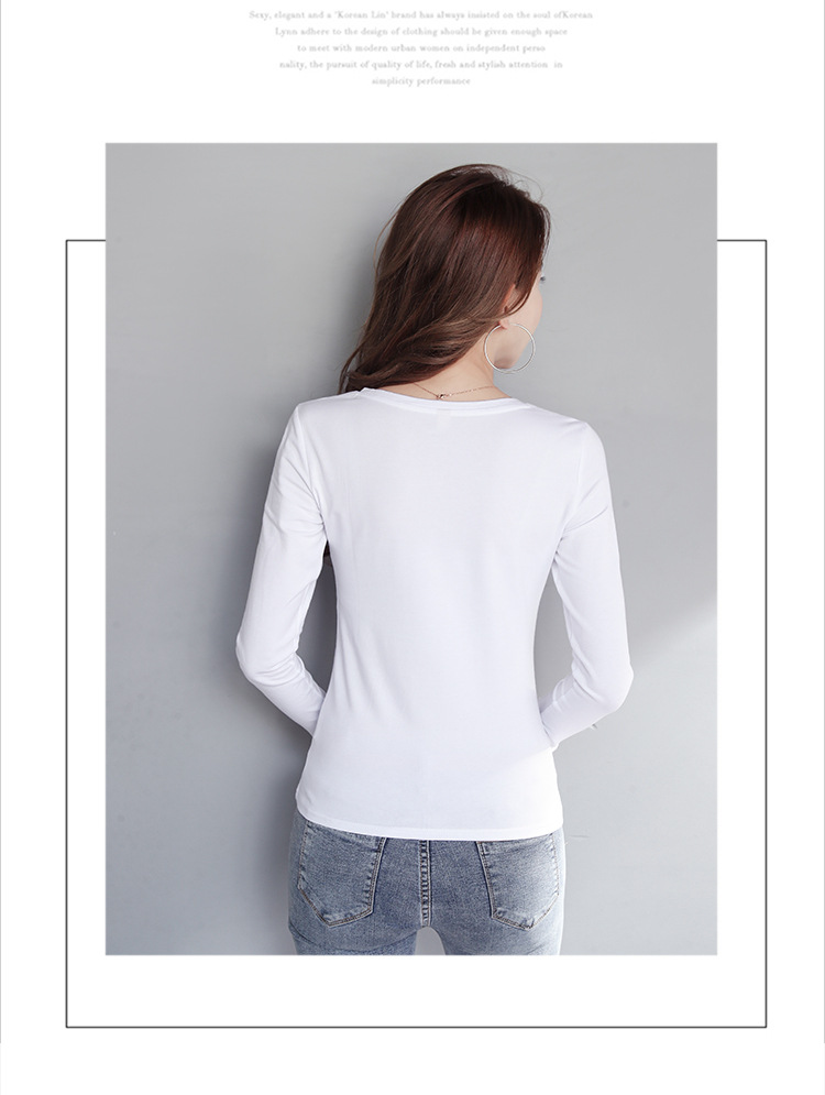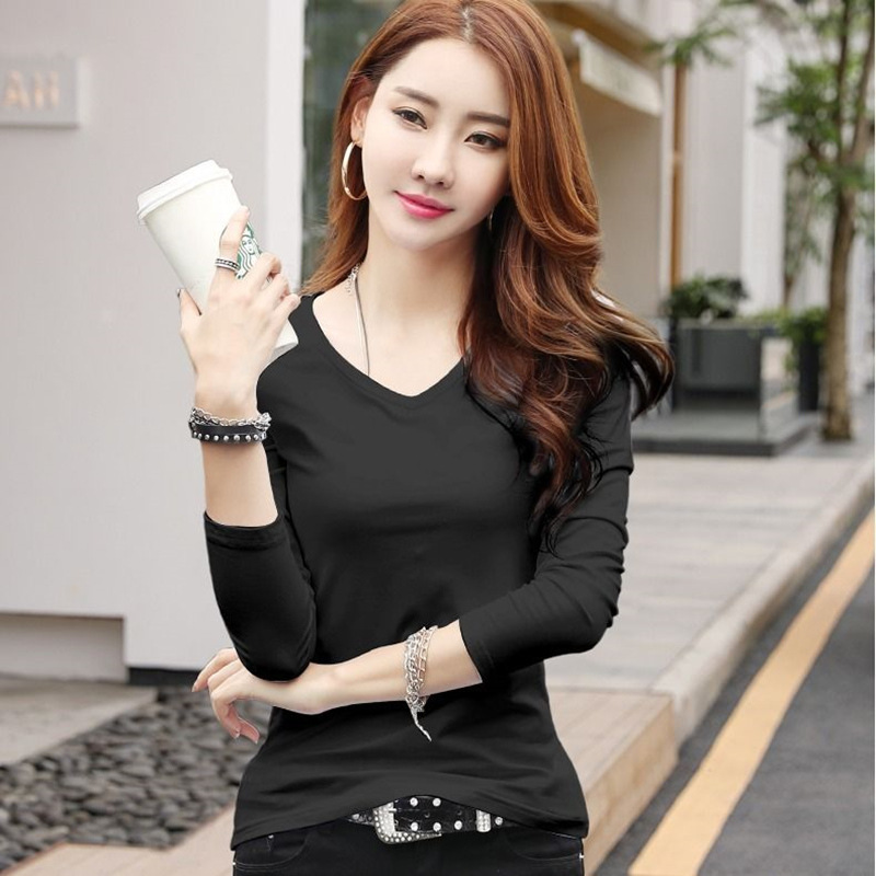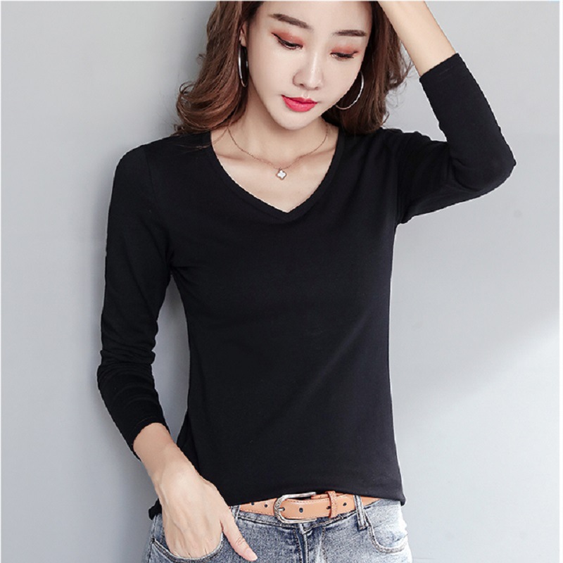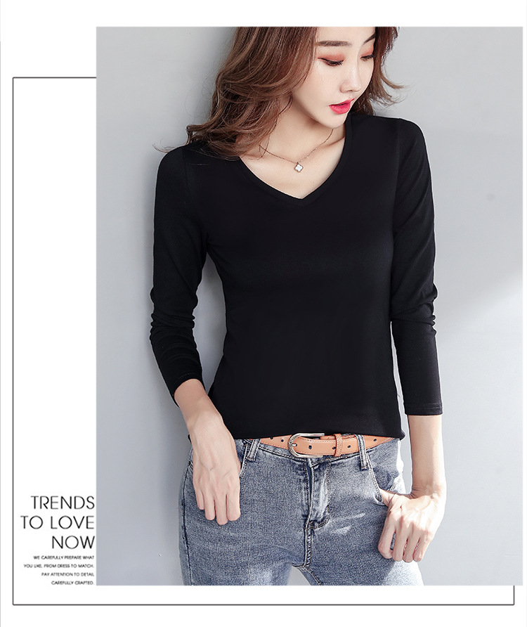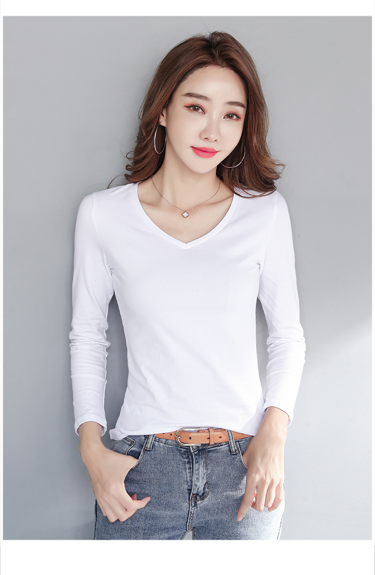WBX-C34 韓版薄款修身長袖T女簡約純色V領打底衫女休閒 上衣