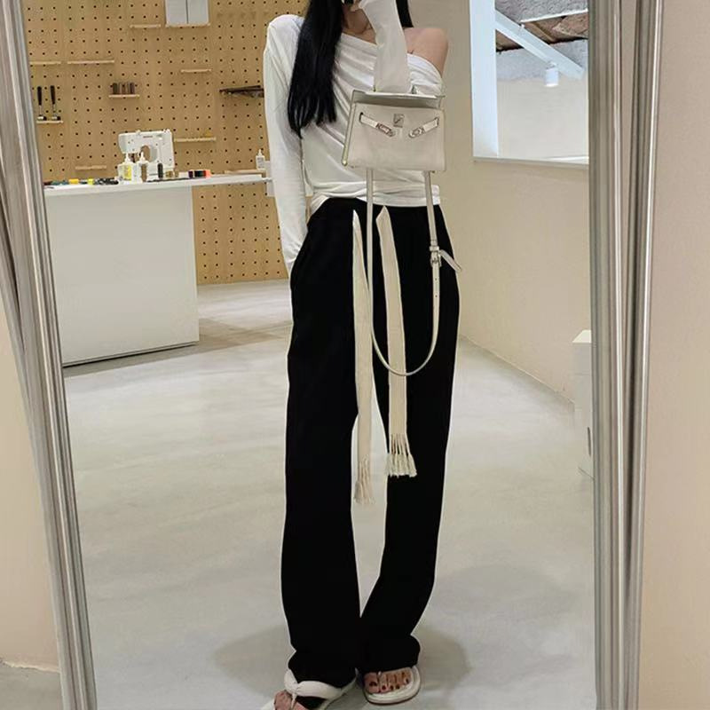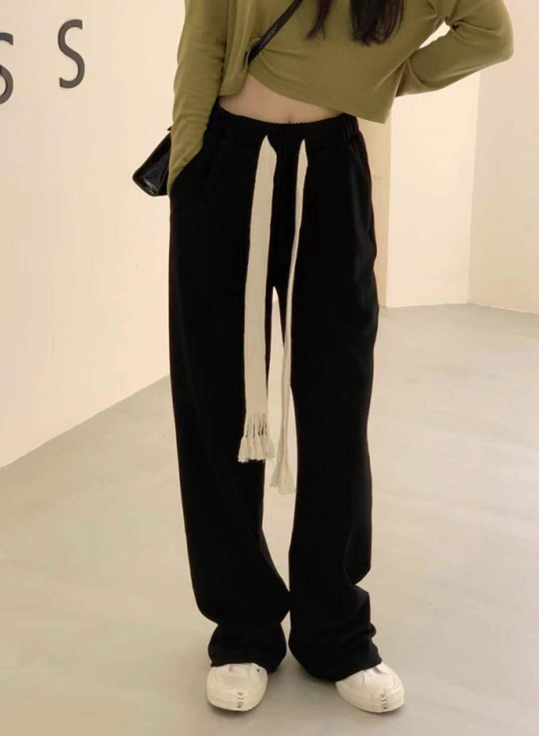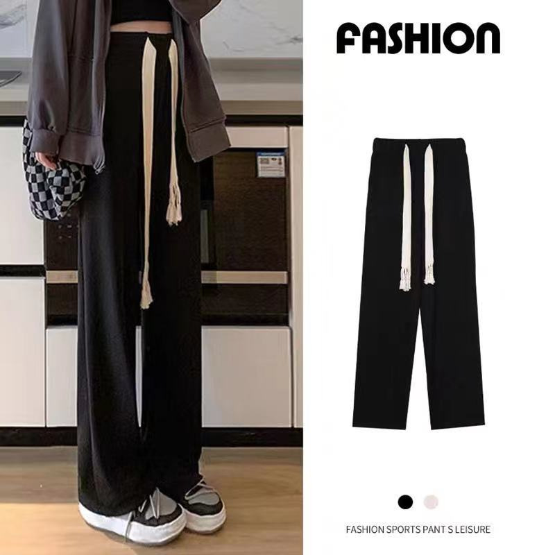 WBX-QJ24 女學生春寬鬆顯瘦高腰手工編織抽繩休閒拖地褲米尼面料黑色闊腿 褲