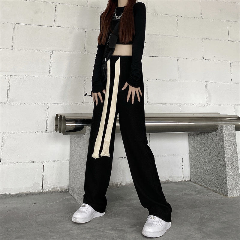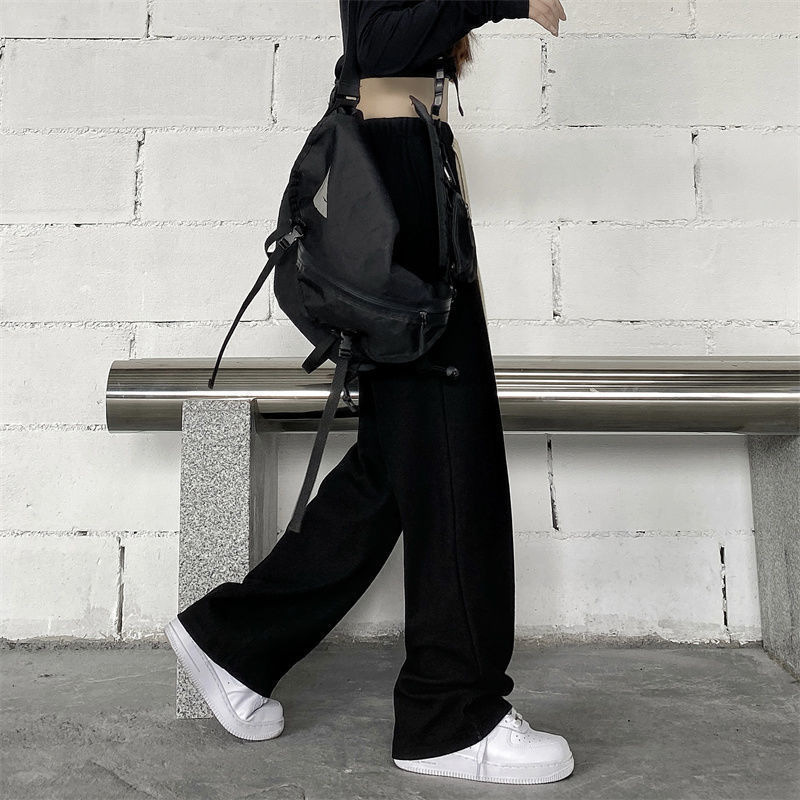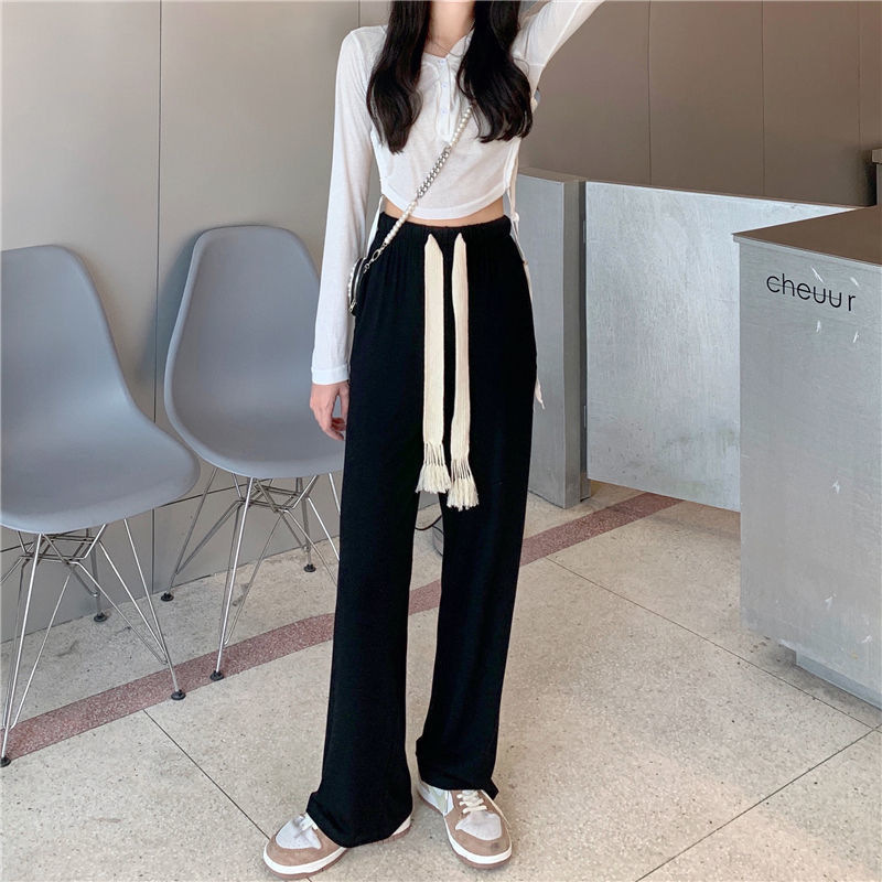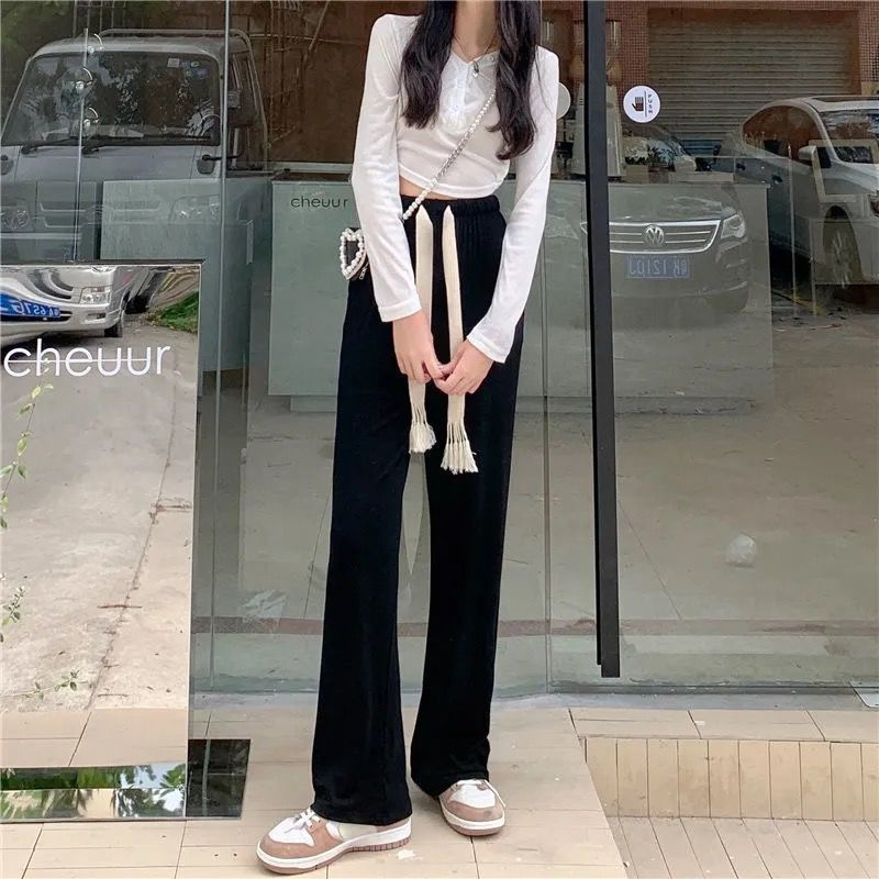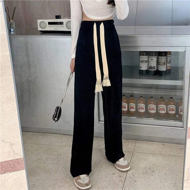WBX-QJ24 冬薄款米尼拖地褲子寬鬆高腰休閒長褲三股辮腰繩黑色闊腿 褲