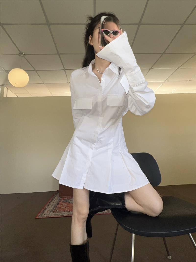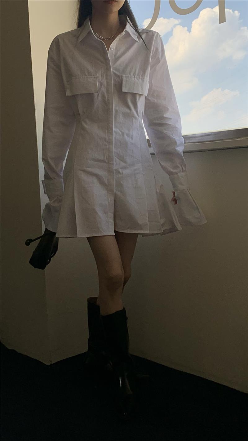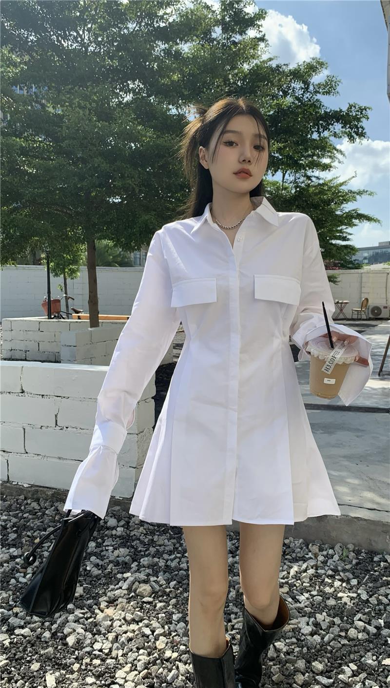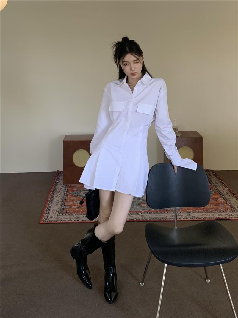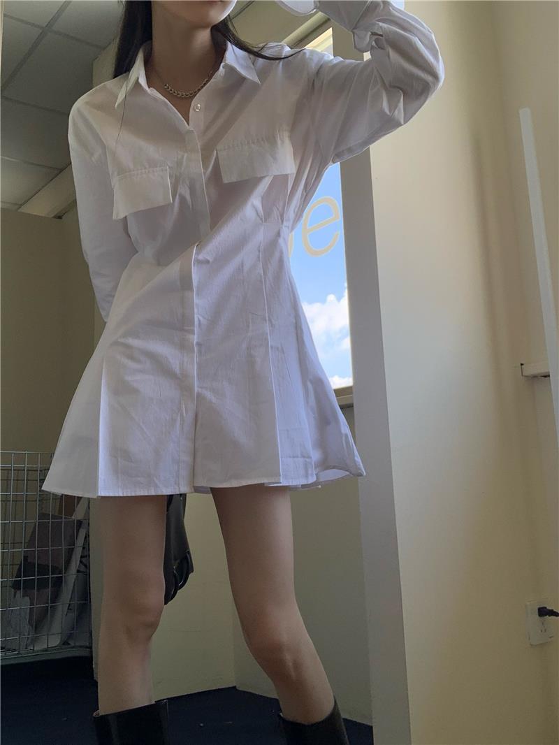 JMA-017 实拍 秋季新款韩版百搭设计感收腰翻领长袖白色衬衫裙连衣裙