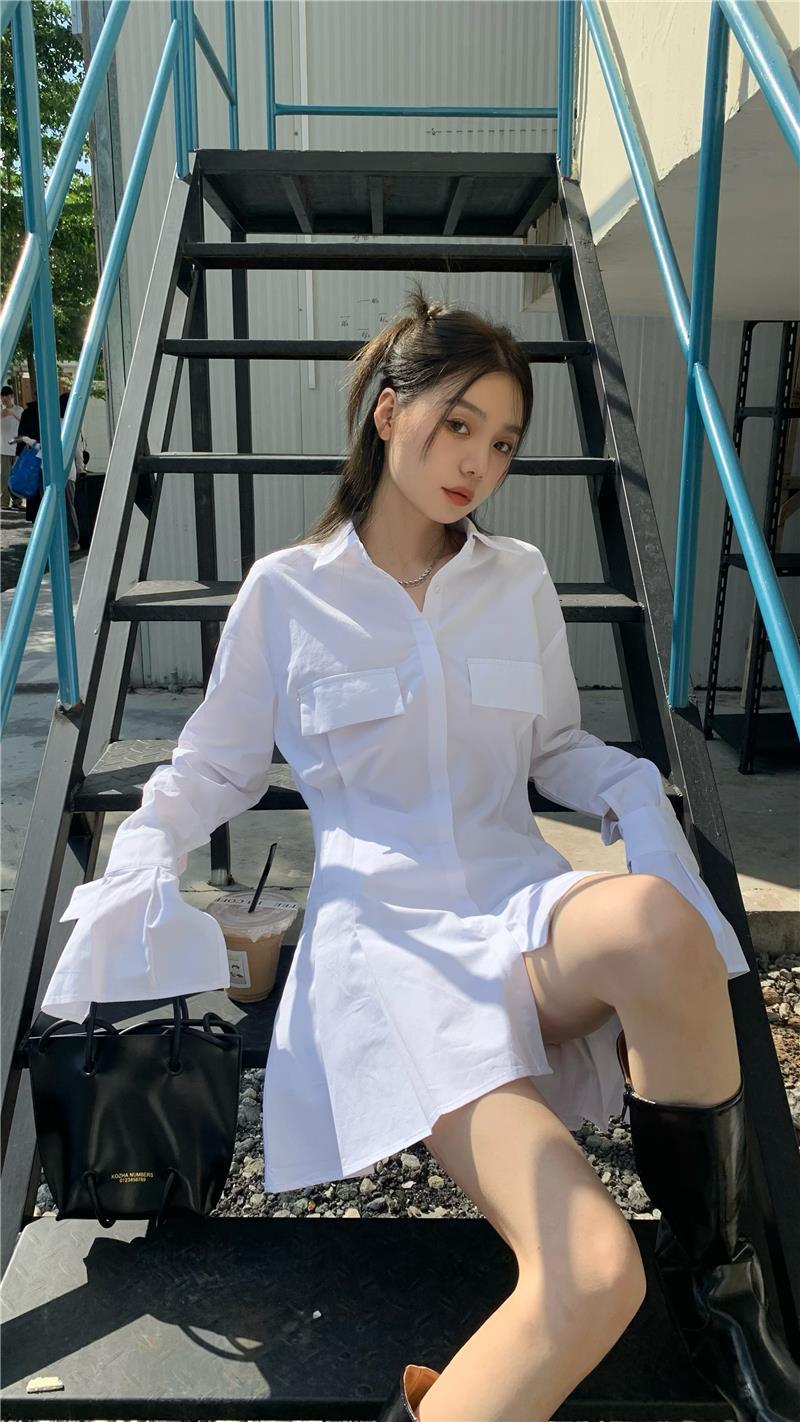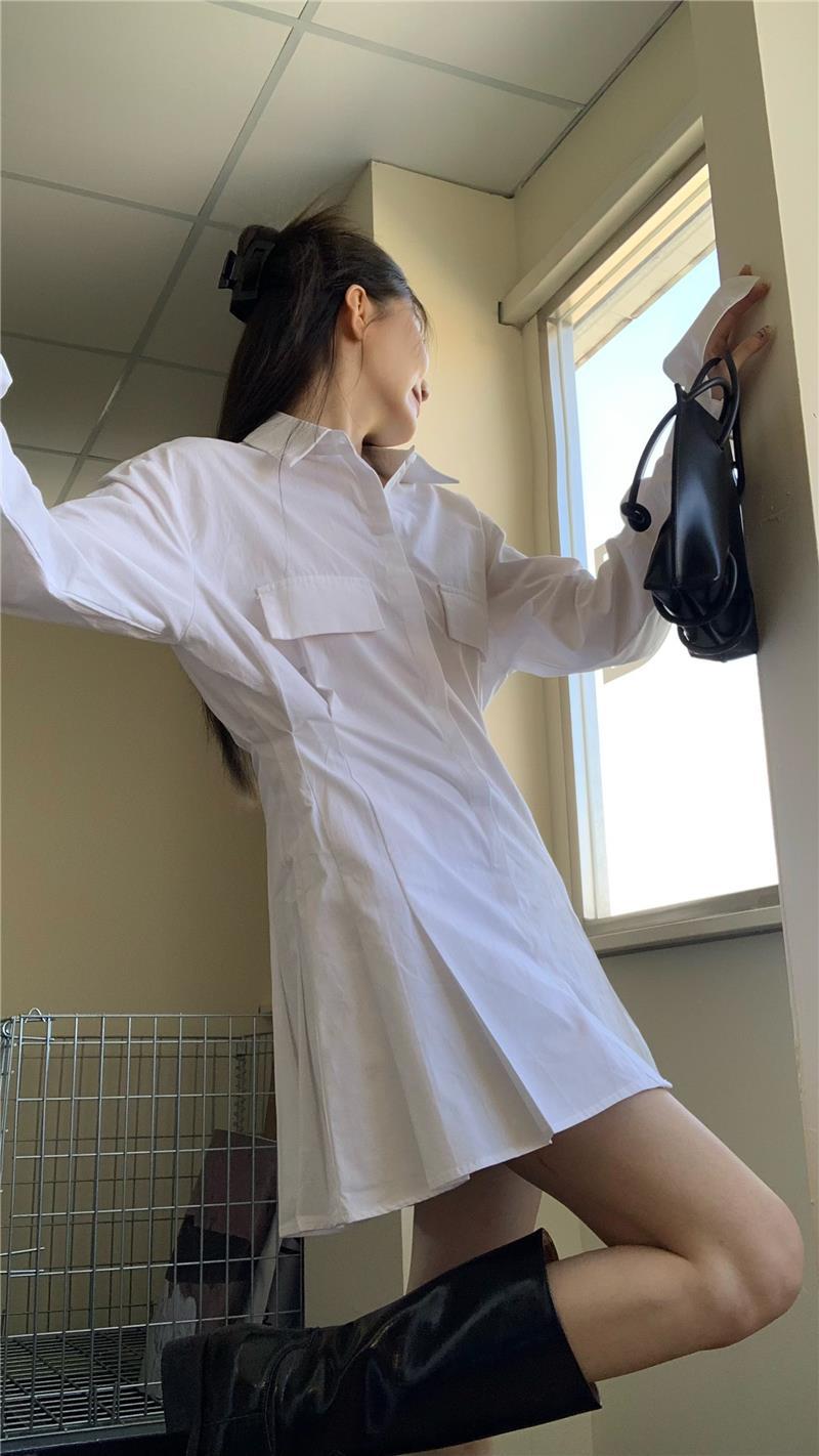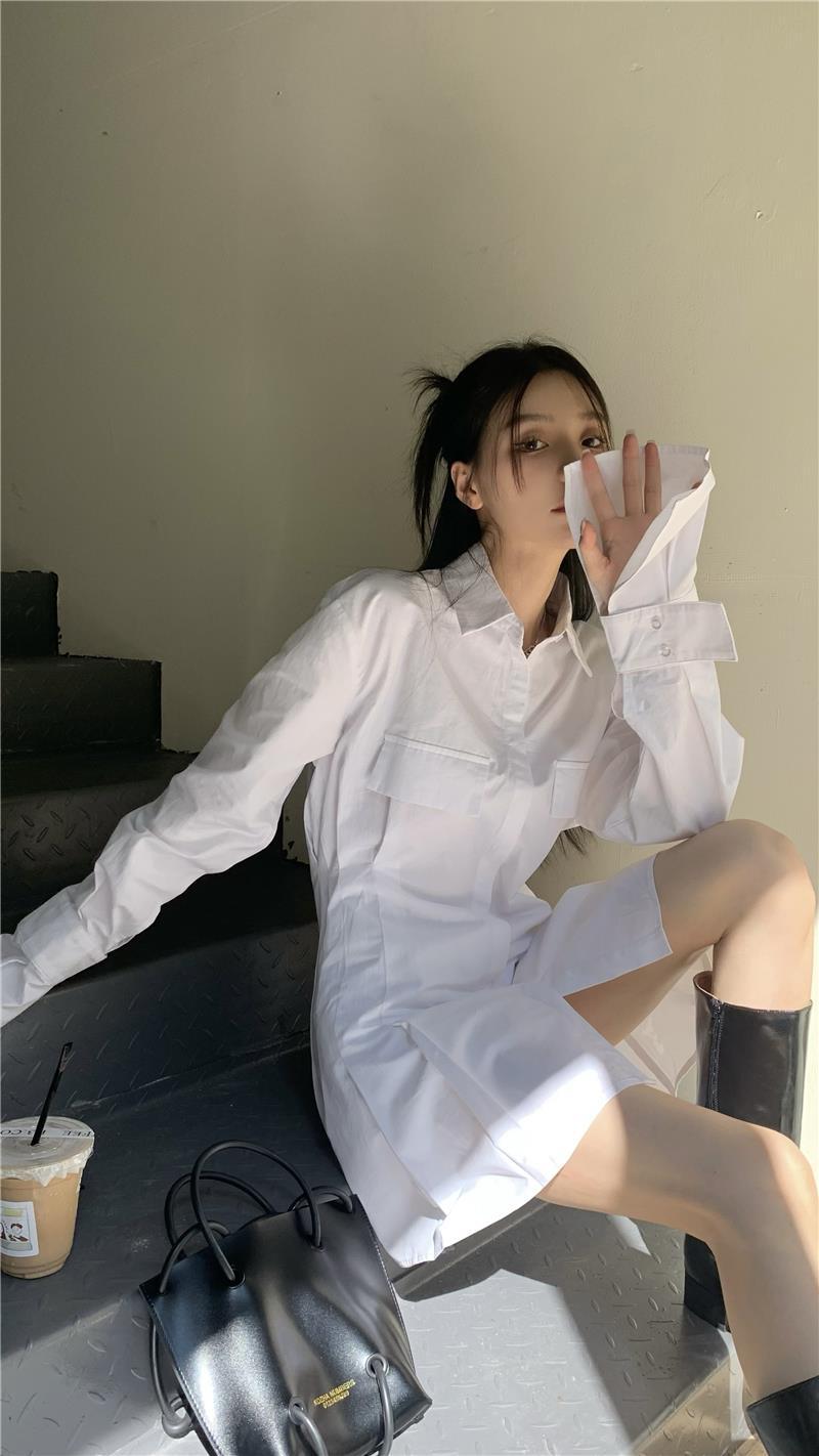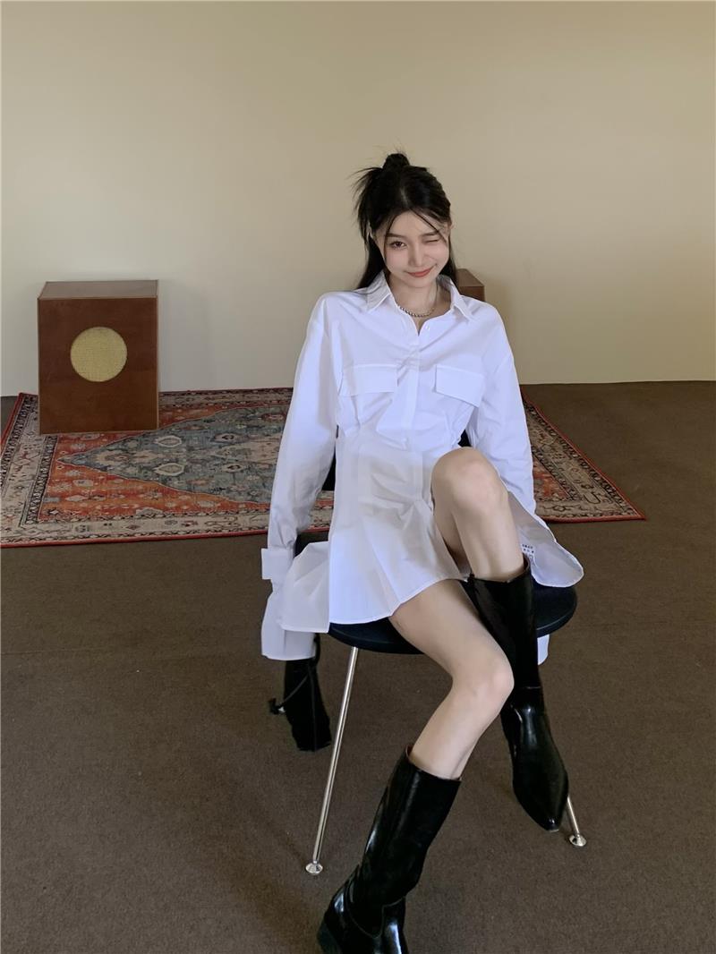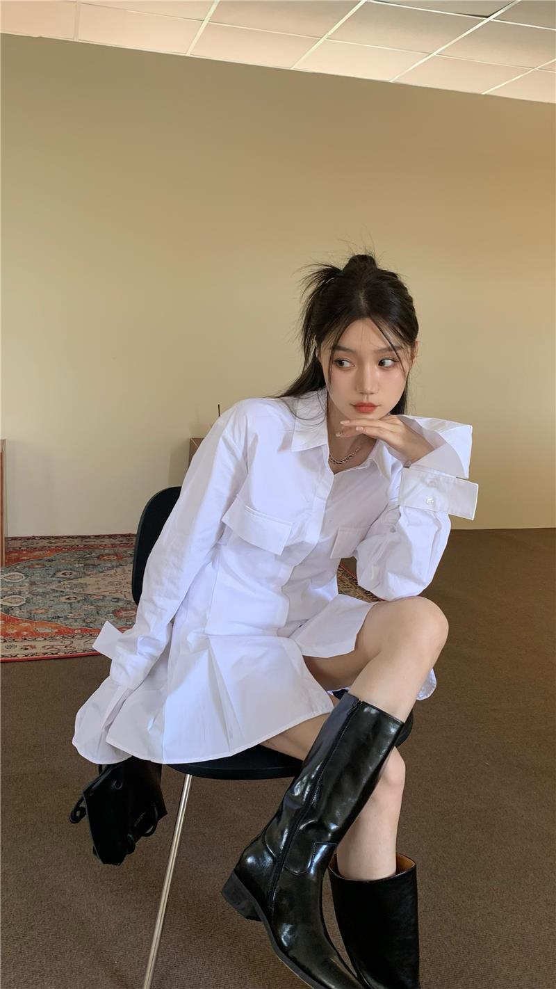 JMA-017 实拍 秋季新款韩版百搭设计感收腰翻领长袖白色衬衫裙连衣裙