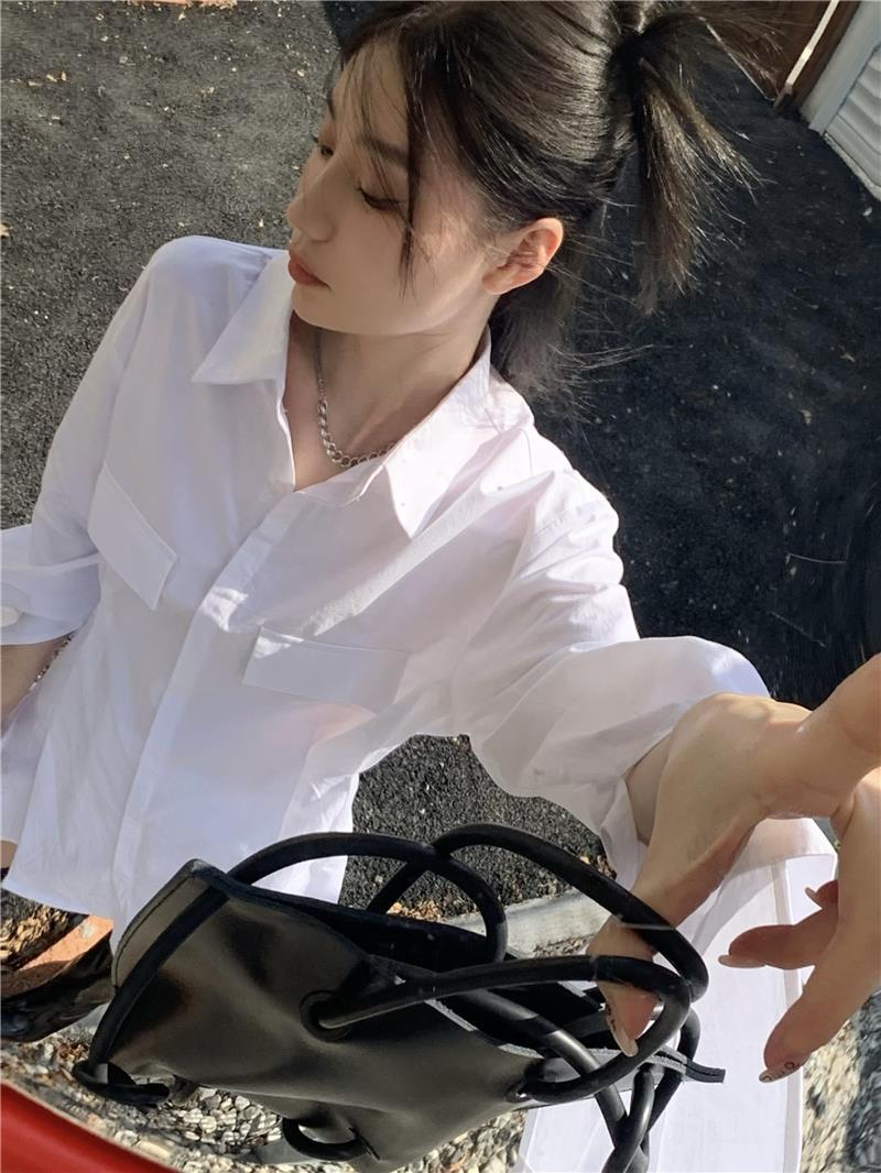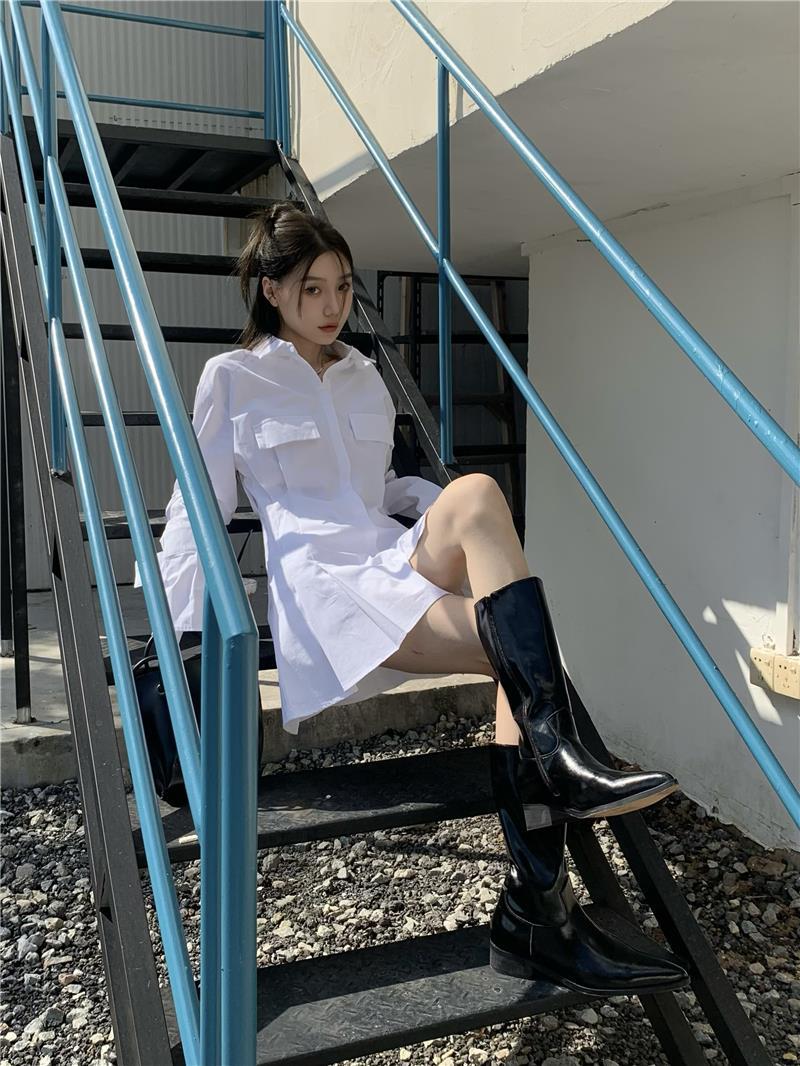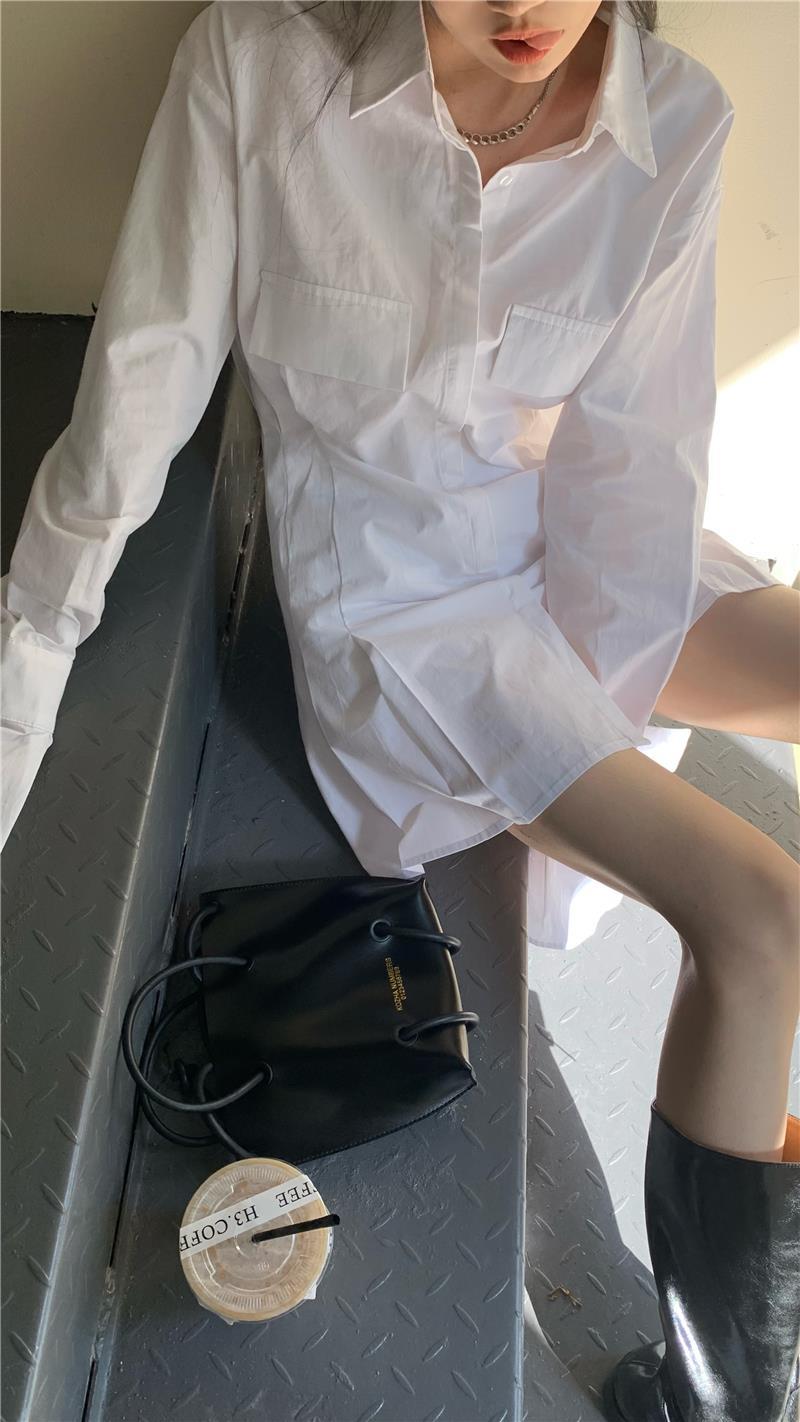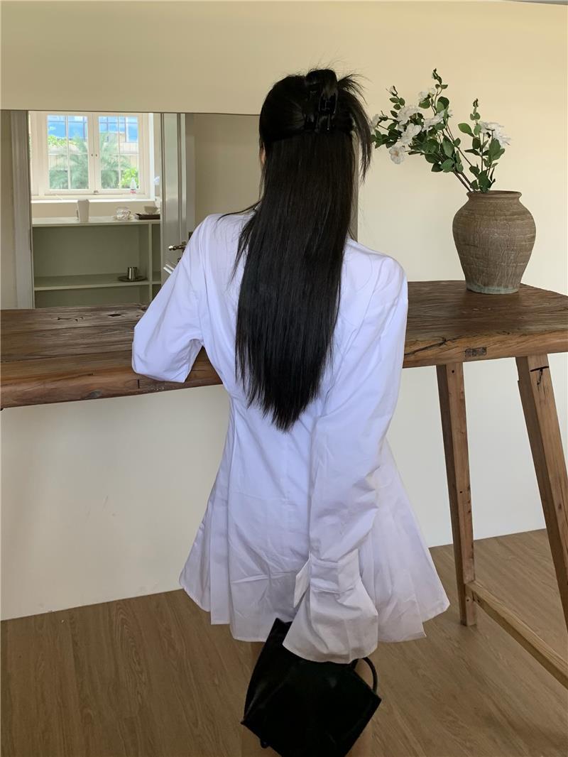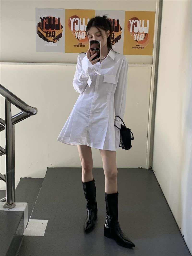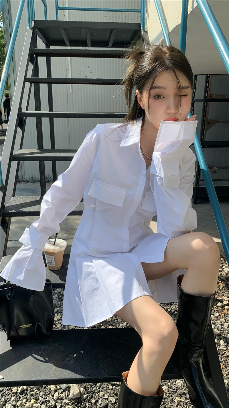 JMA-017 实拍 秋季新款韩版百搭设计感收腰翻领长袖白色衬衫裙连衣裙
