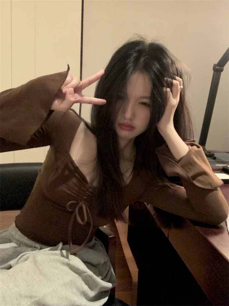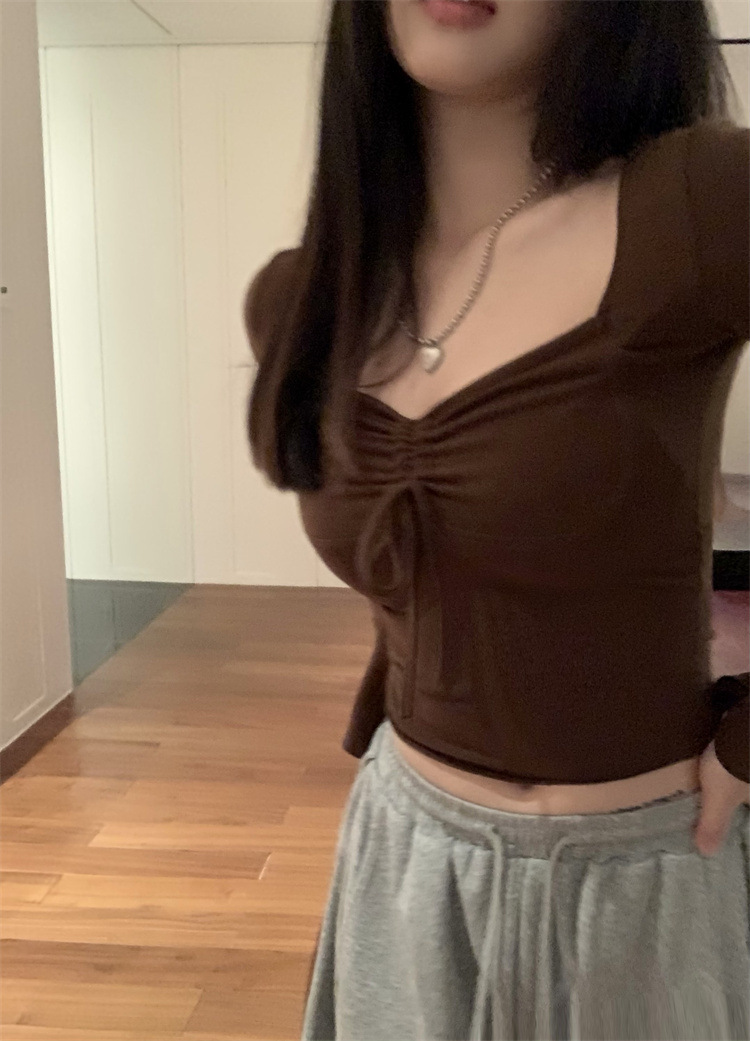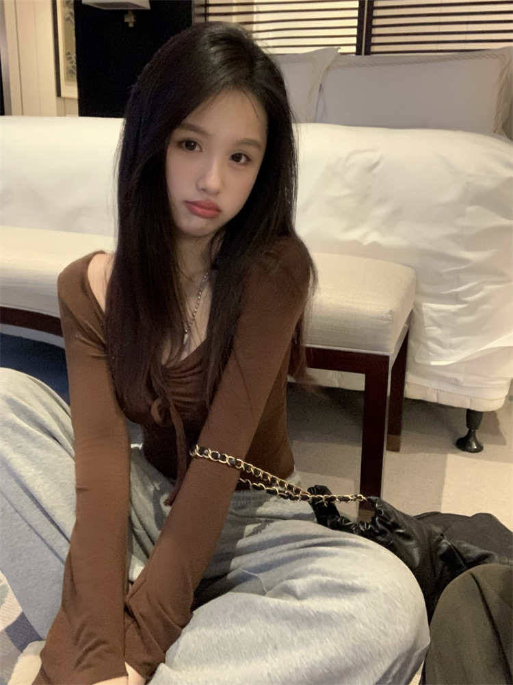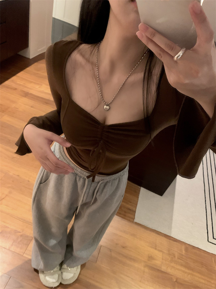 JMA-018 实拍 纯欲风粉色长袖小众打底衫女春季设计感抽绳T恤短款上衣