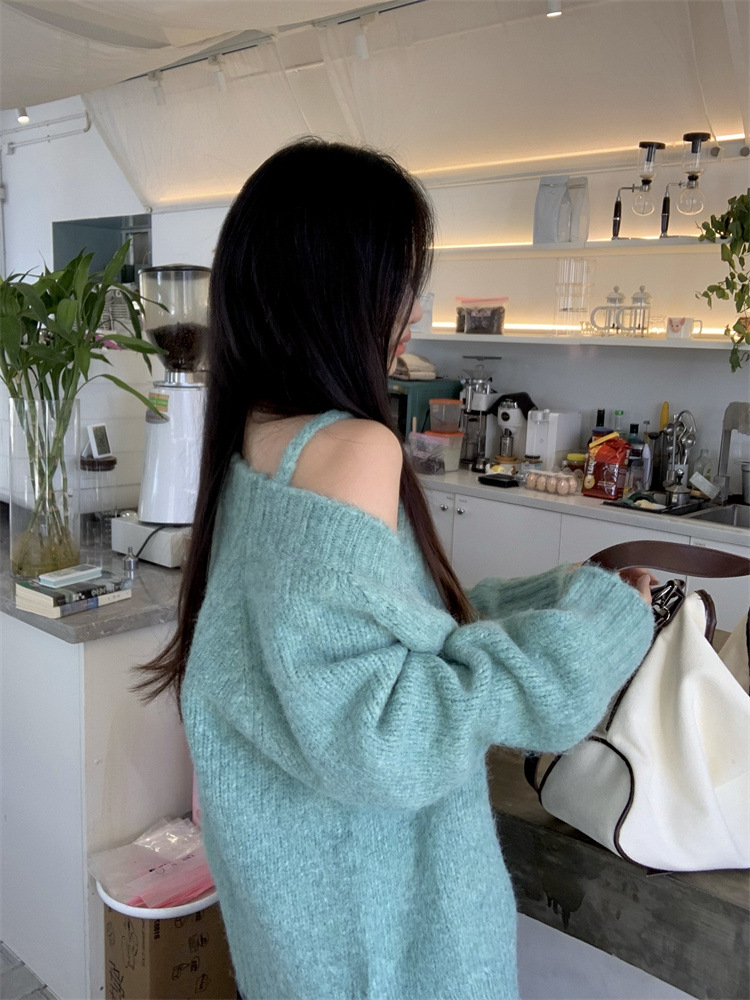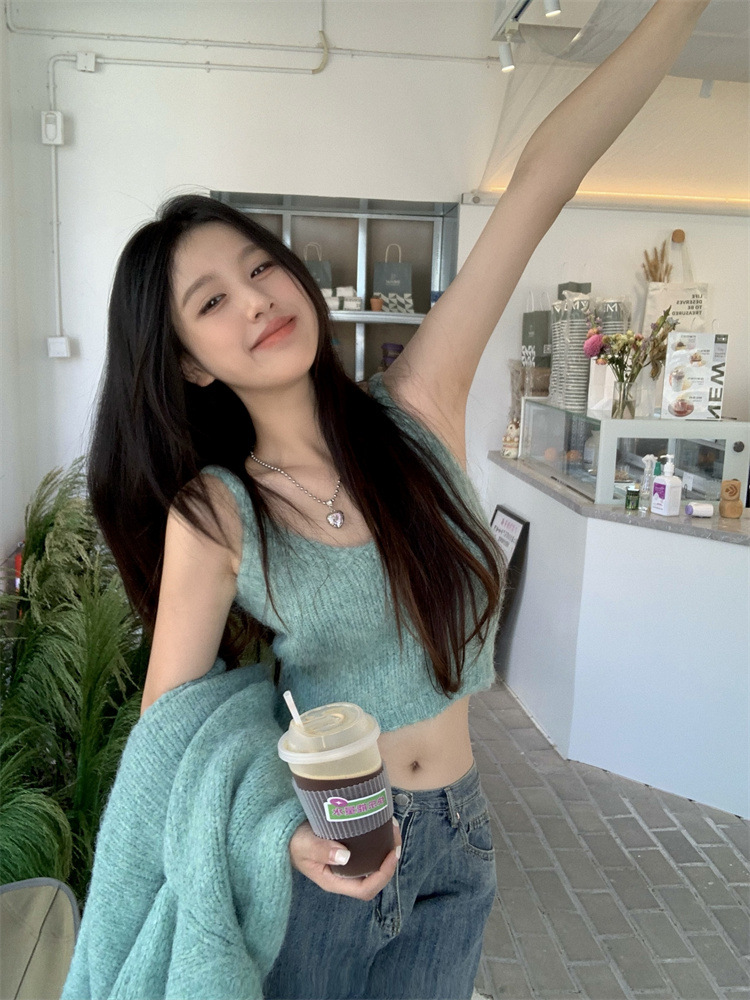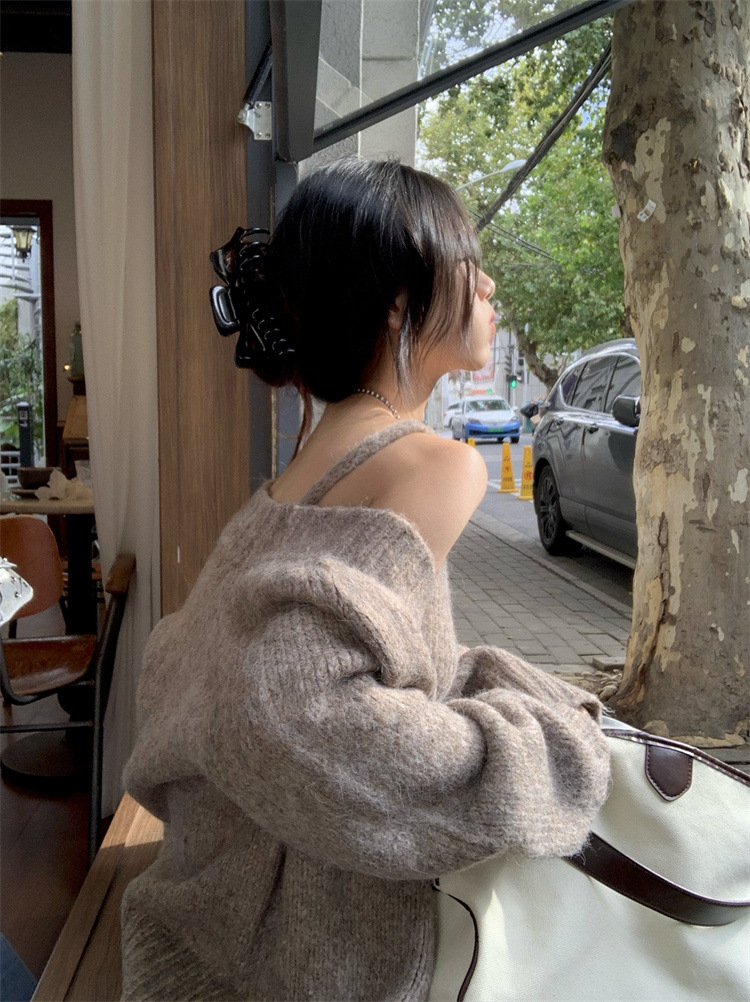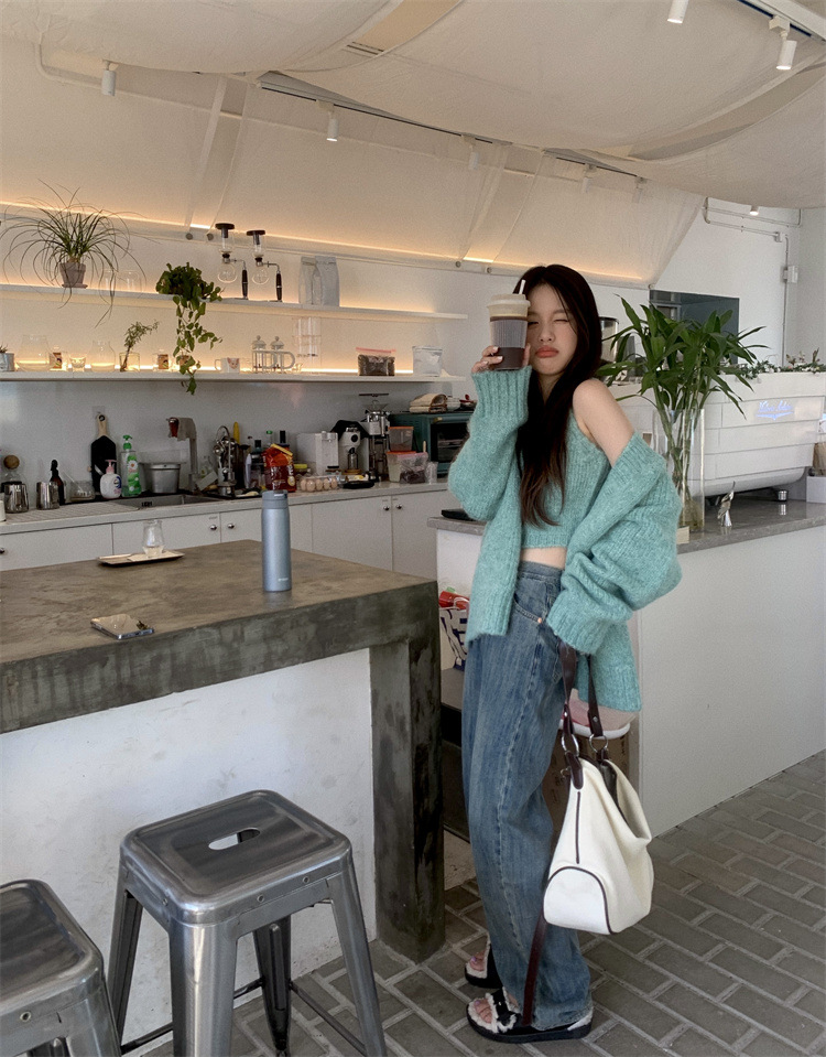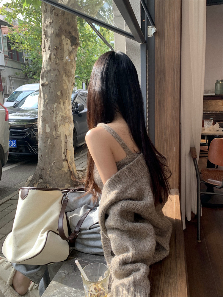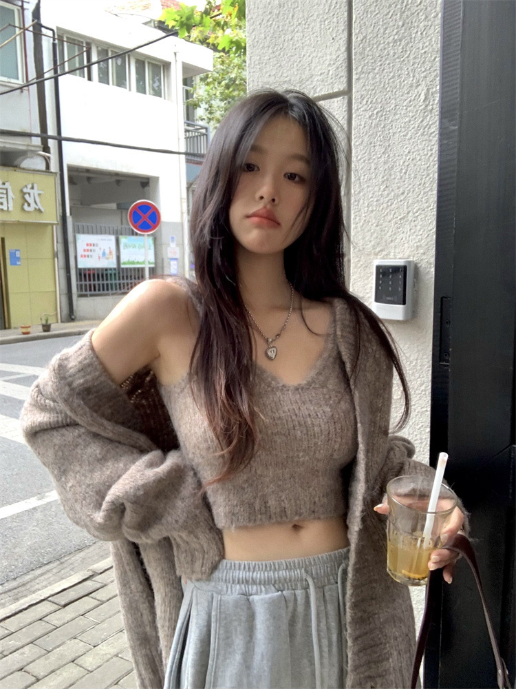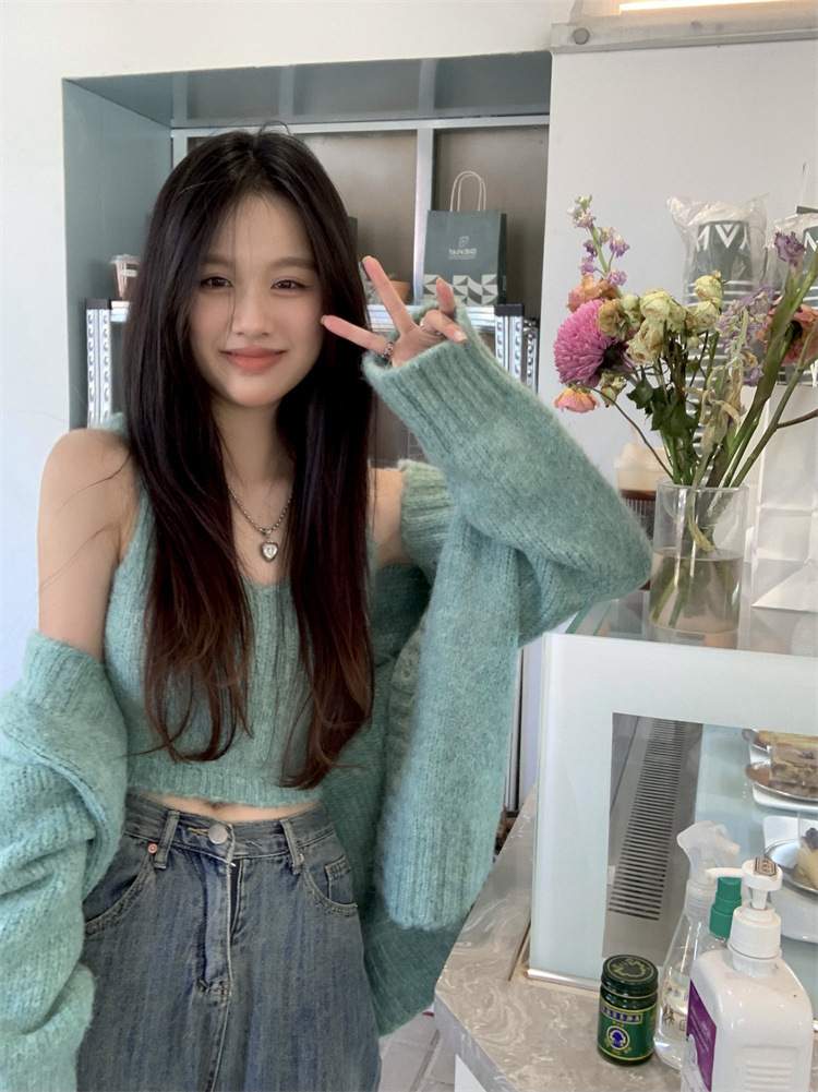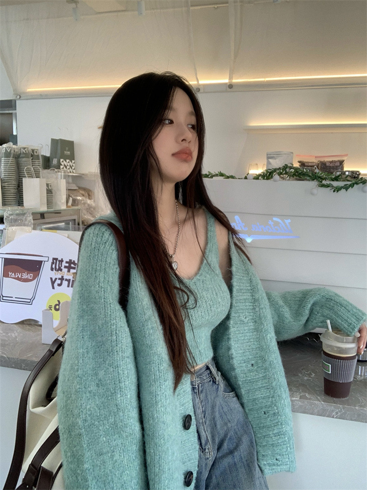 JMA-021 实拍 冬季韩版慵懒风V领厚实毛衣外套女+短款针织小吊带套装