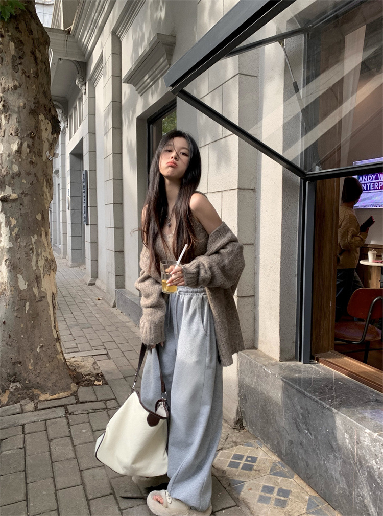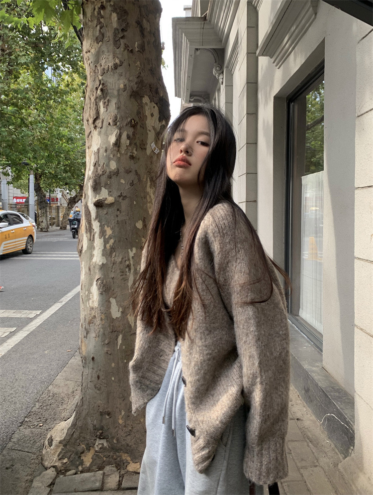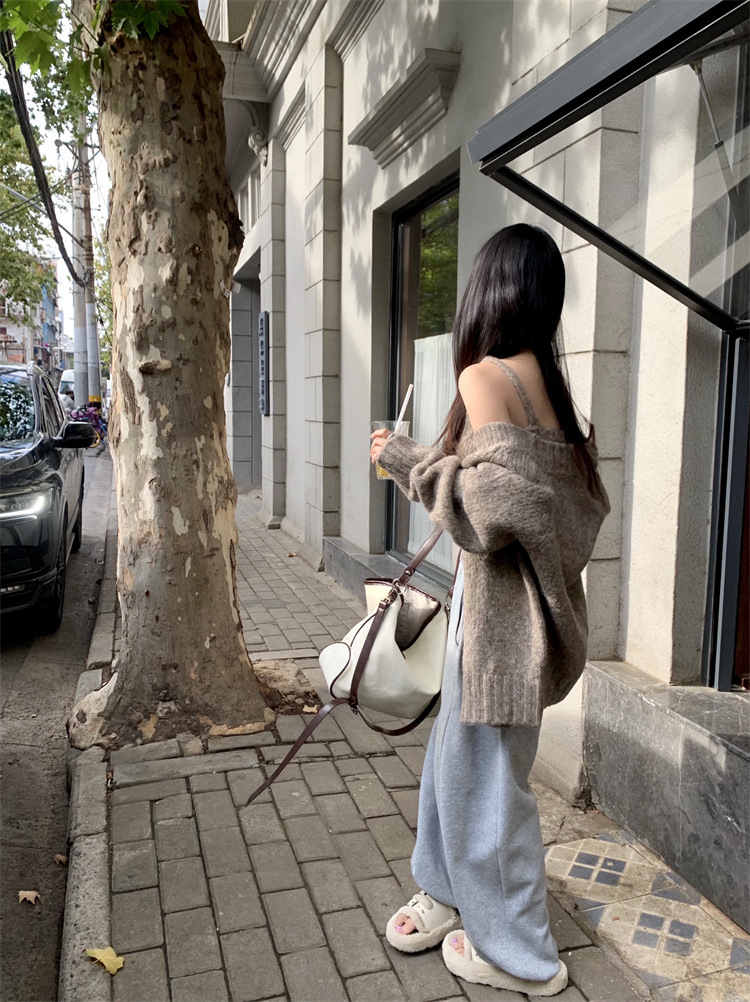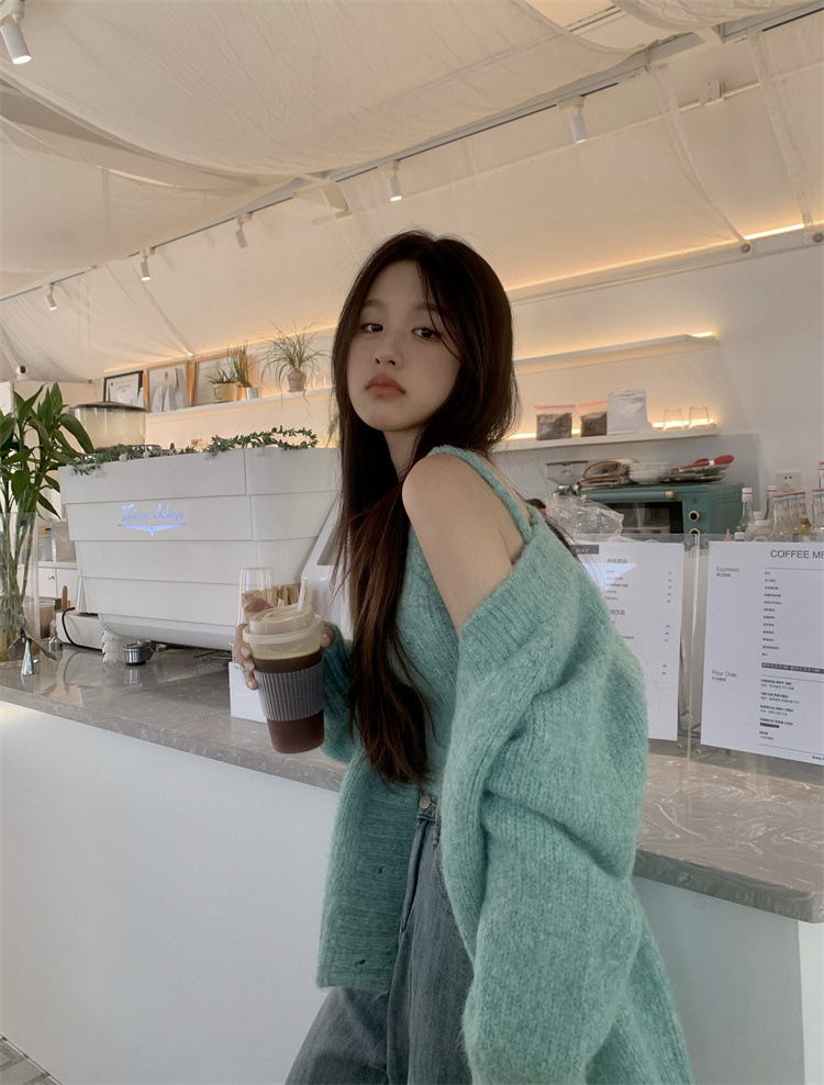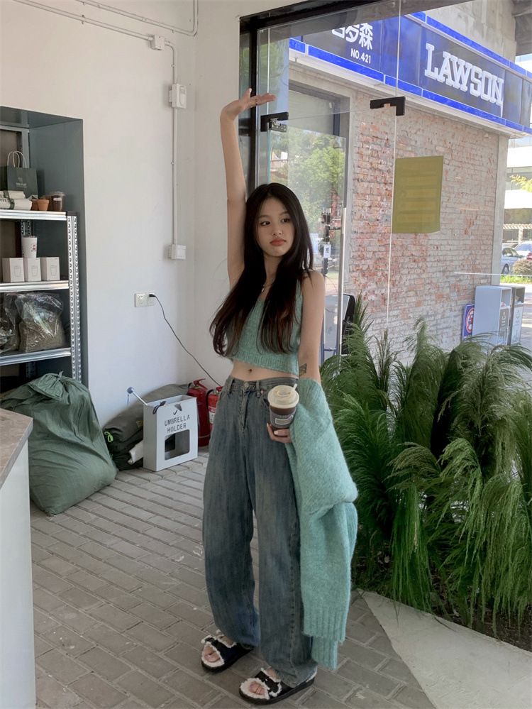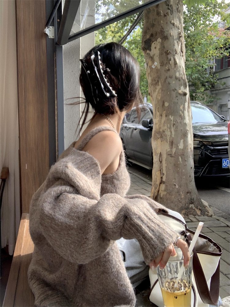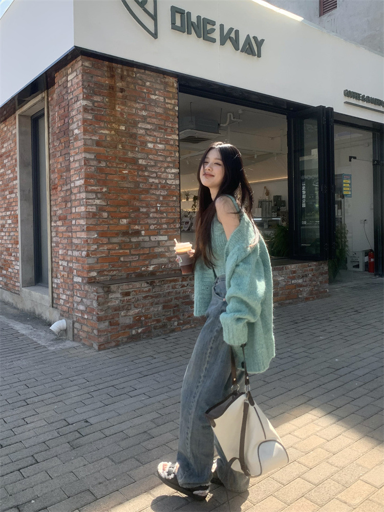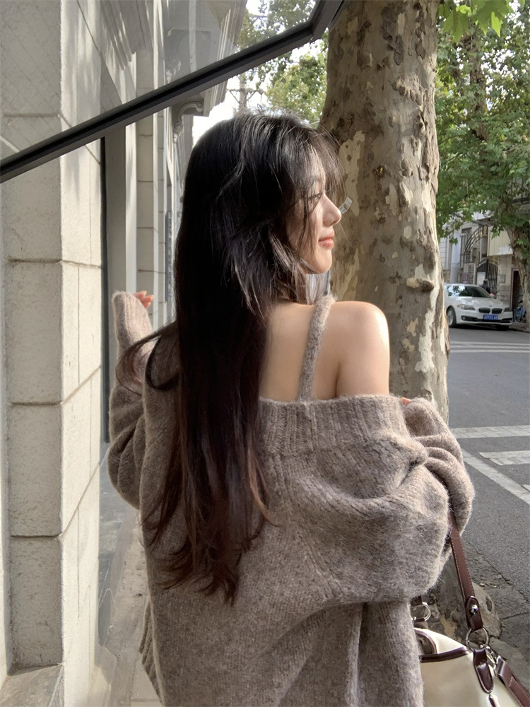 JMA-021 实拍 冬季韩版慵懒风V领厚实毛衣外套女+短款针织小吊带套装