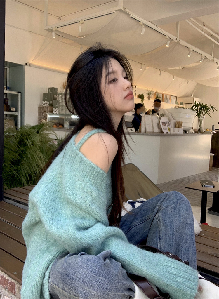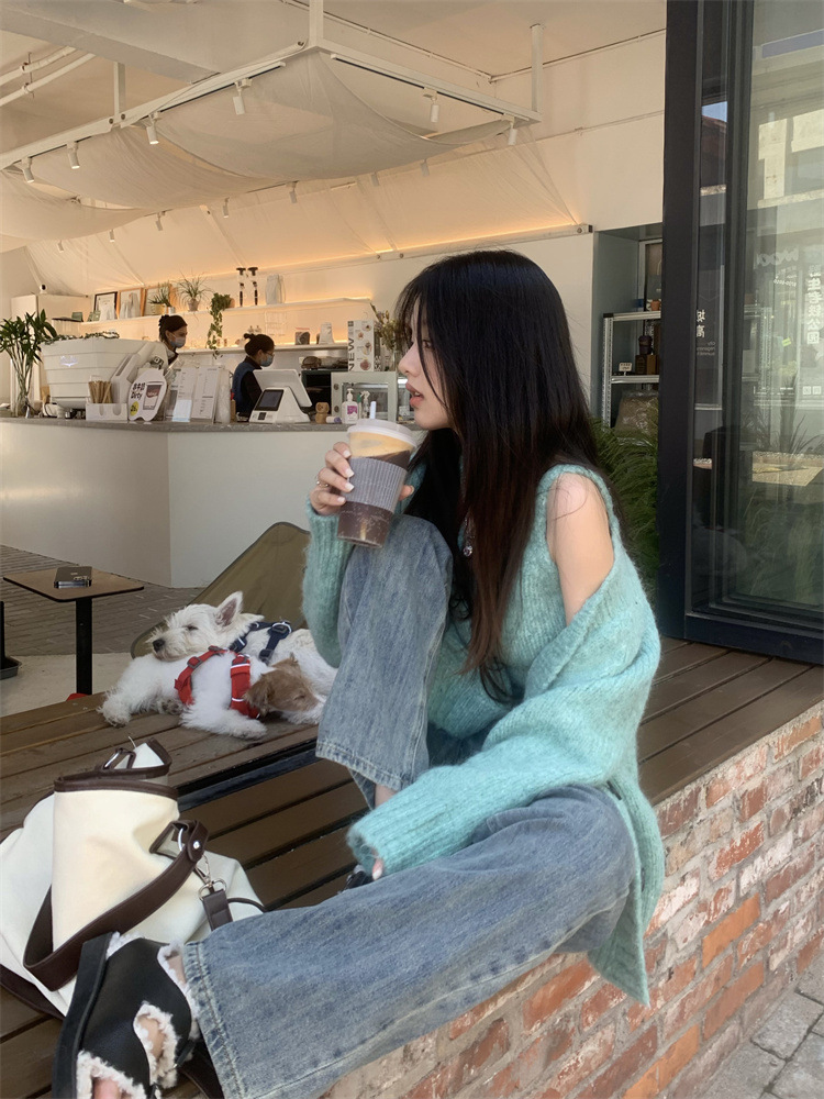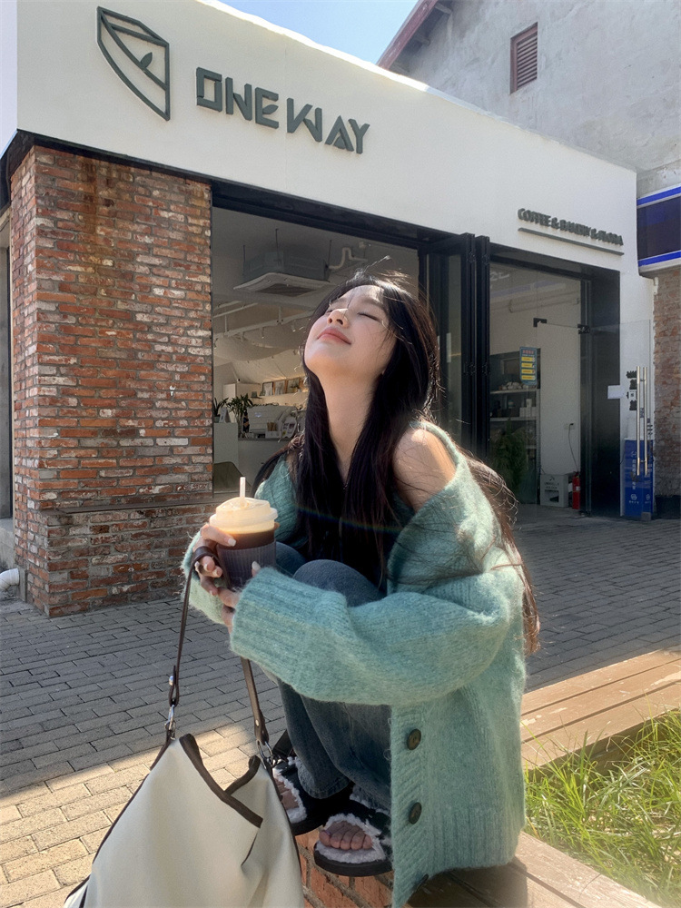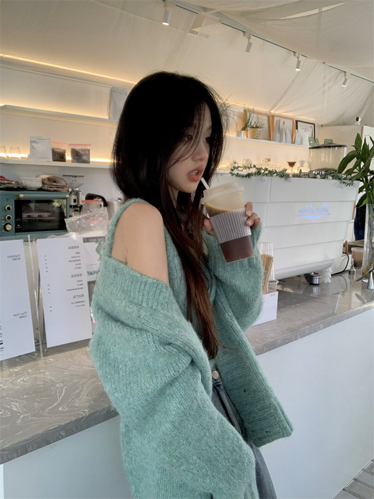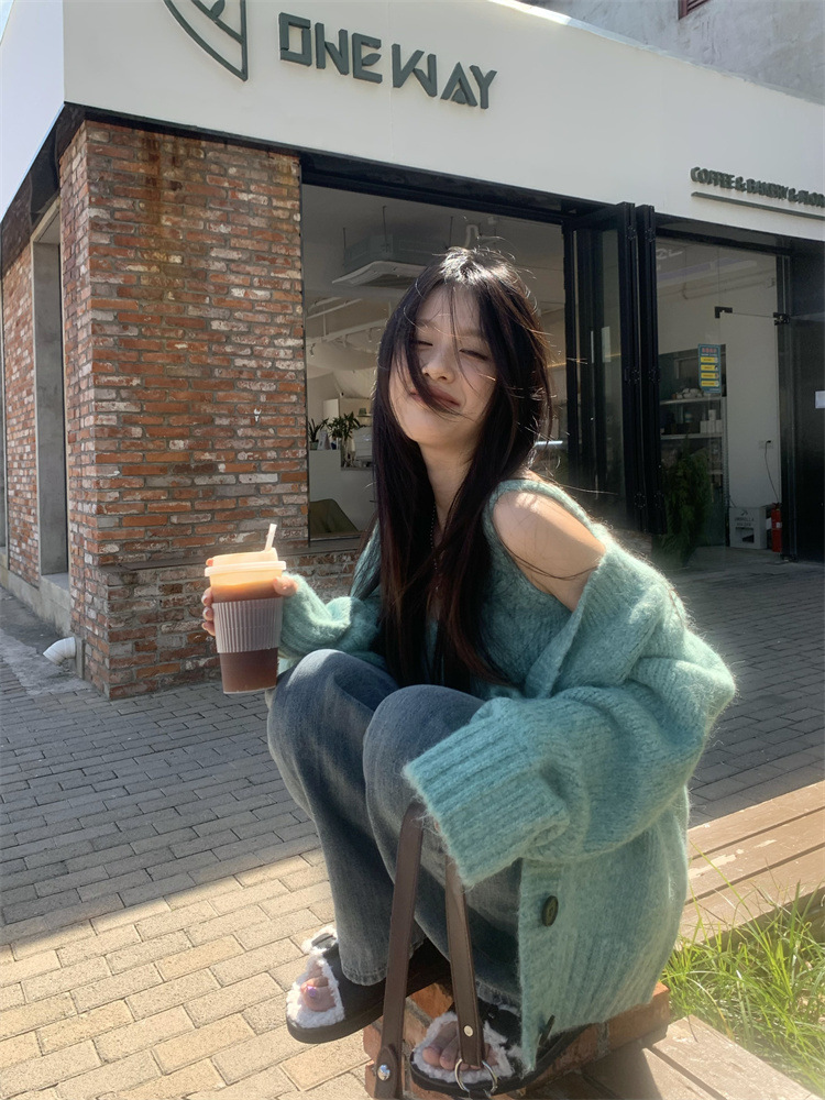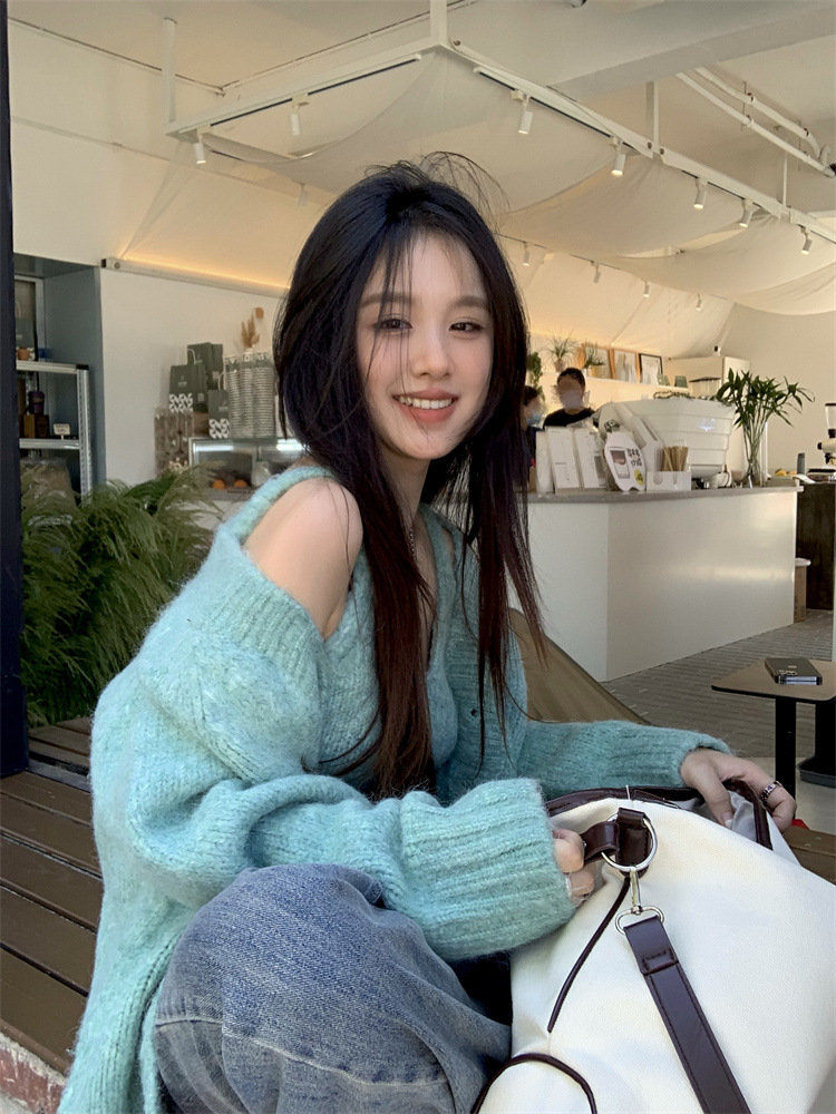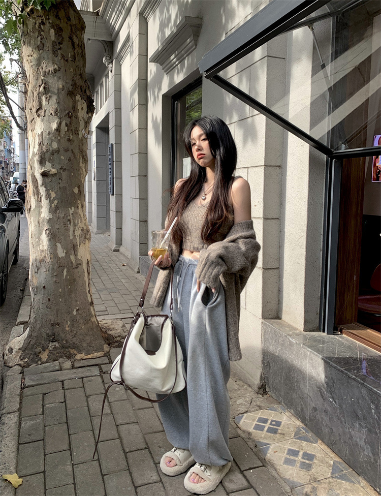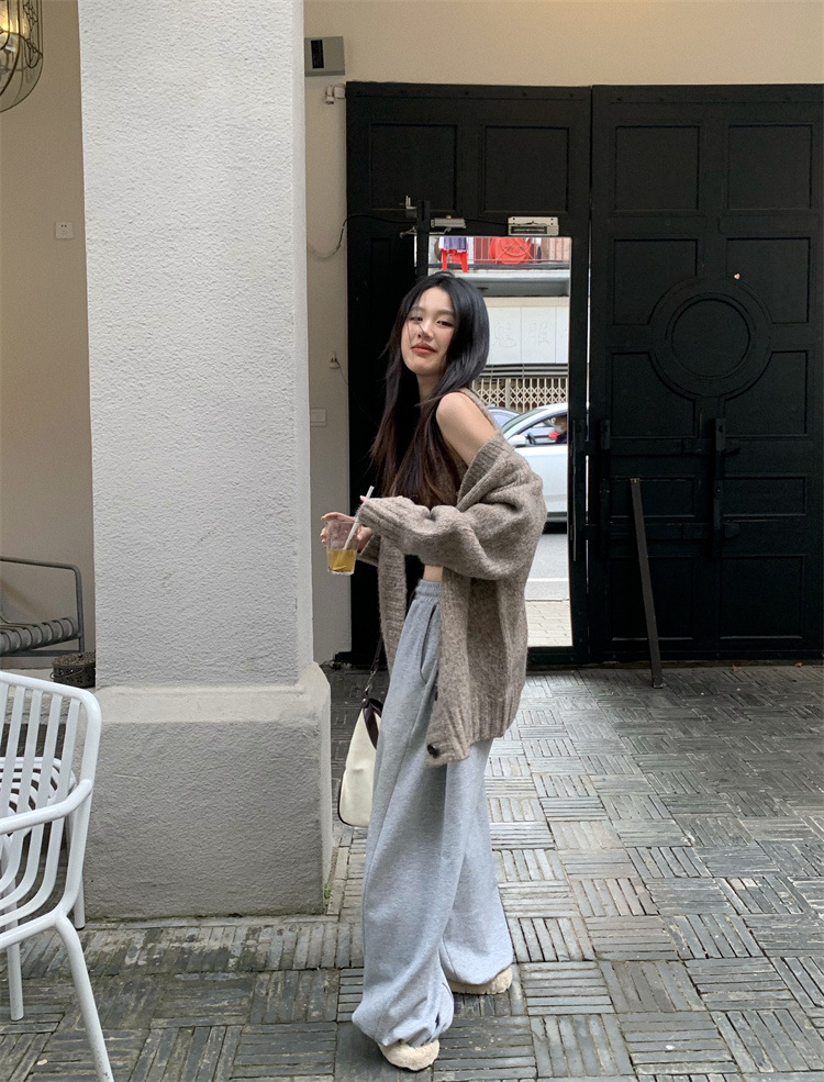 JMA-021 实拍 冬季韩版慵懒风V领厚实毛衣外套女+短款针织小吊带套装