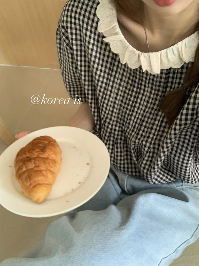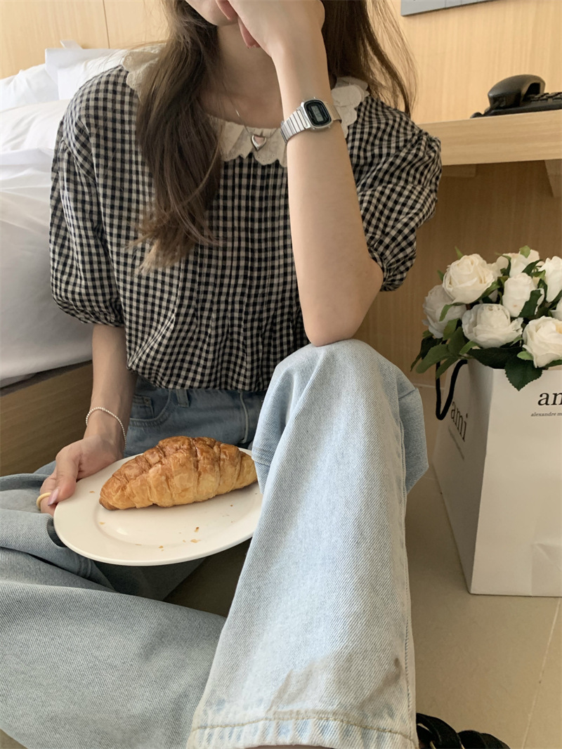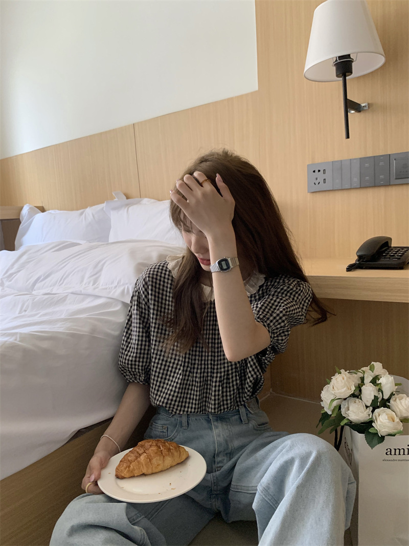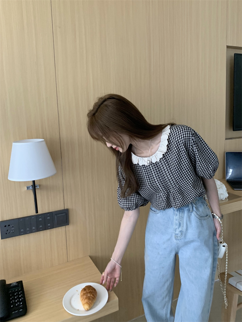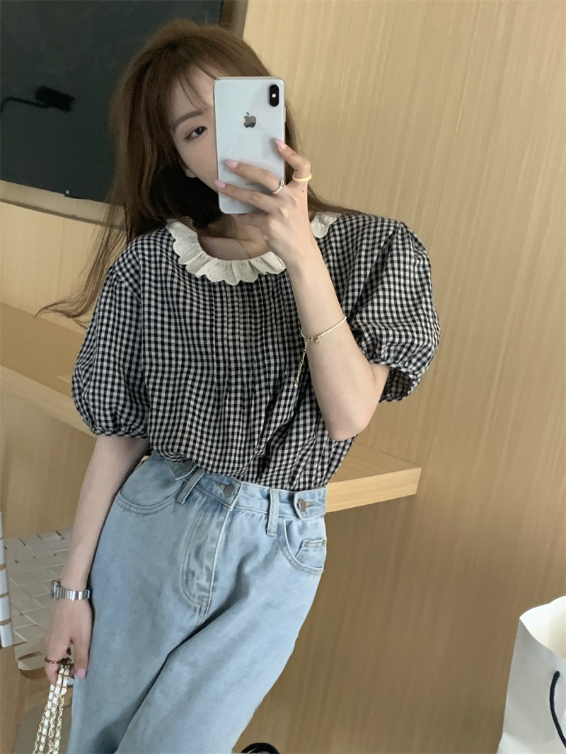JMA-029 实拍 夏季韩版复古花边圆领后背纽扣格子宽松泡泡袖短袖衬衫上衣