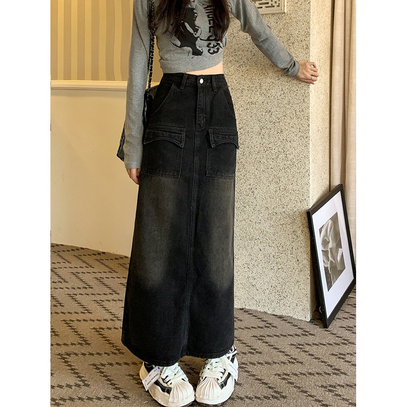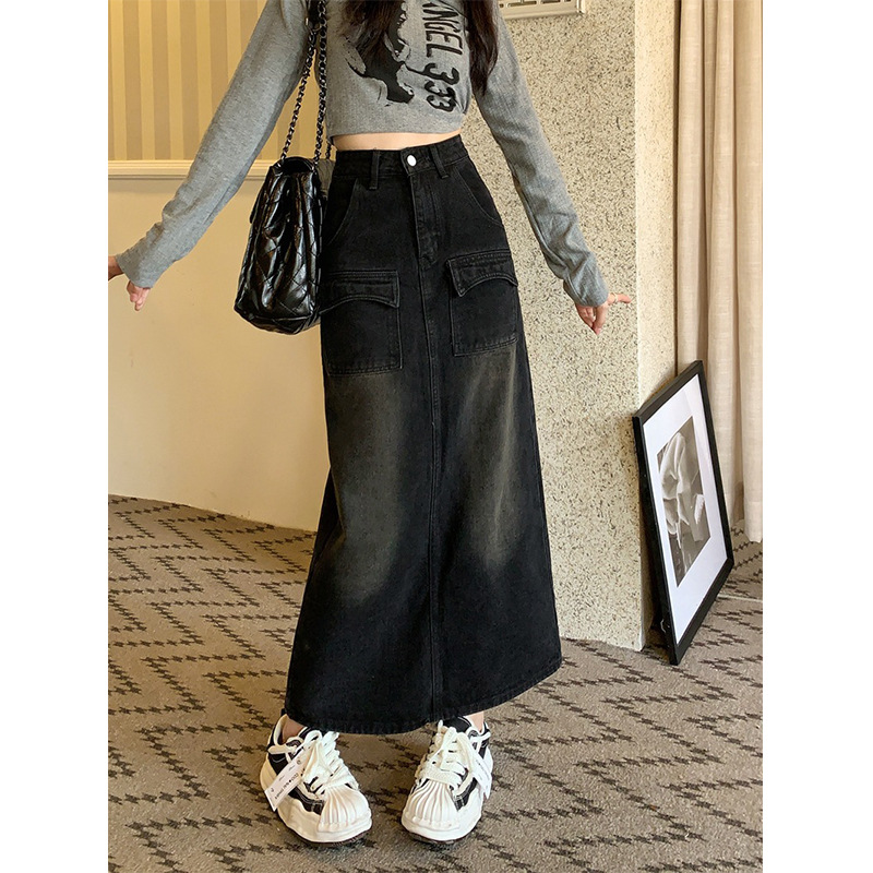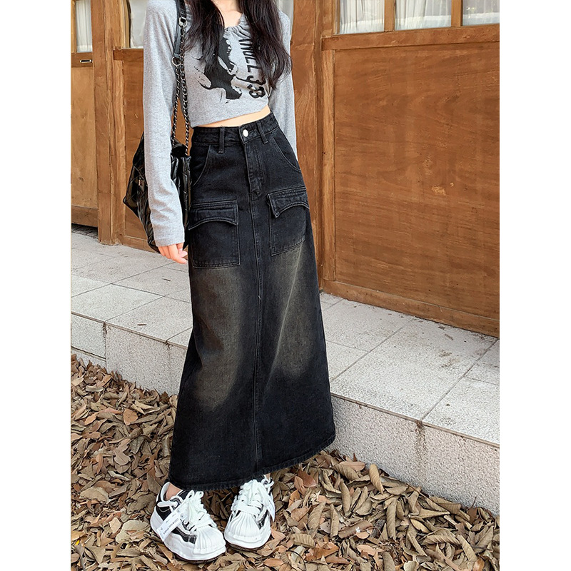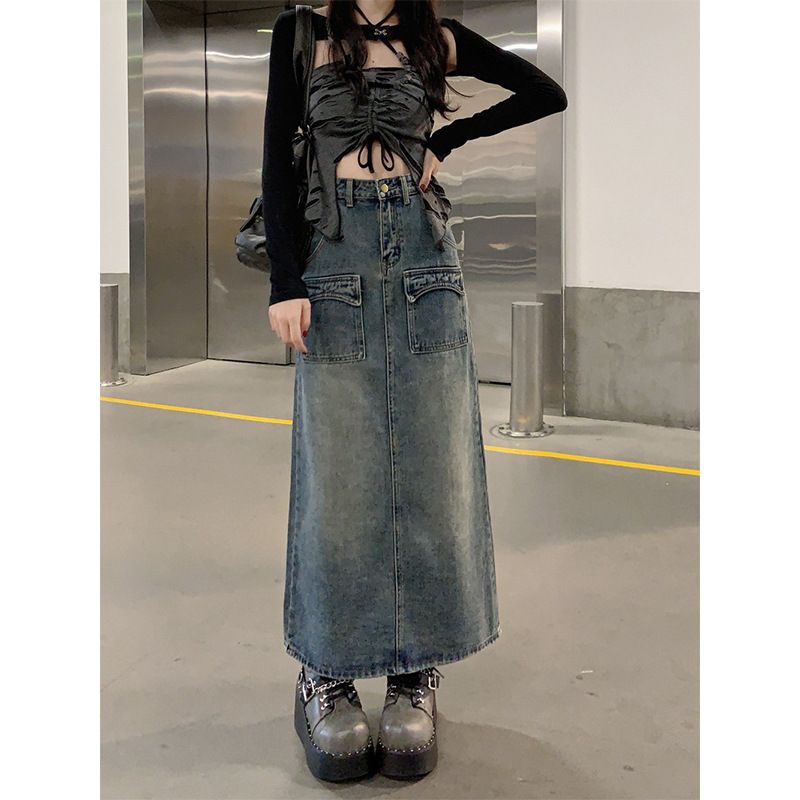 JMA-030 实拍 秋冬季韩版中长款A字牛仔裙女高腰包臀设计感牛仔半身裙