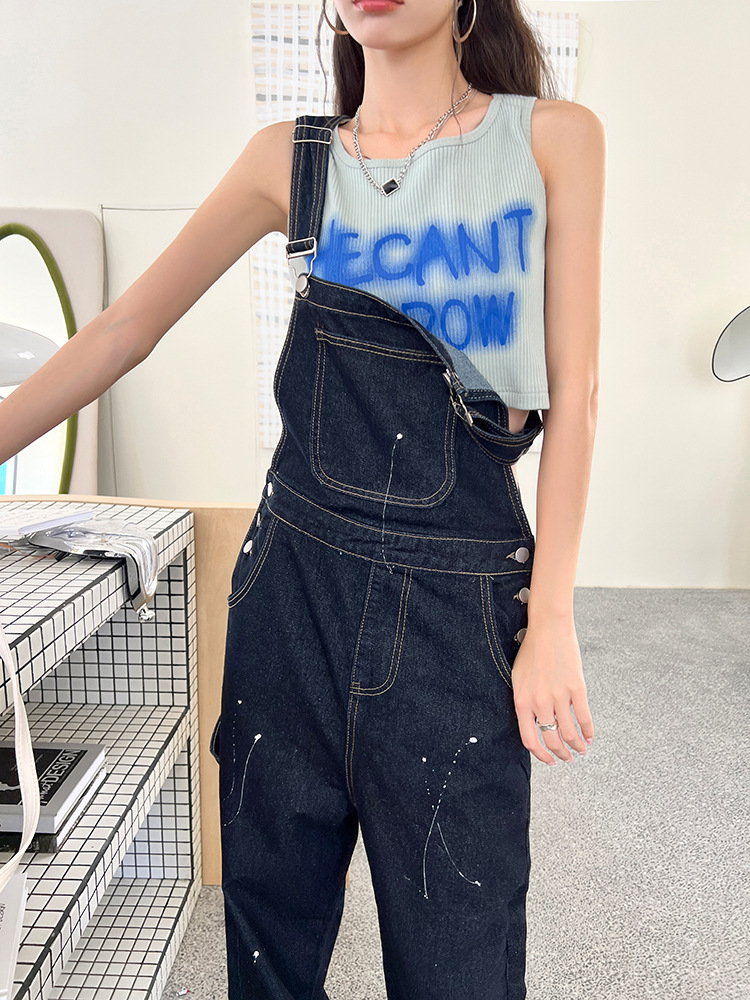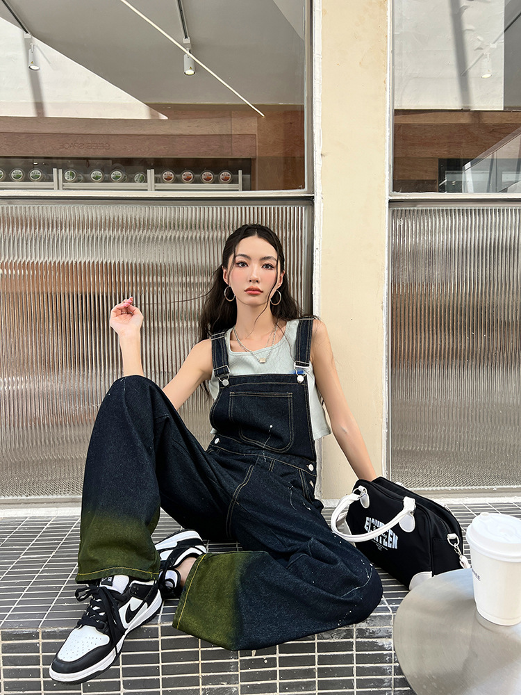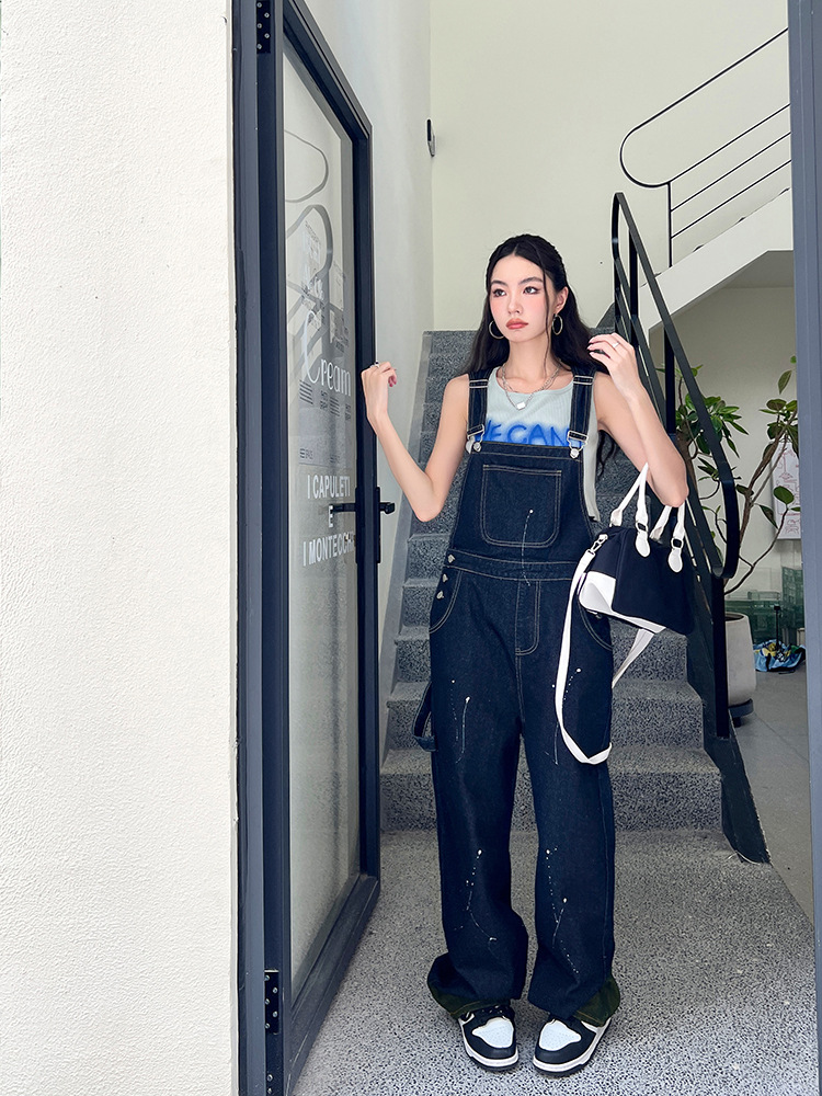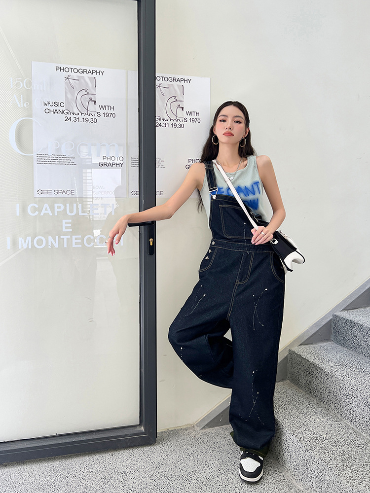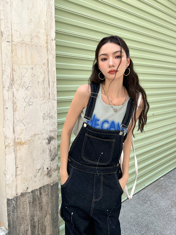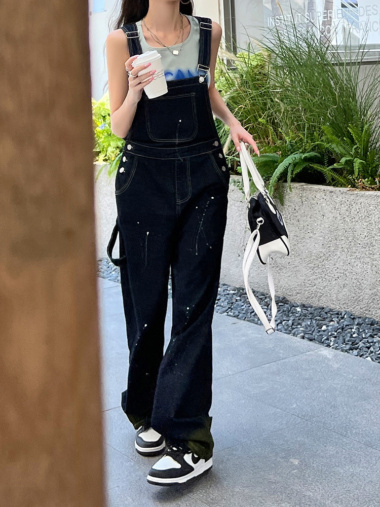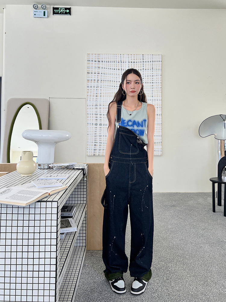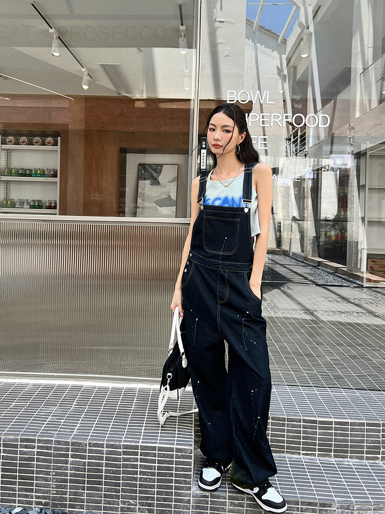 JMA-032 实拍 夏装新款韩版设计水墨点撞色宽松减龄阔腿裤背带牛仔裤女