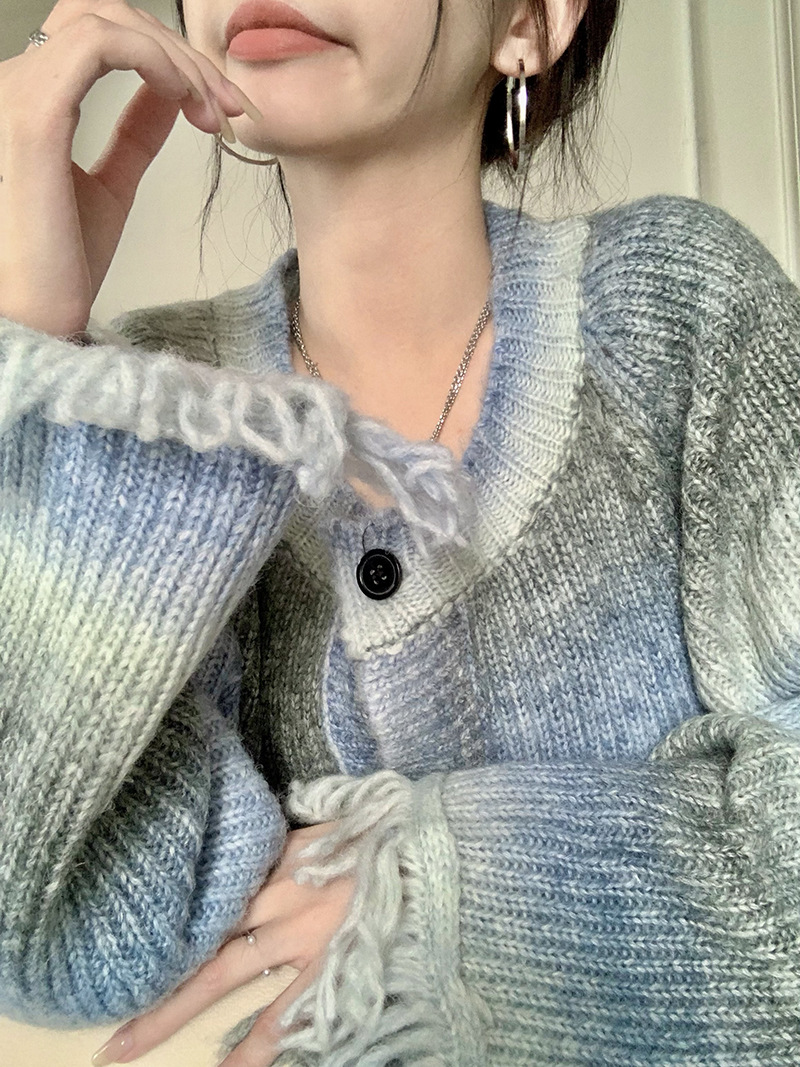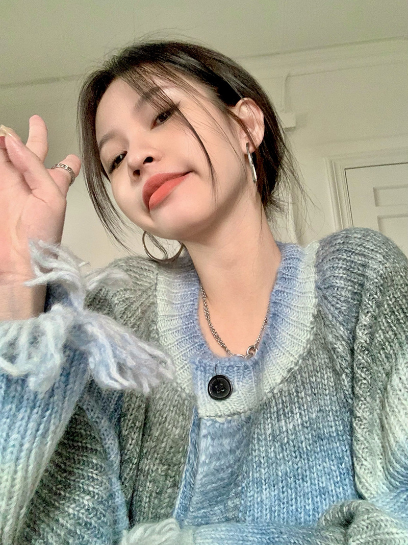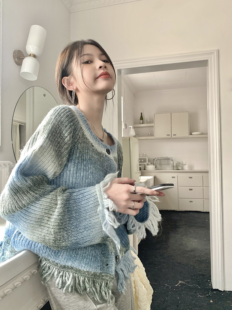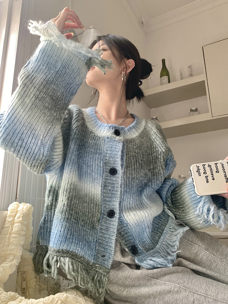 JMA-035 实拍 秋冬季慵懒懈百搭渐变扎染流苏设计感毛边针织毛衣外套
