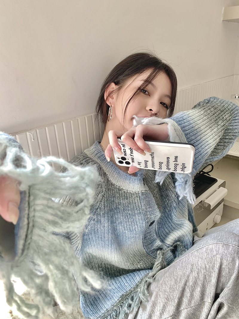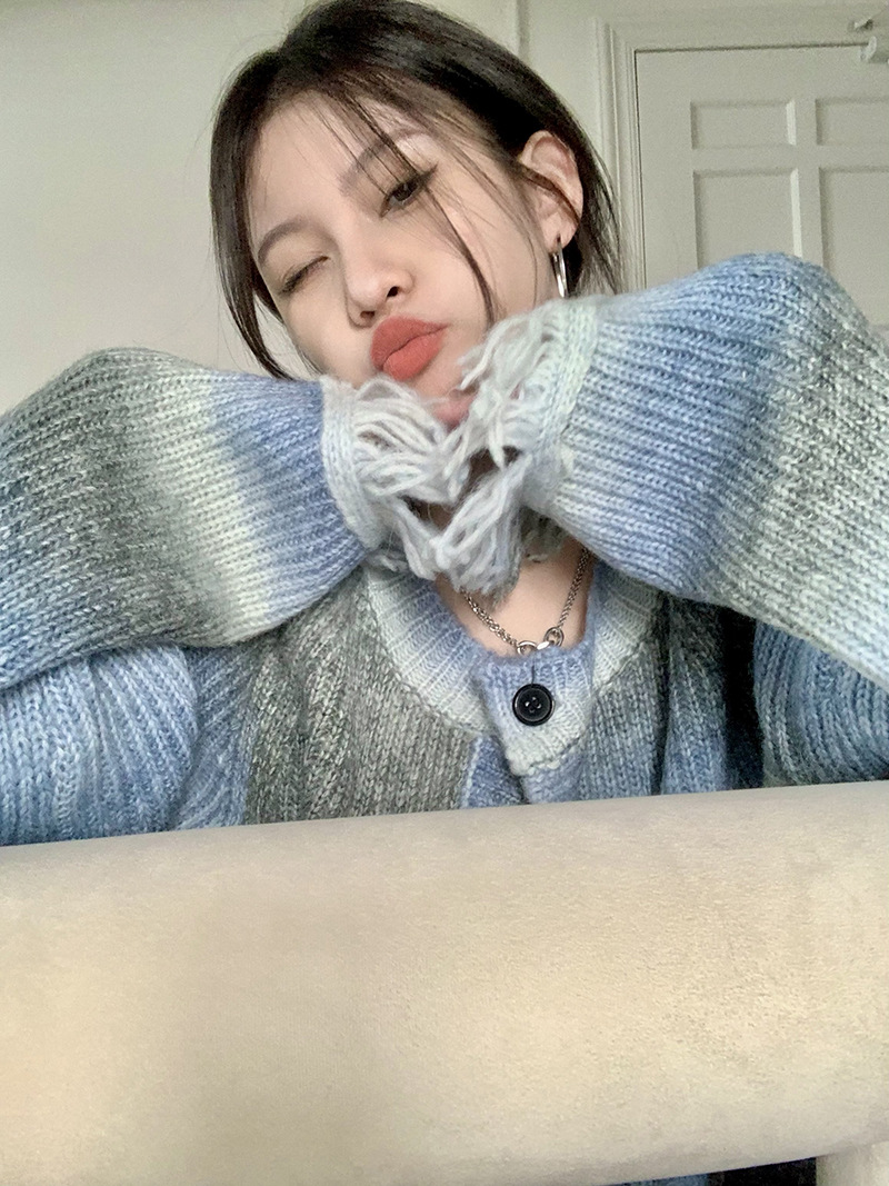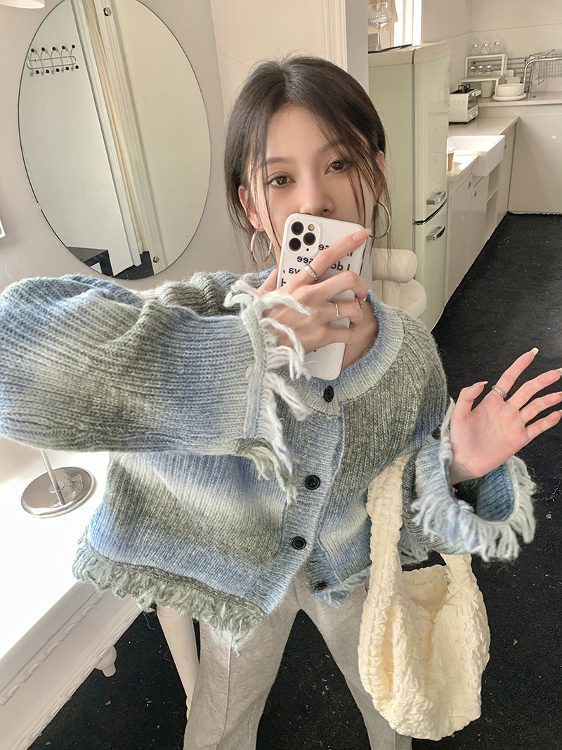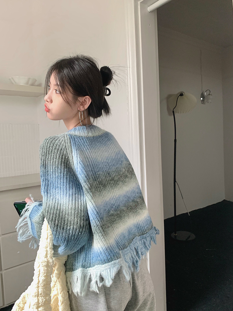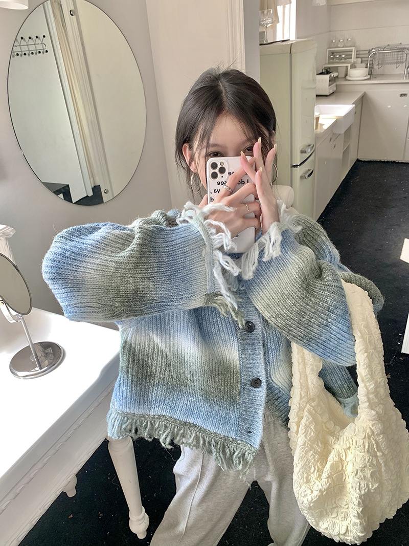 JMA-035 实拍 秋冬季慵懒懈百搭渐变扎染流苏设计感毛边针织毛衣外套