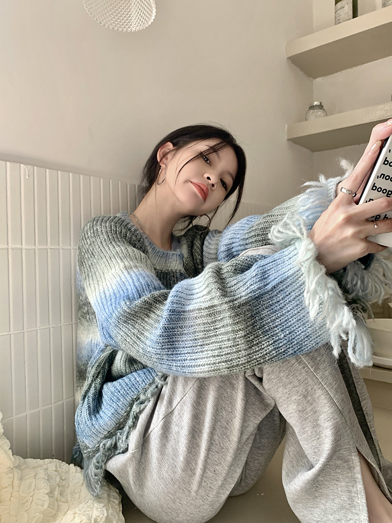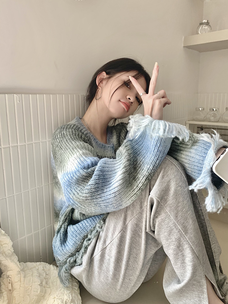 • 將圖片載入圖庫檢視器 JMA-035 实拍 秋冬季慵懒懈百搭渐变扎染流苏设计感毛边针织毛衣外套