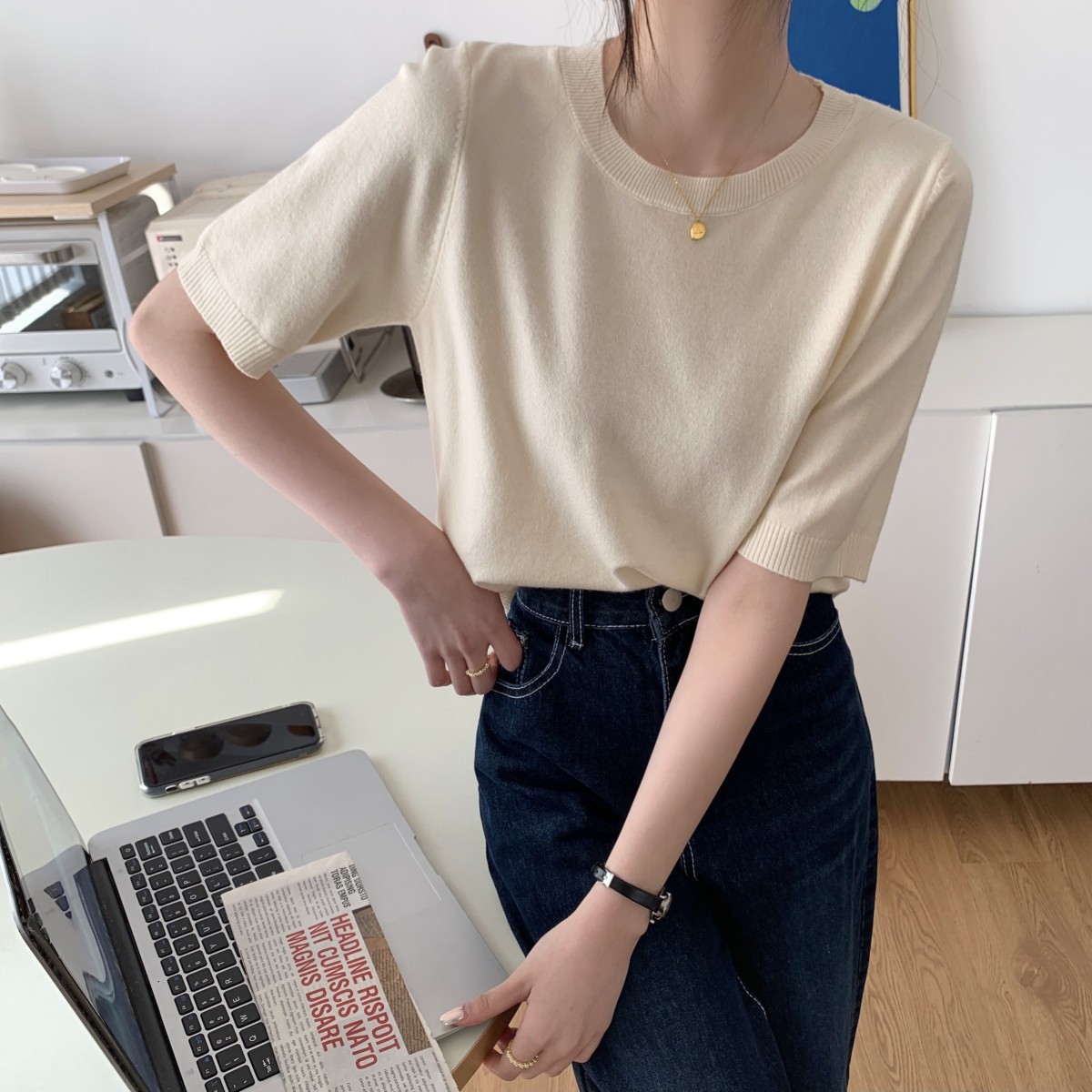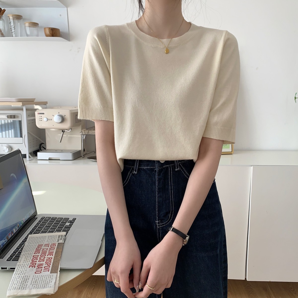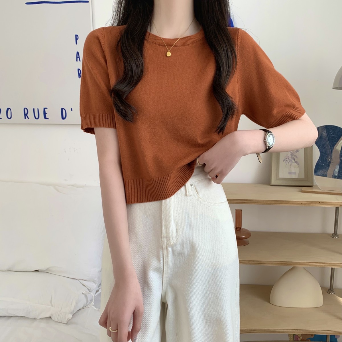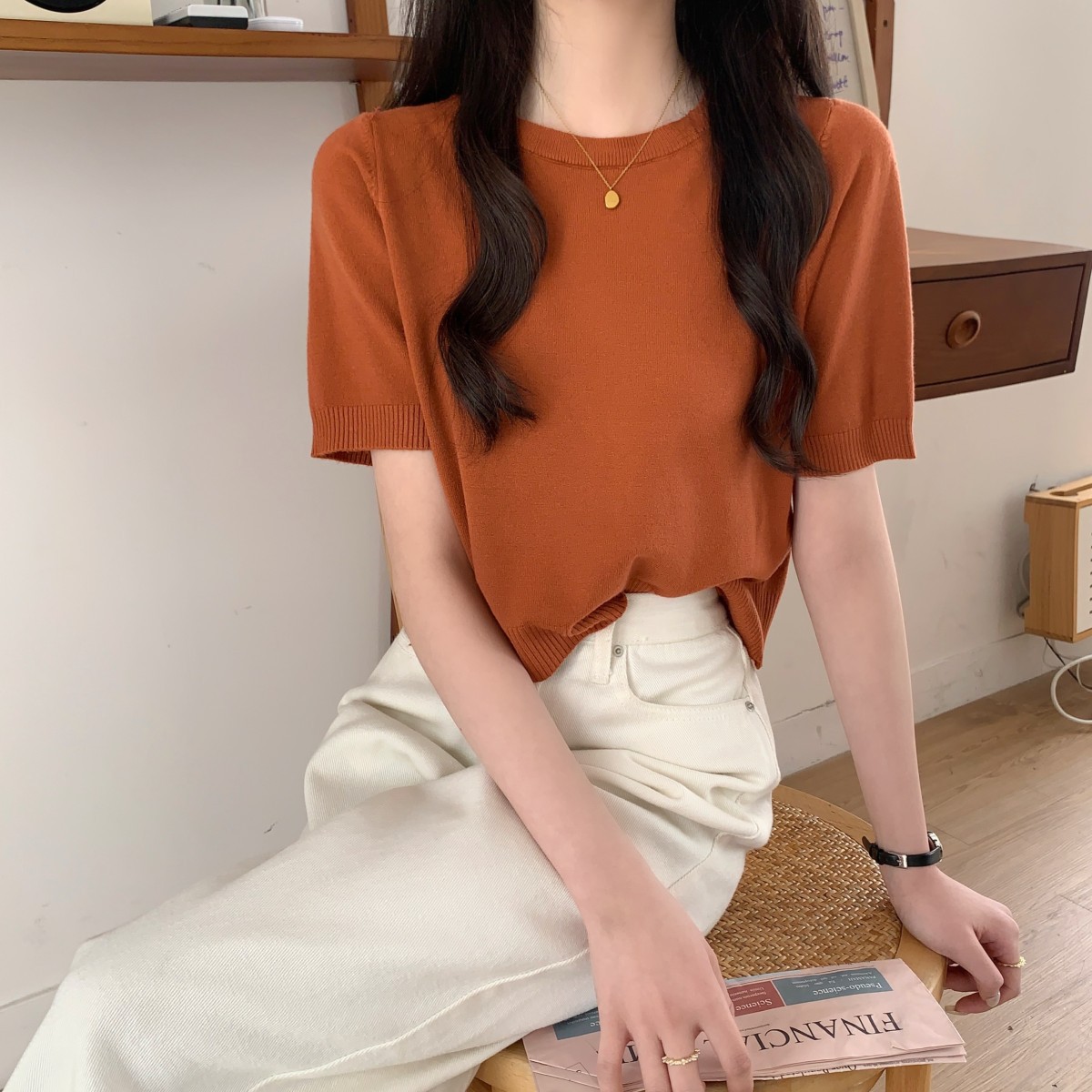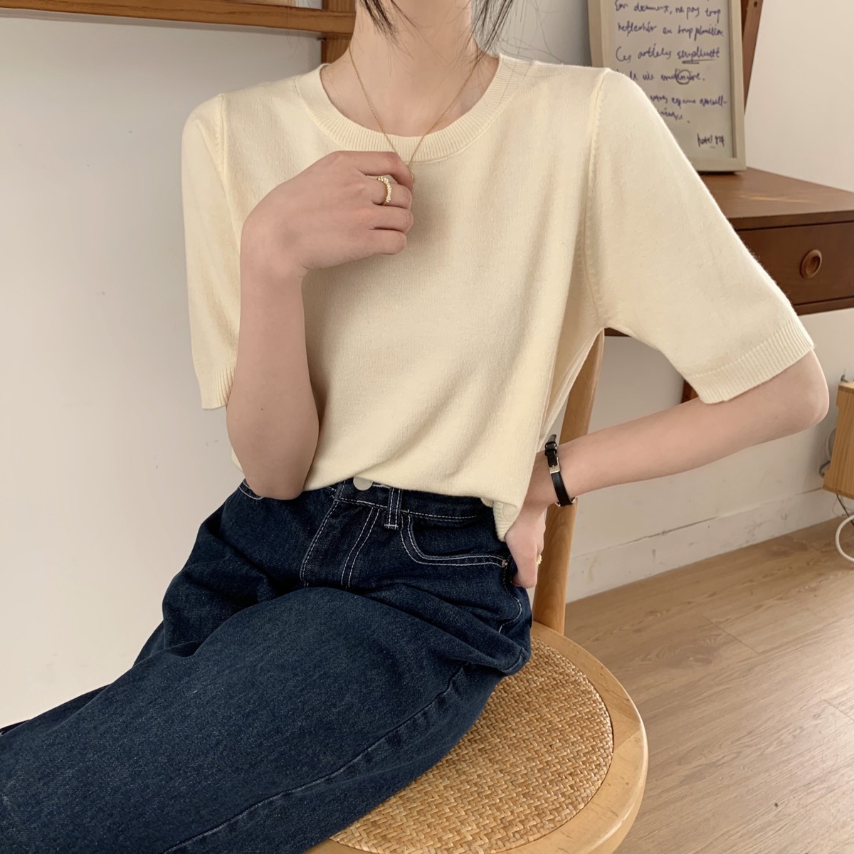 JMA-040 实拍 夏季韩版ins风圆领基础通勤纯色百搭短袖针织衫T恤女上