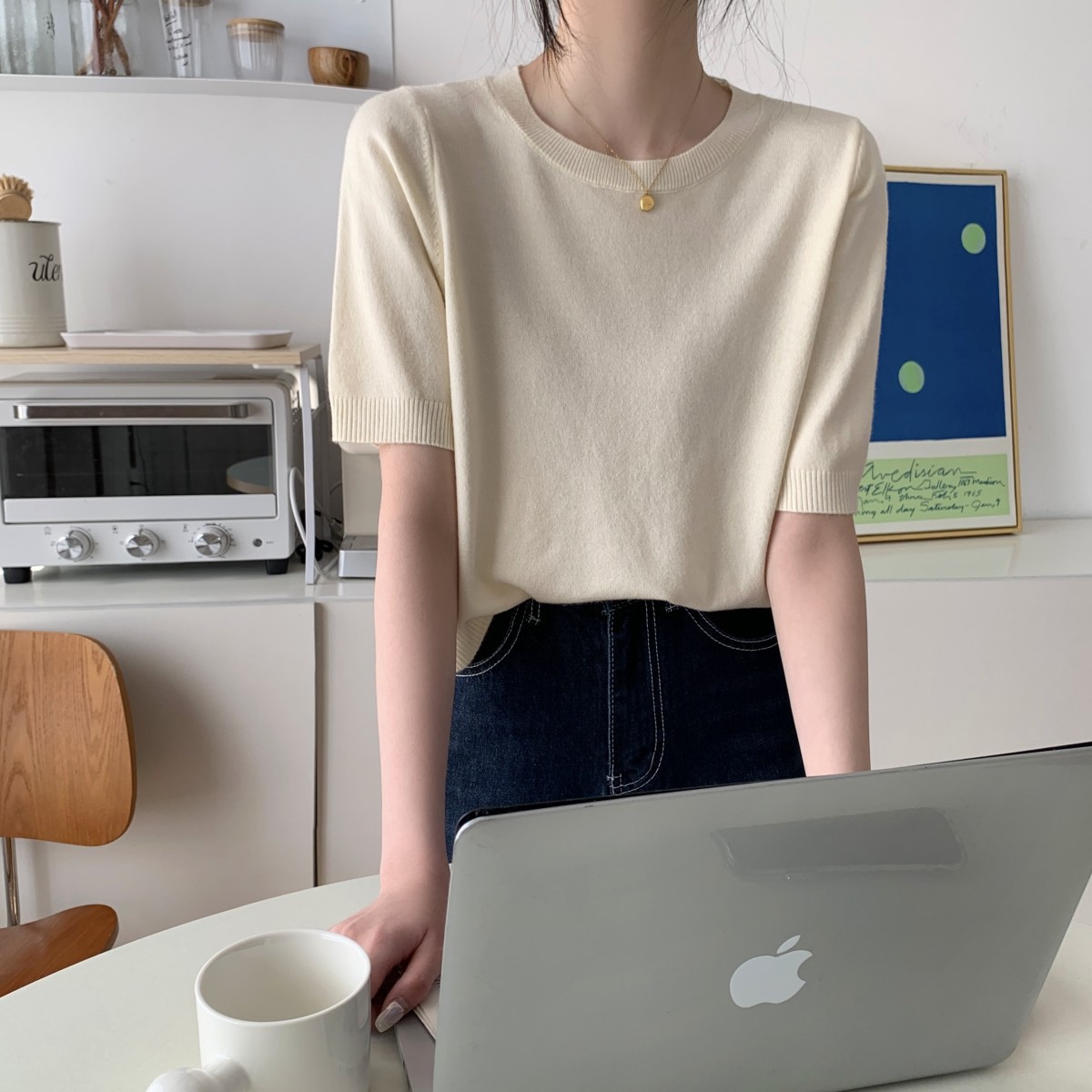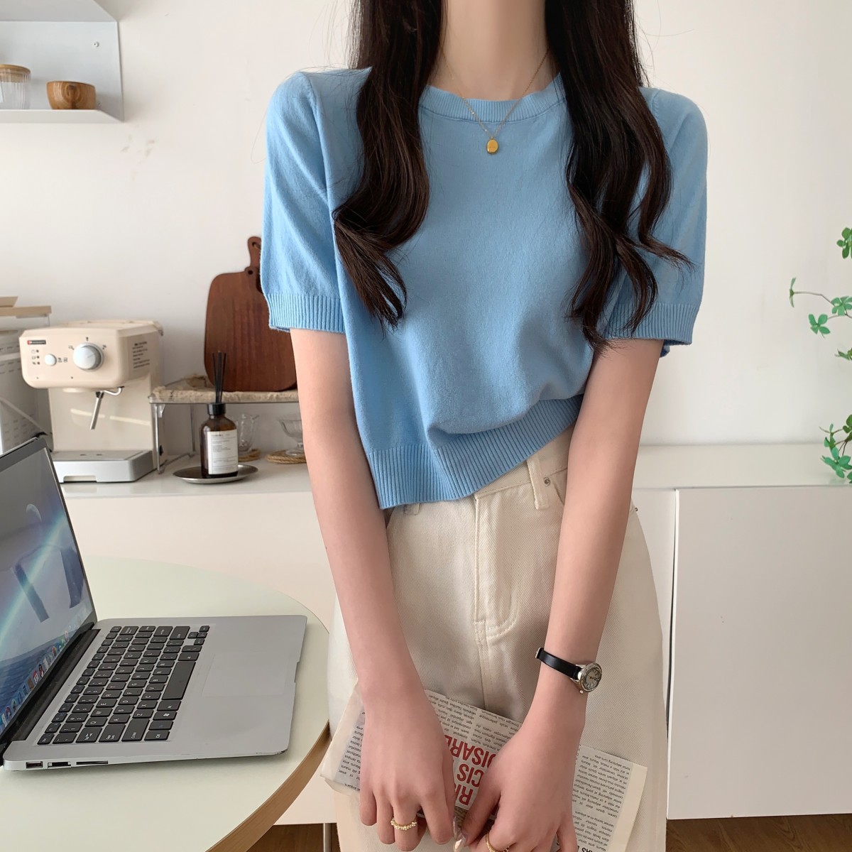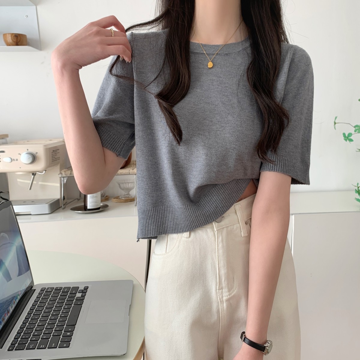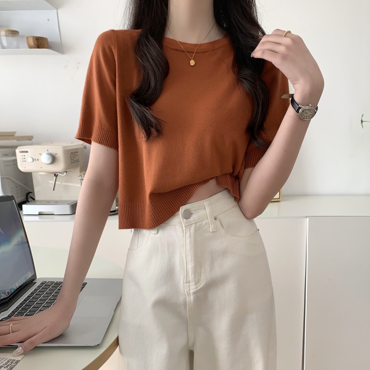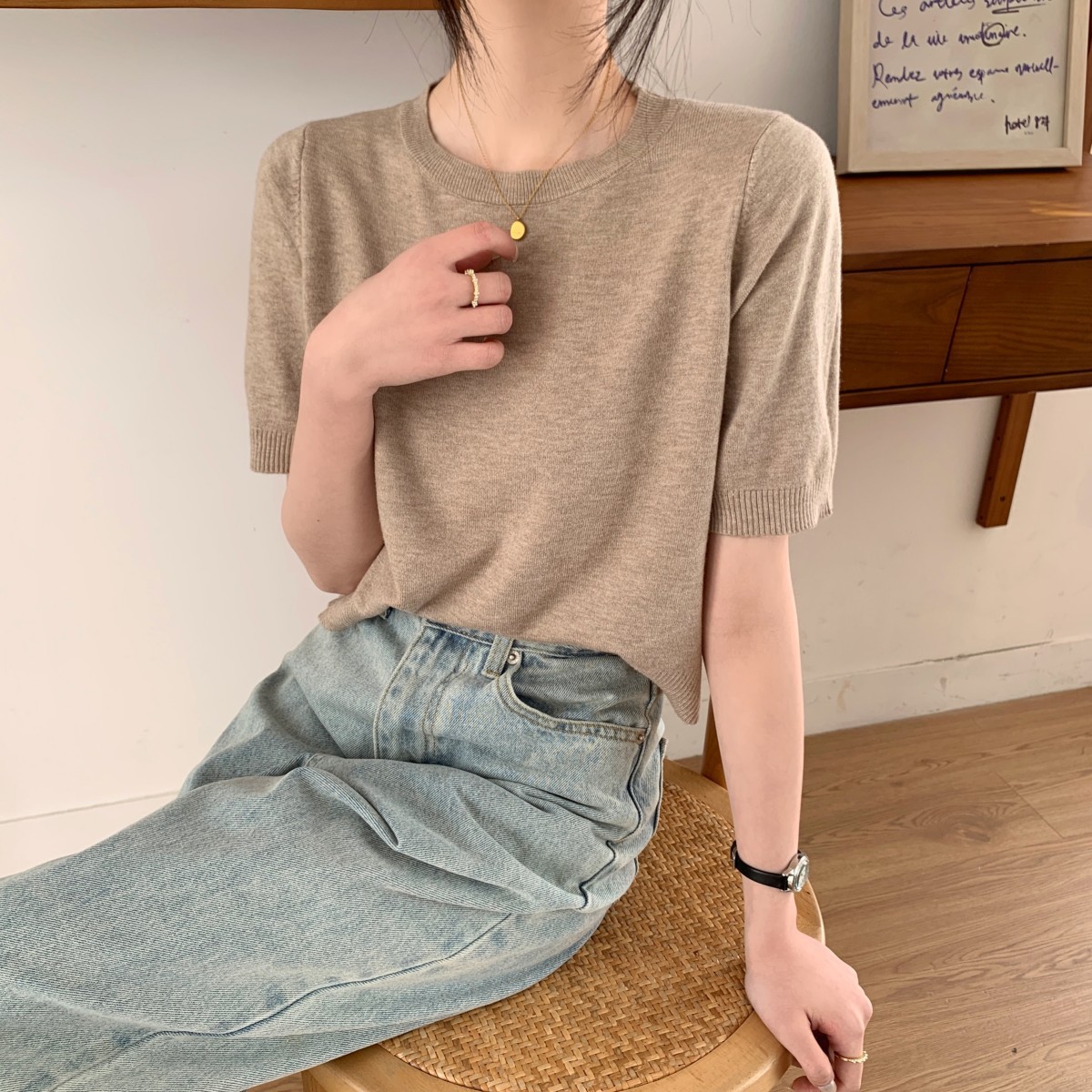 JMA-040 实拍 夏季韩版ins风圆领基础通勤纯色百搭短袖针织衫T恤女上