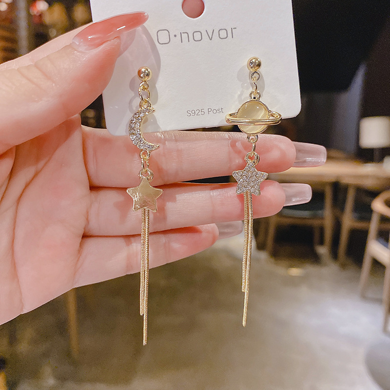 JME-842 925银针韩国东大门星月不对称长款流苏耳环女气质网红耳钉