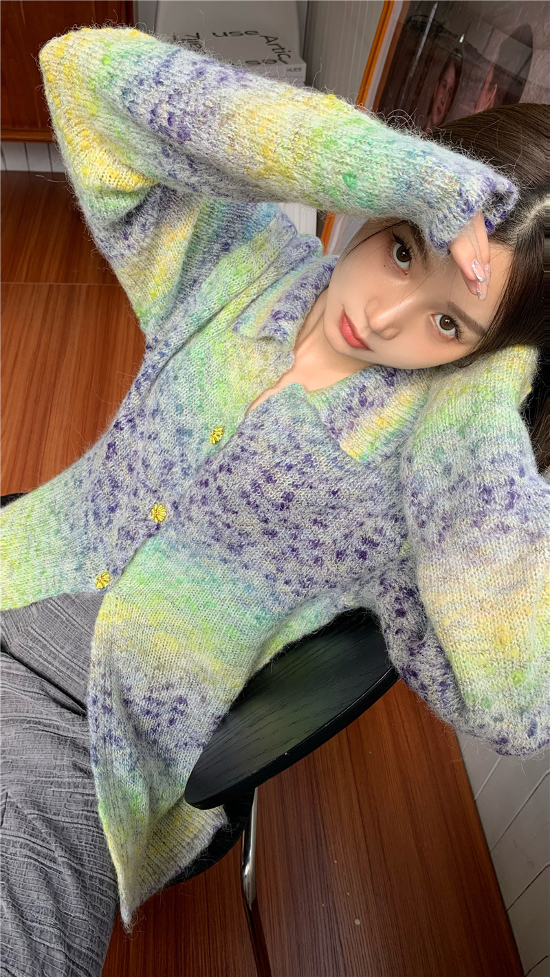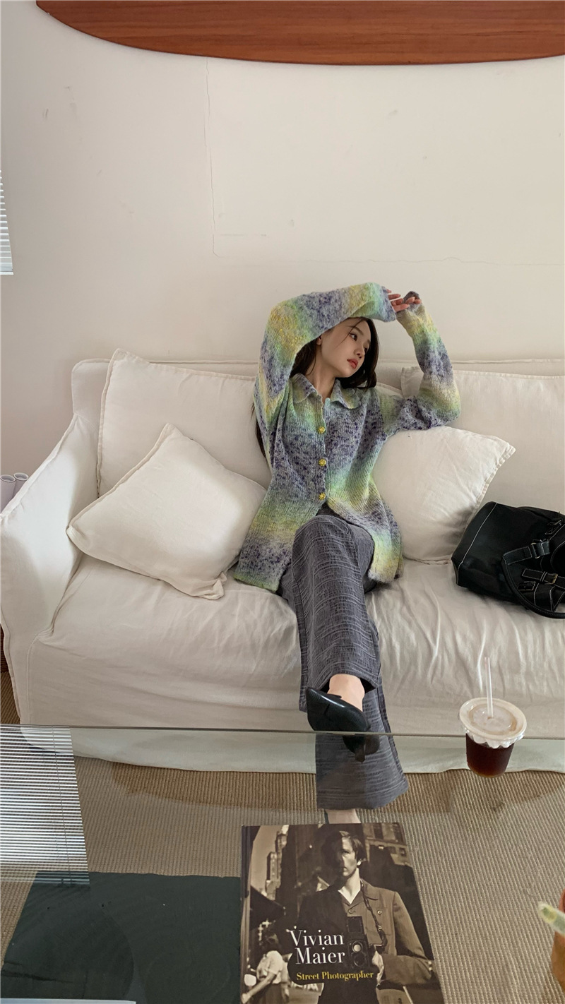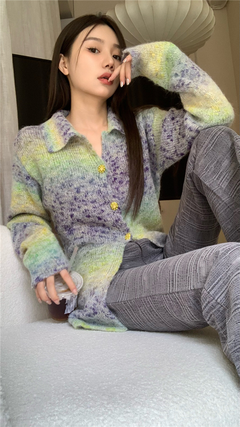 JMA-042 实拍 韩版百搭设计感小重工撞色渐变翻领纽扣针织毛衣