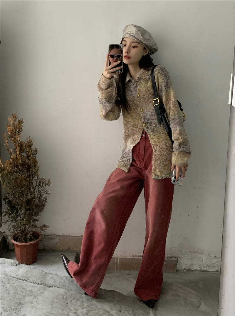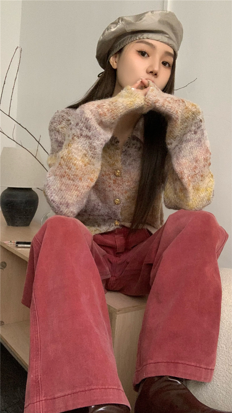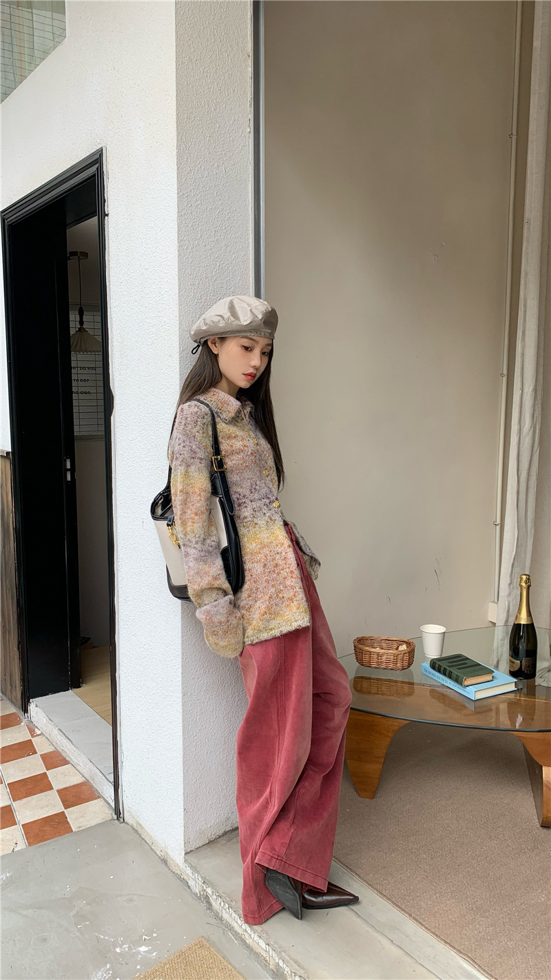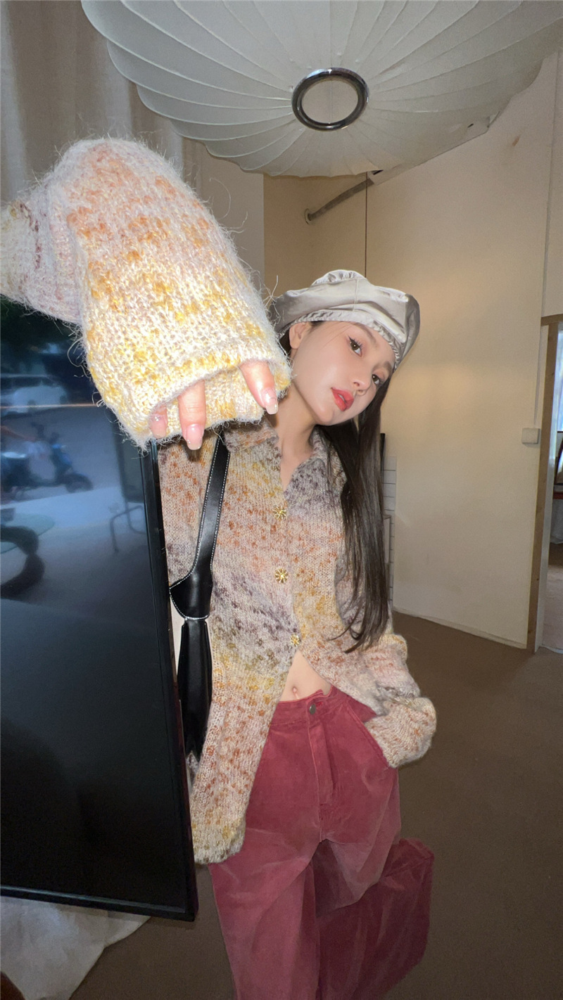 JMA-042 实拍 韩版百搭设计感小重工撞色渐变翻领纽扣针织毛衣