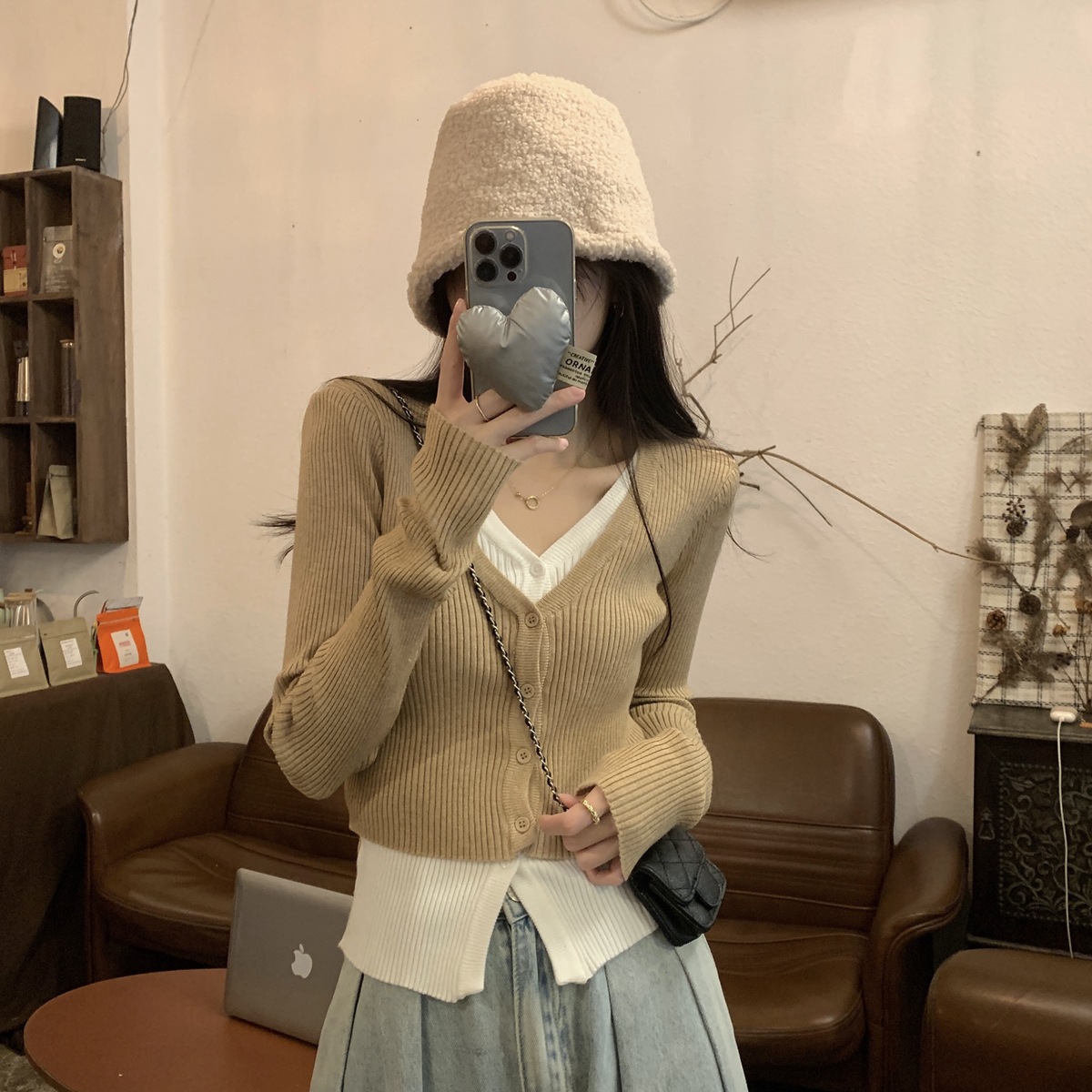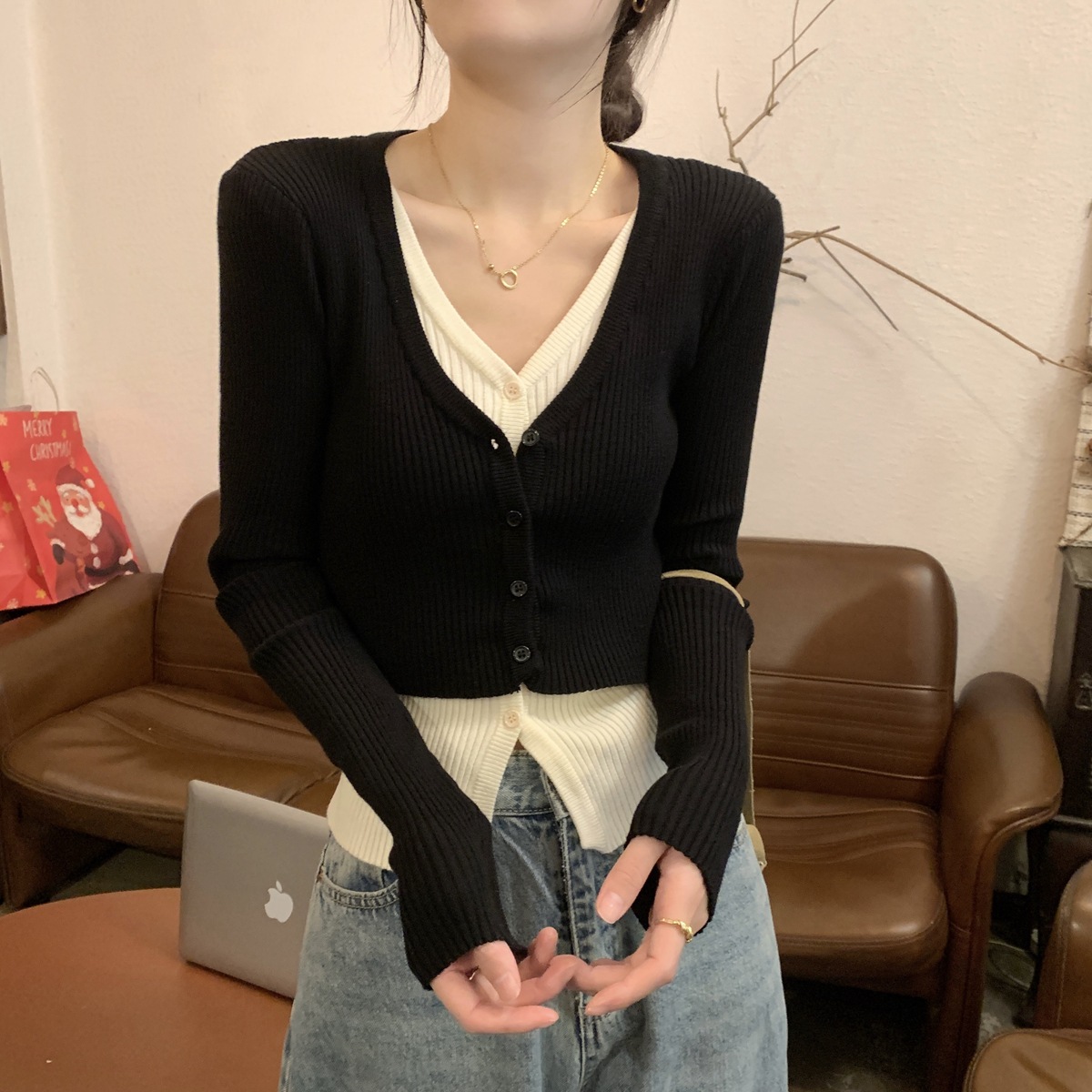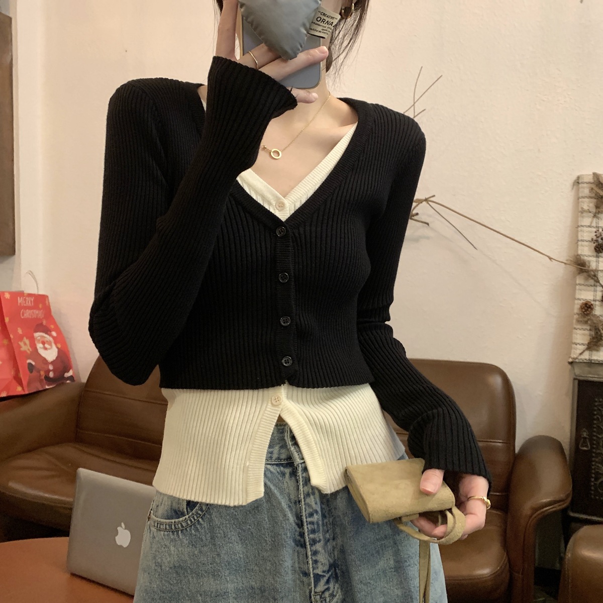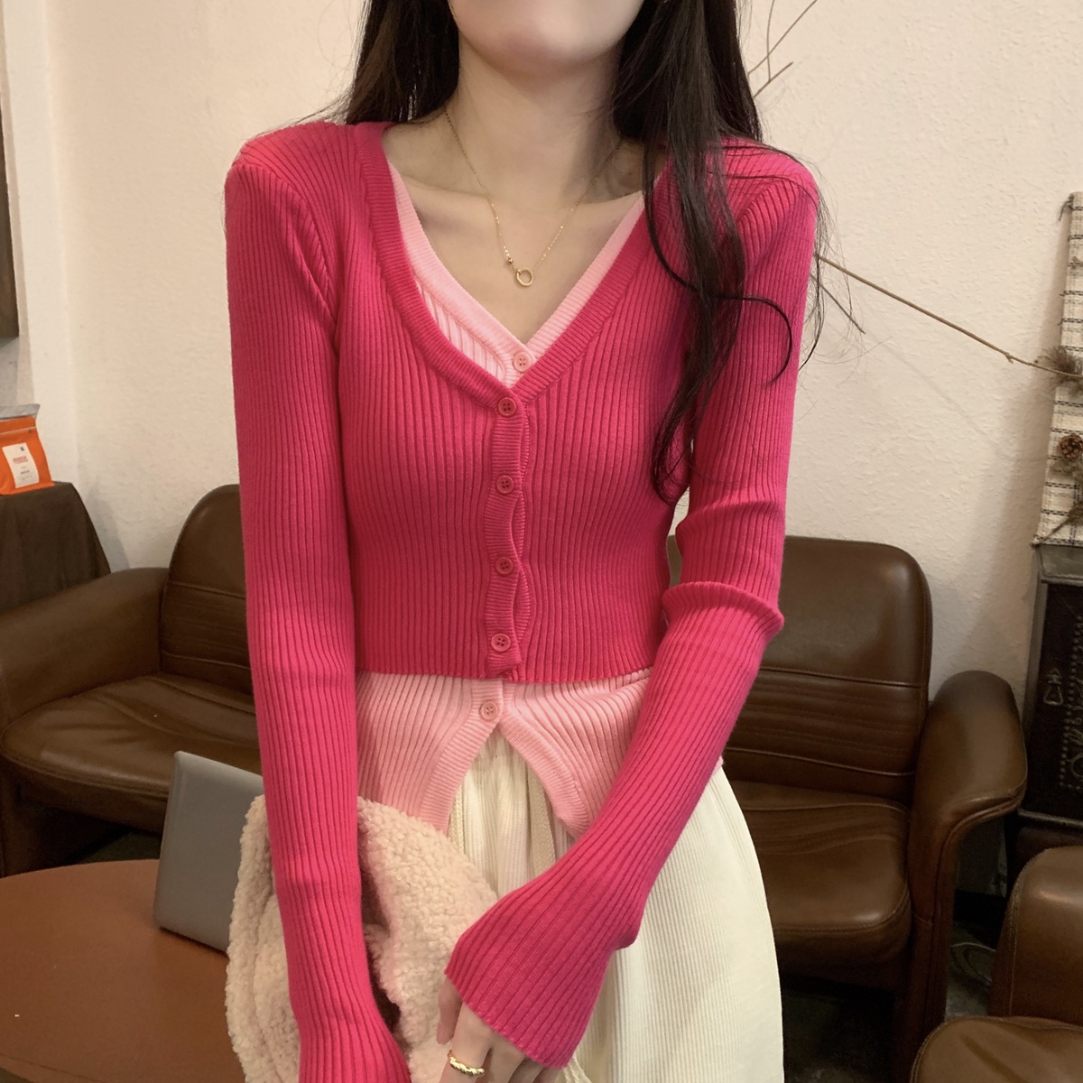 JMA-045实拍 新款韩版修身v领撞色假两件打底衫针织开衫内搭毛衣