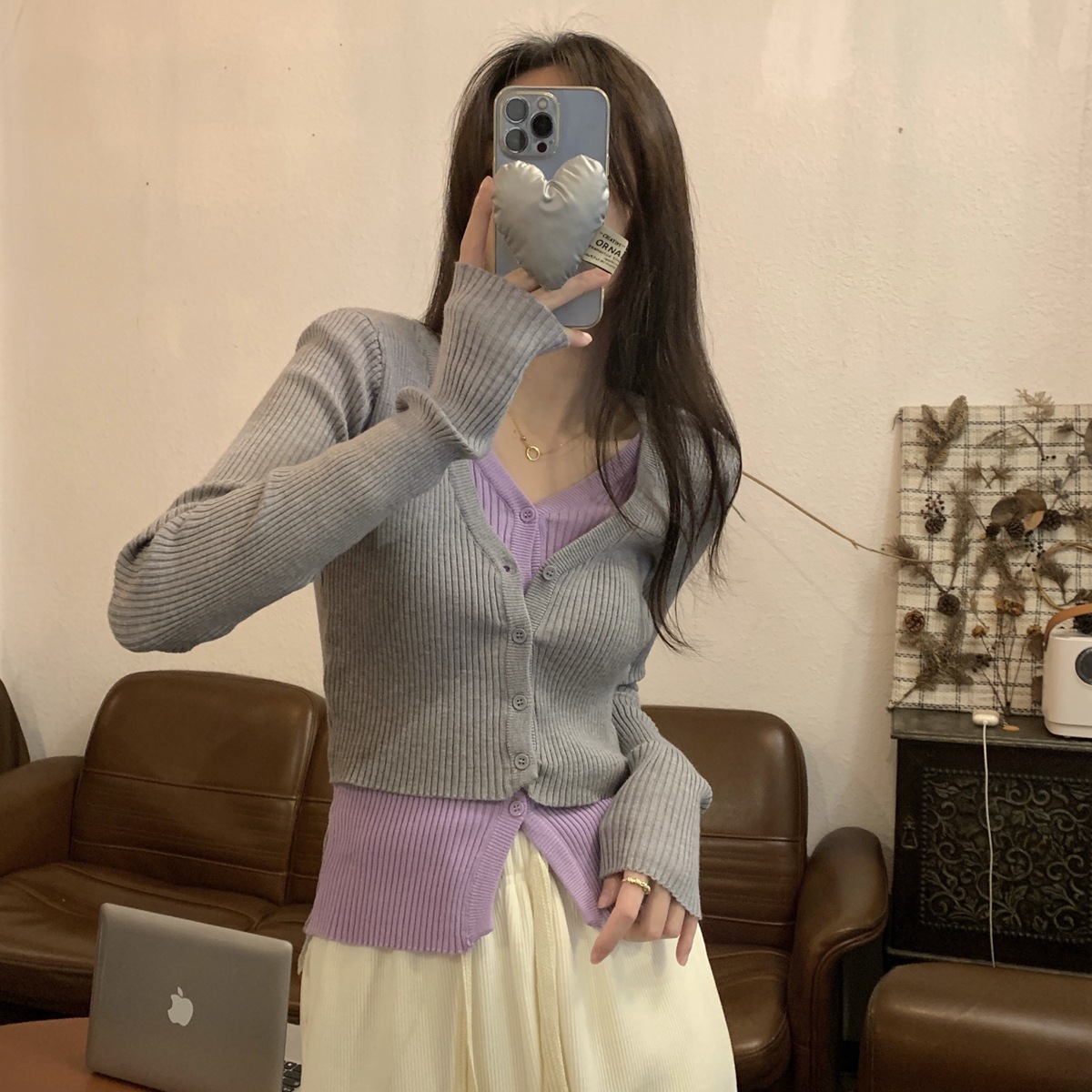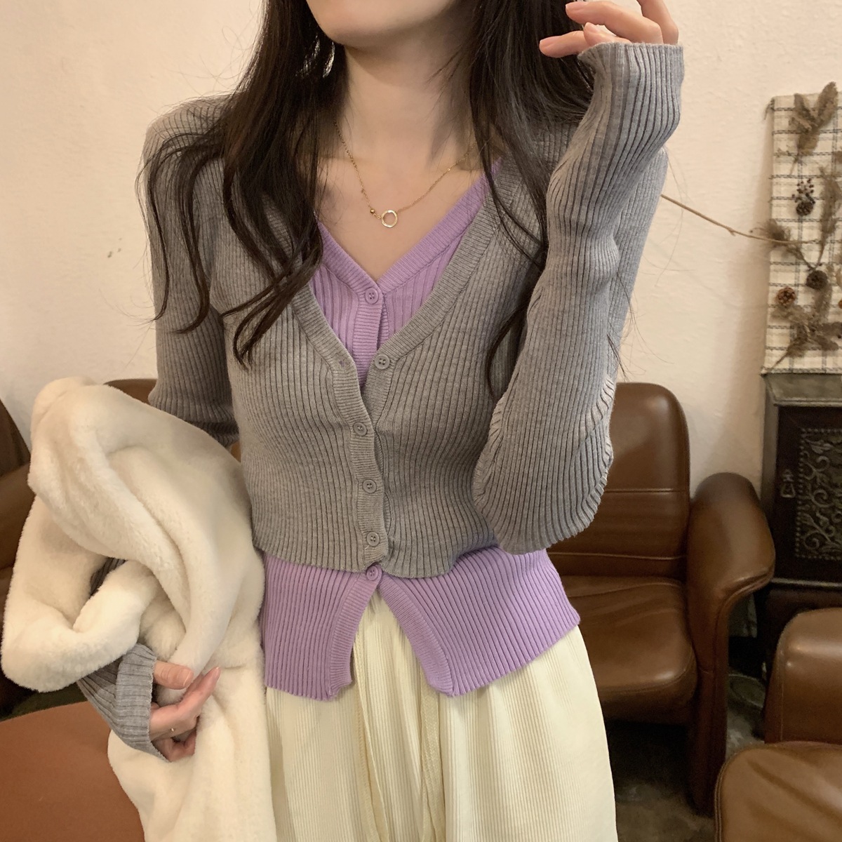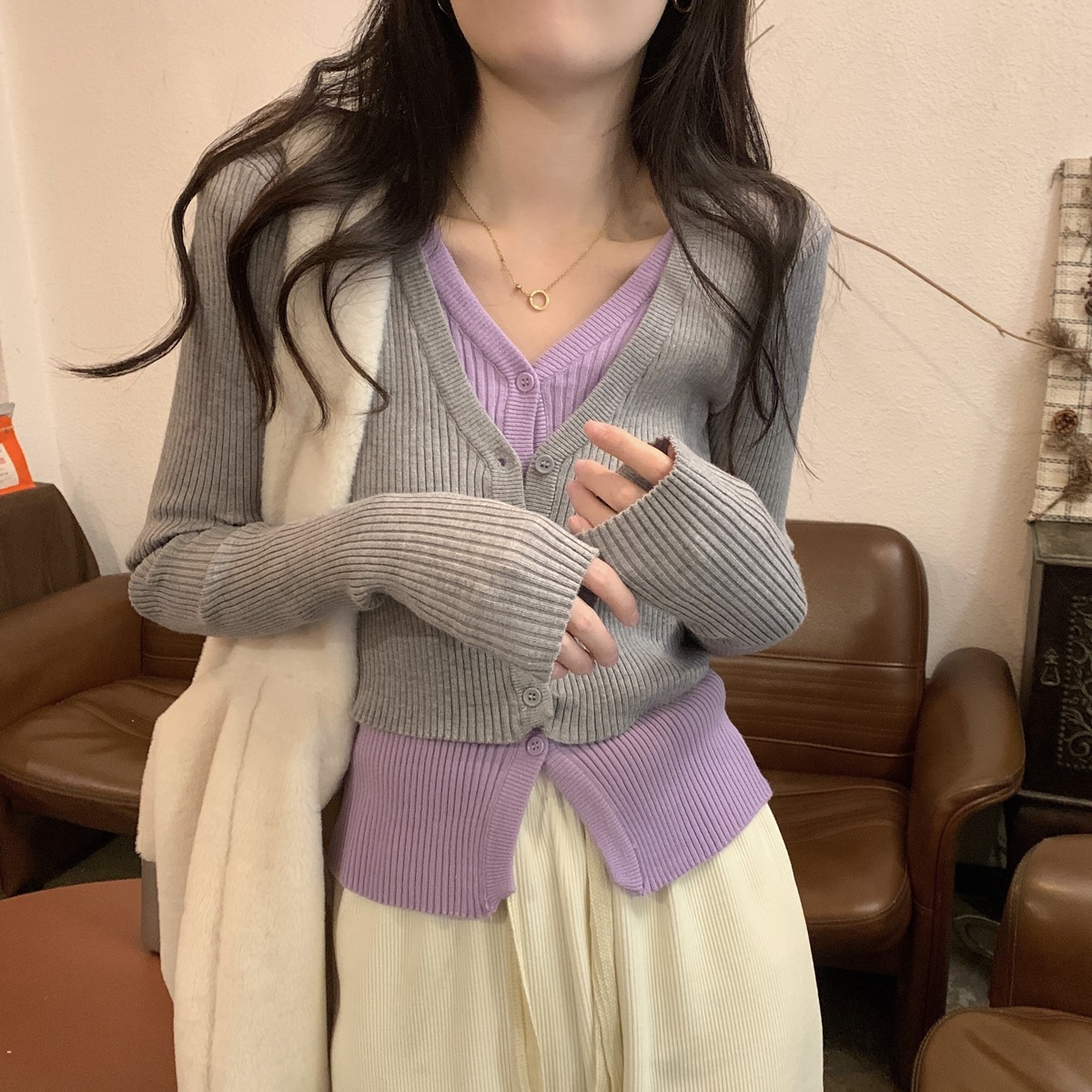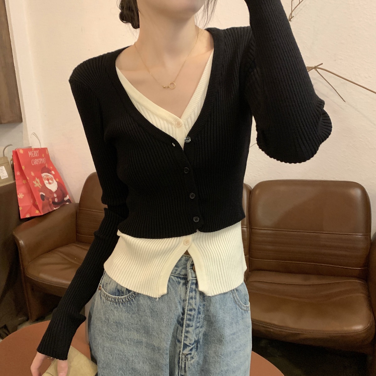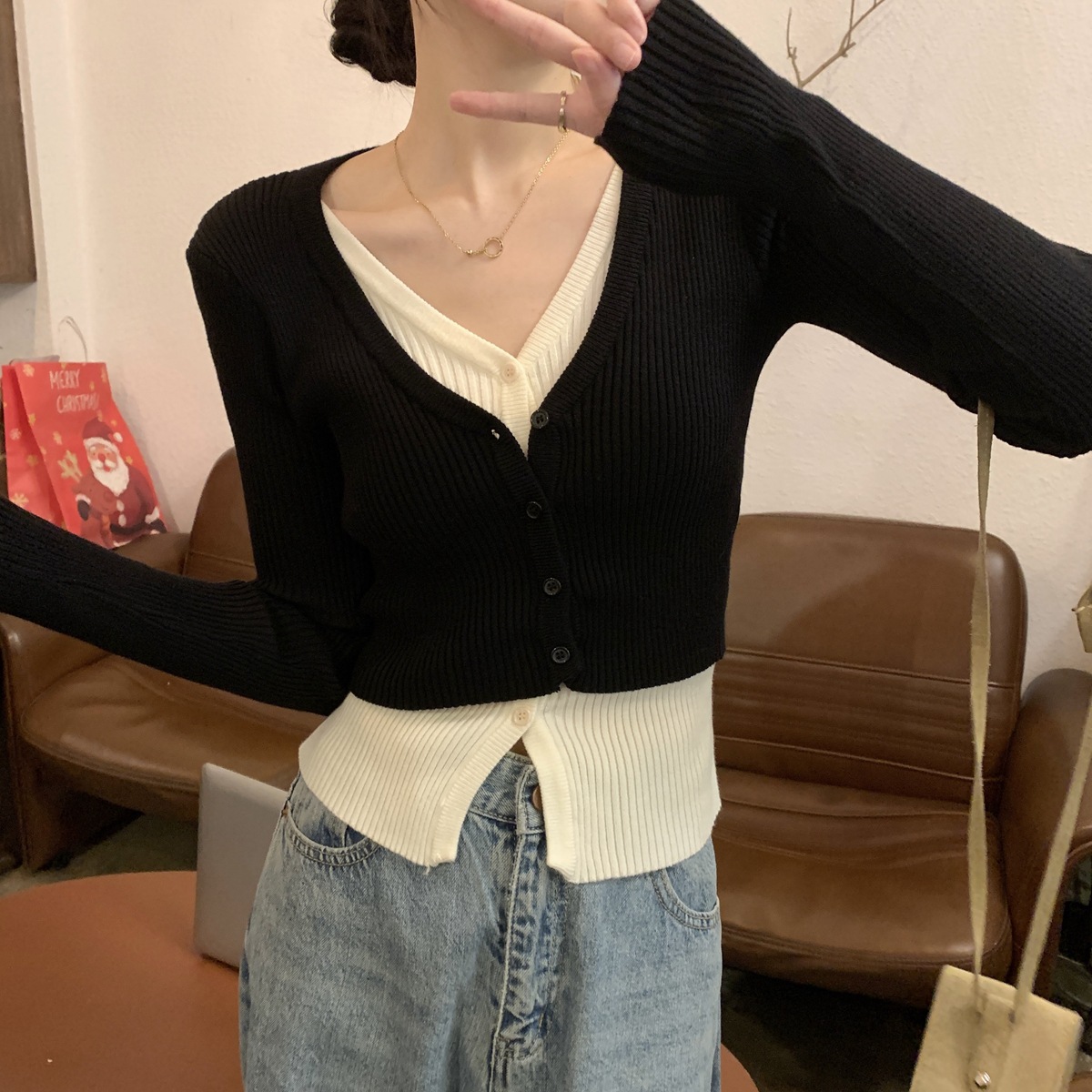JMA-045实拍 新款韩版修身v领撞色假两件打底衫针织开衫内搭毛衣