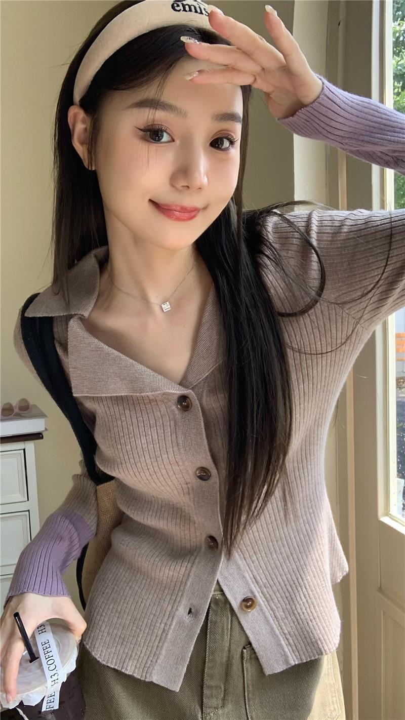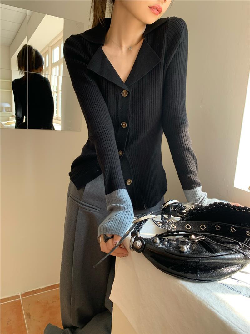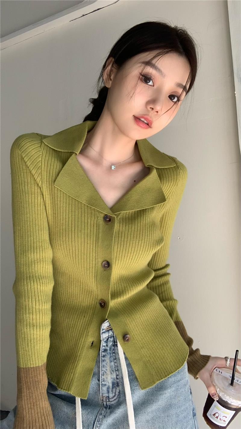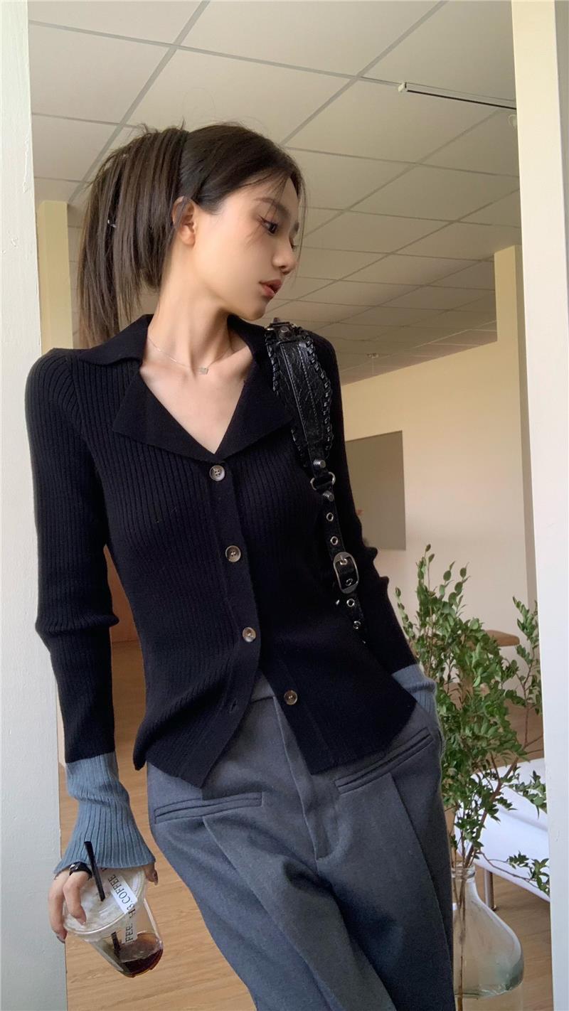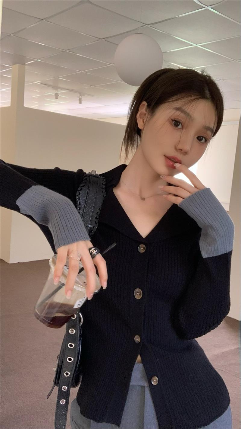 JMA-047 实拍 小众设计感撞色针织开衫女秋季法式气质v领修身毛衣坑条上衣