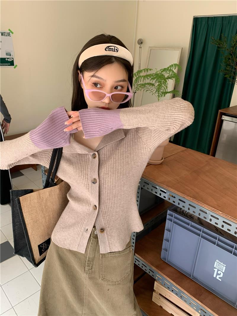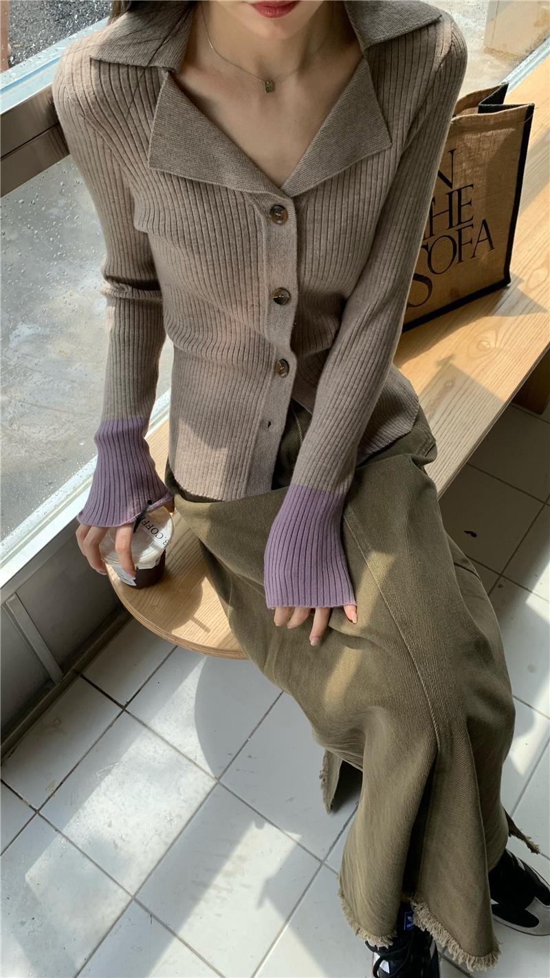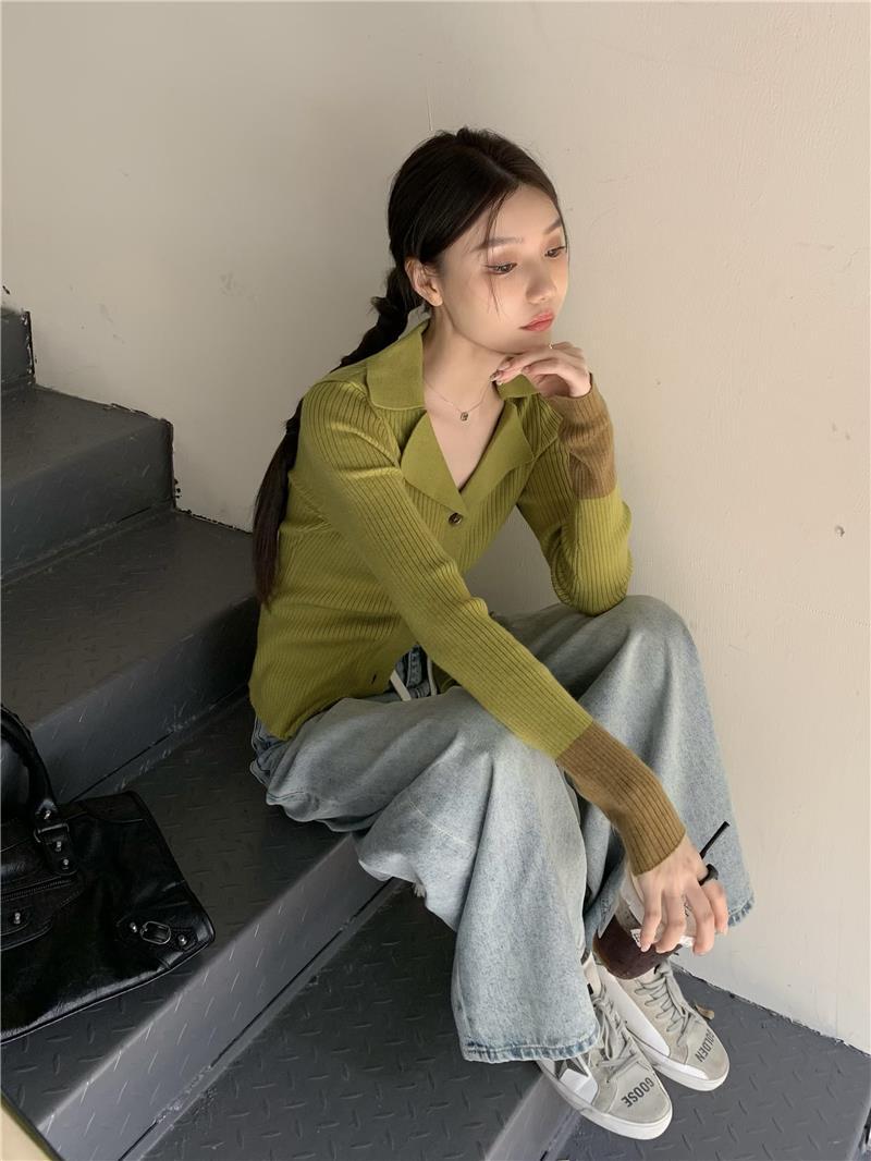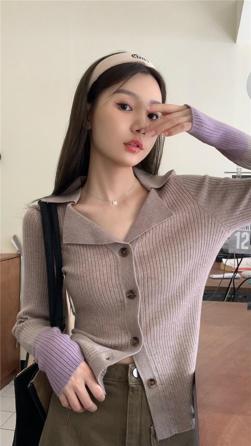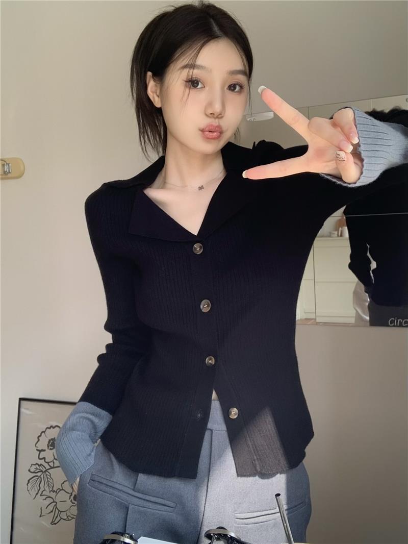 JMA-047 实拍 小众设计感撞色针织开衫女秋季法式气质v领修身毛衣坑条上衣