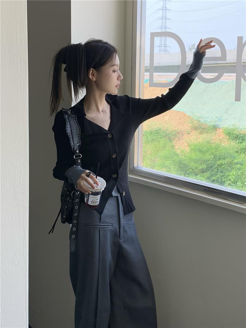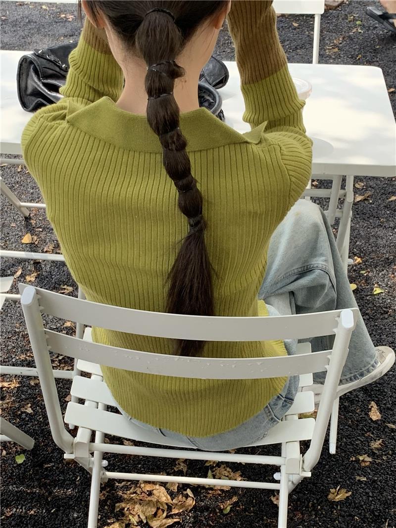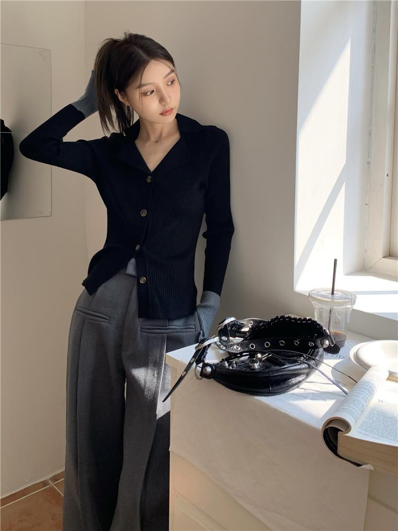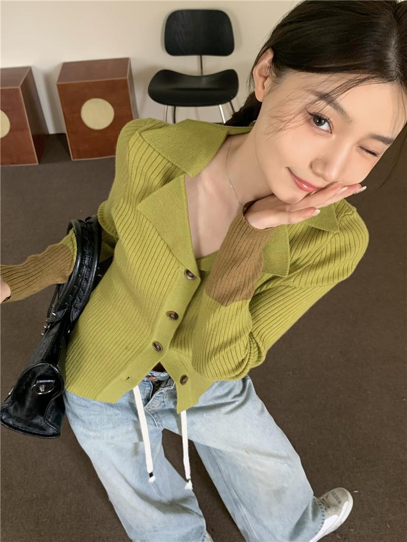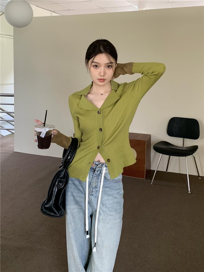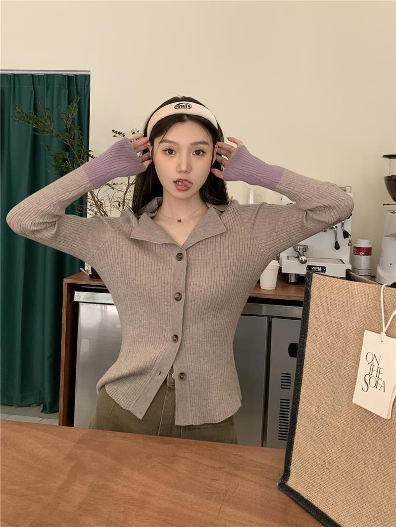JMA-047 实拍 小众设计感撞色针织开衫女秋季法式气质v领修身毛衣坑条上衣