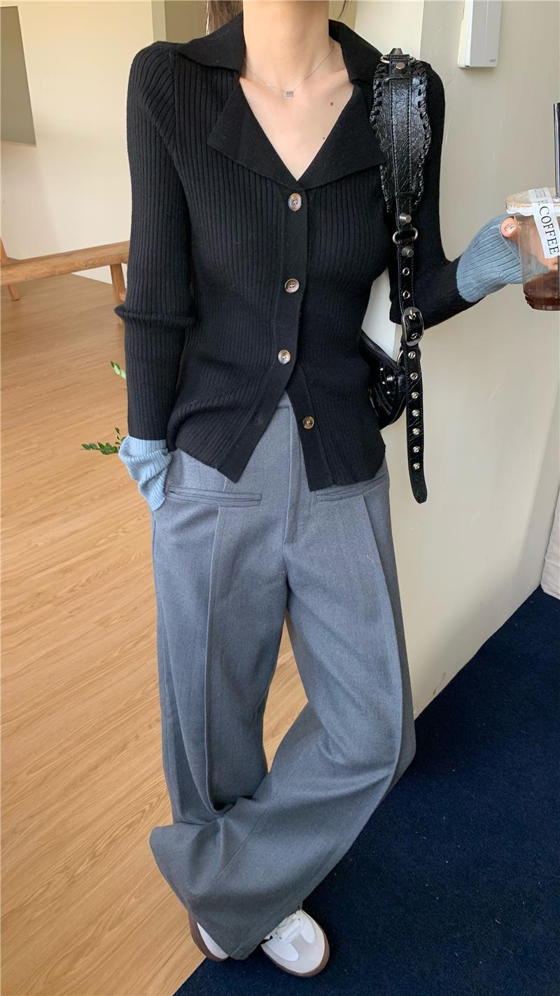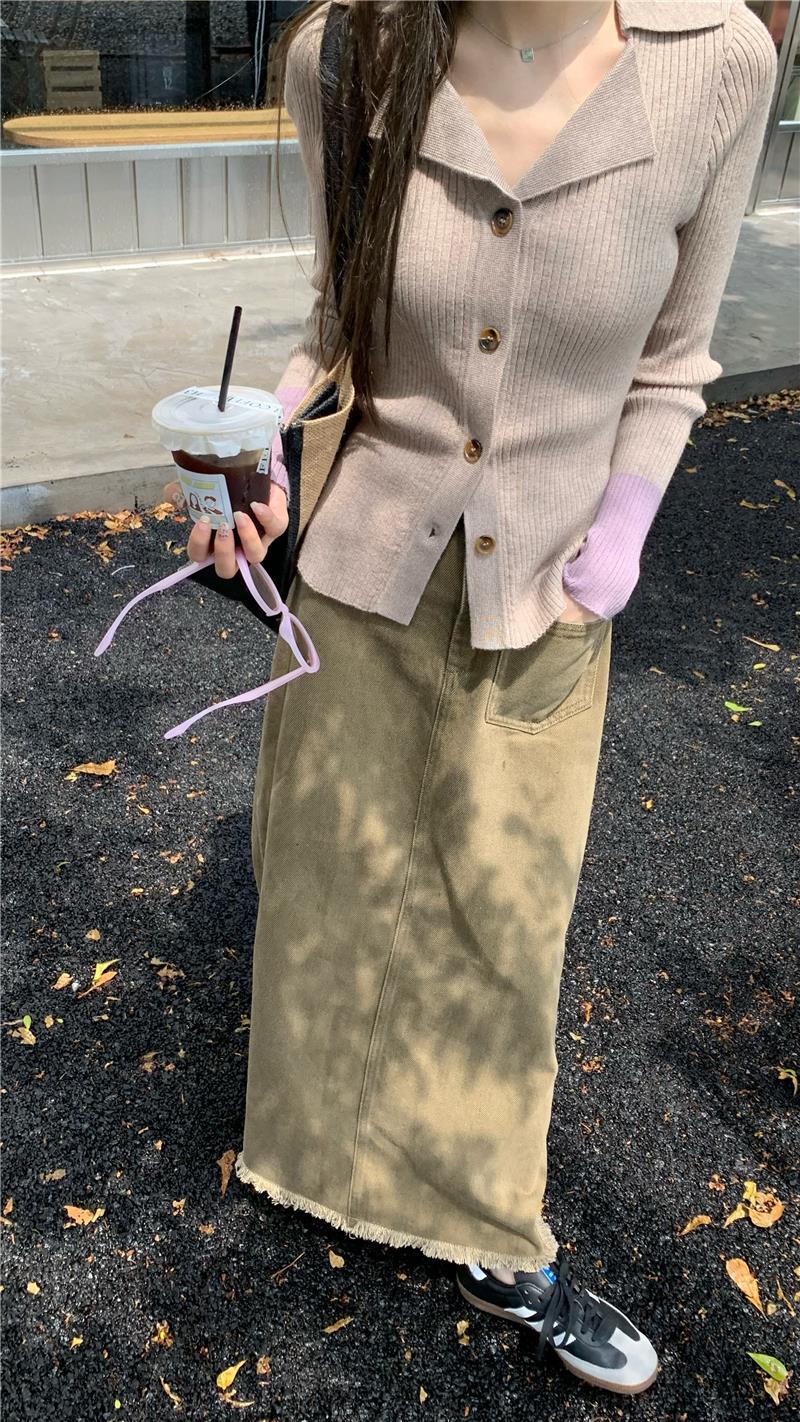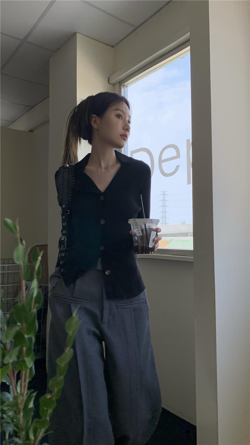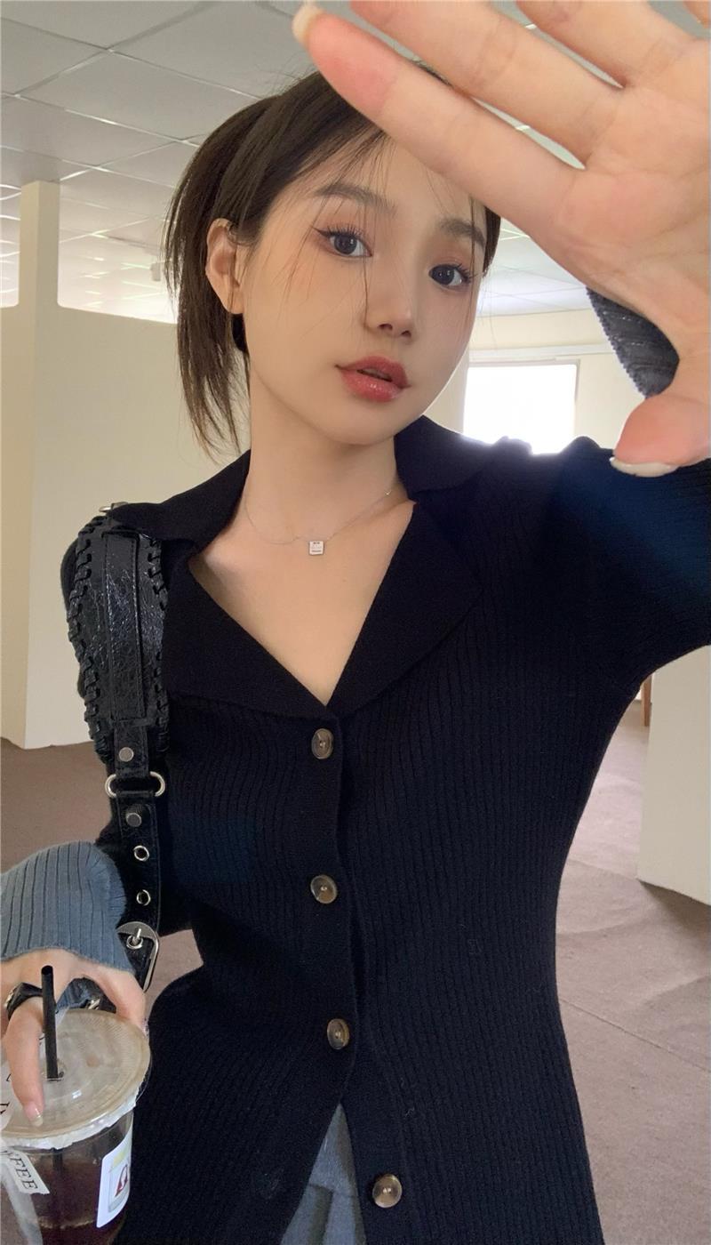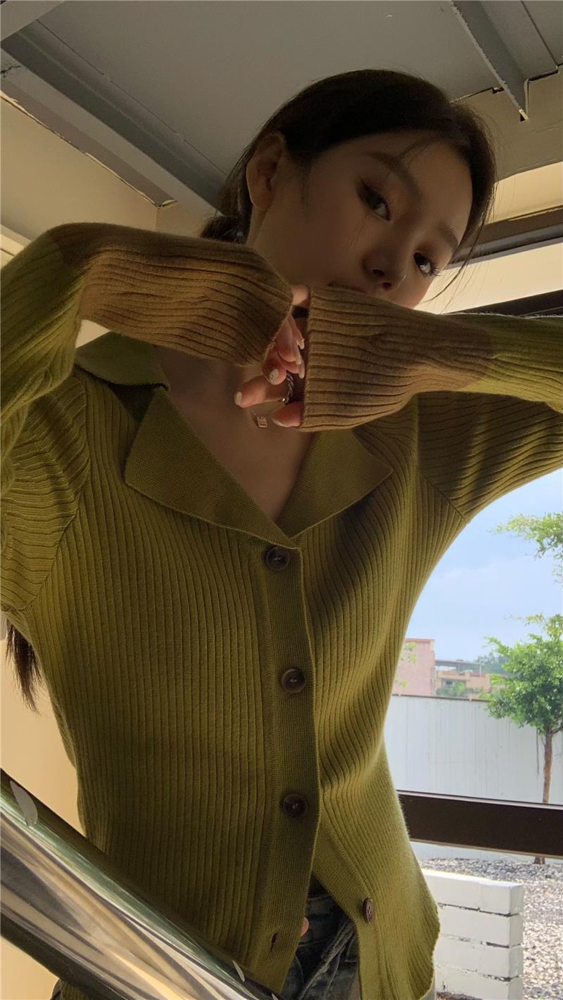 JMA-047 实拍 小众设计感撞色针织开衫女秋季法式气质v领修身毛衣坑条上衣