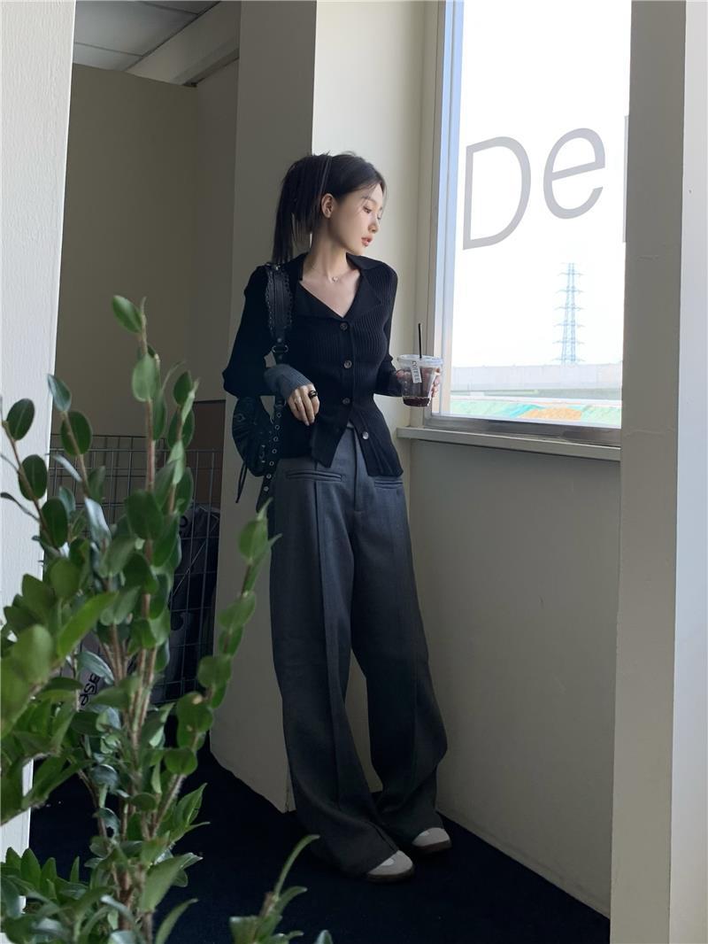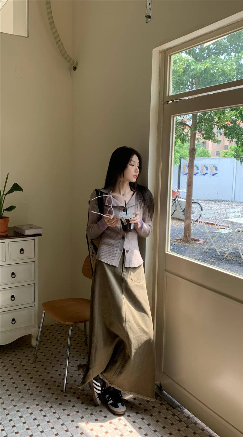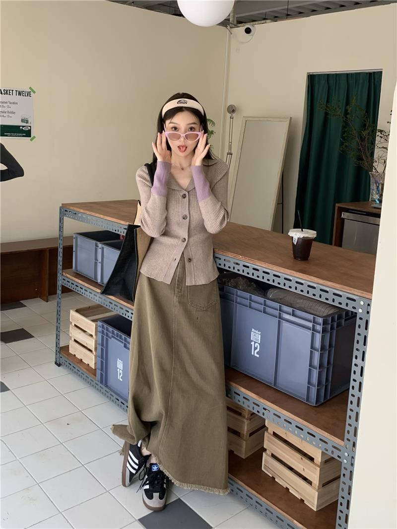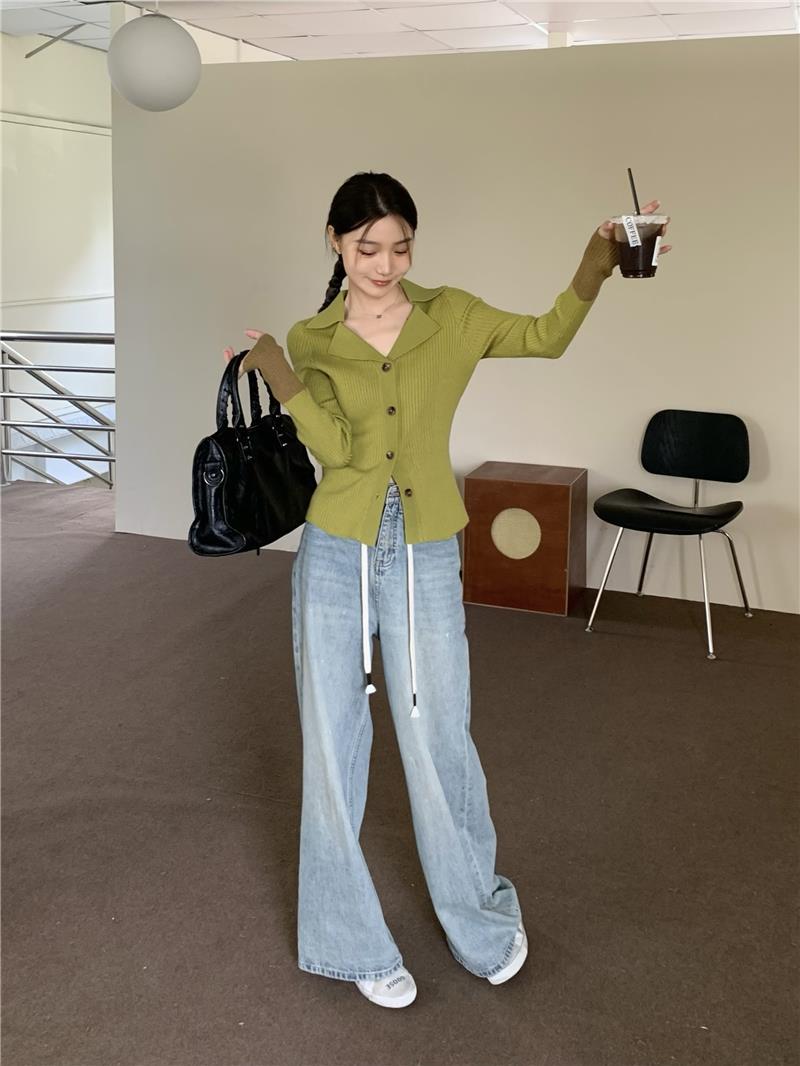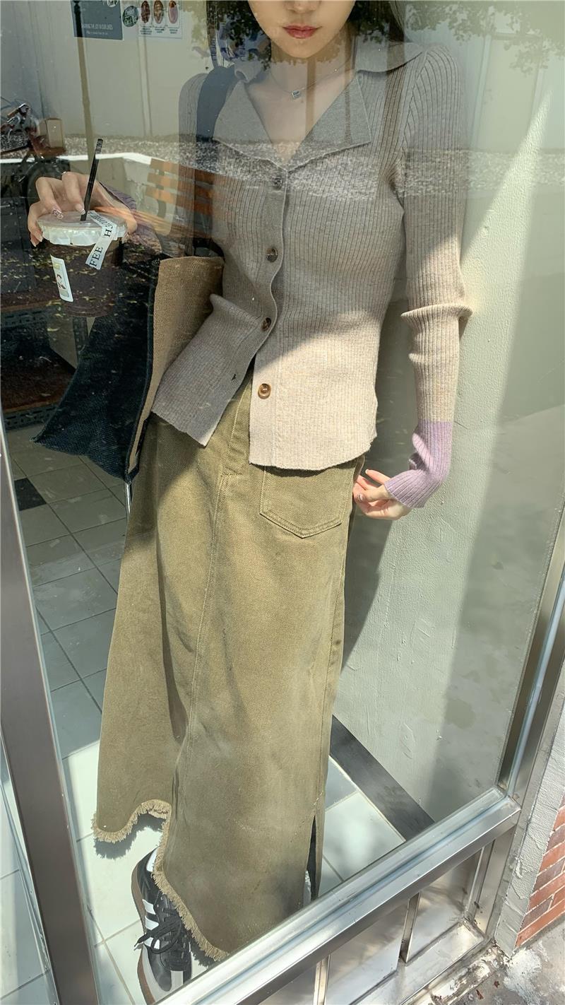 JMA-047 实拍 小众设计感撞色针织开衫女秋季法式气质v领修身毛衣坑条上衣