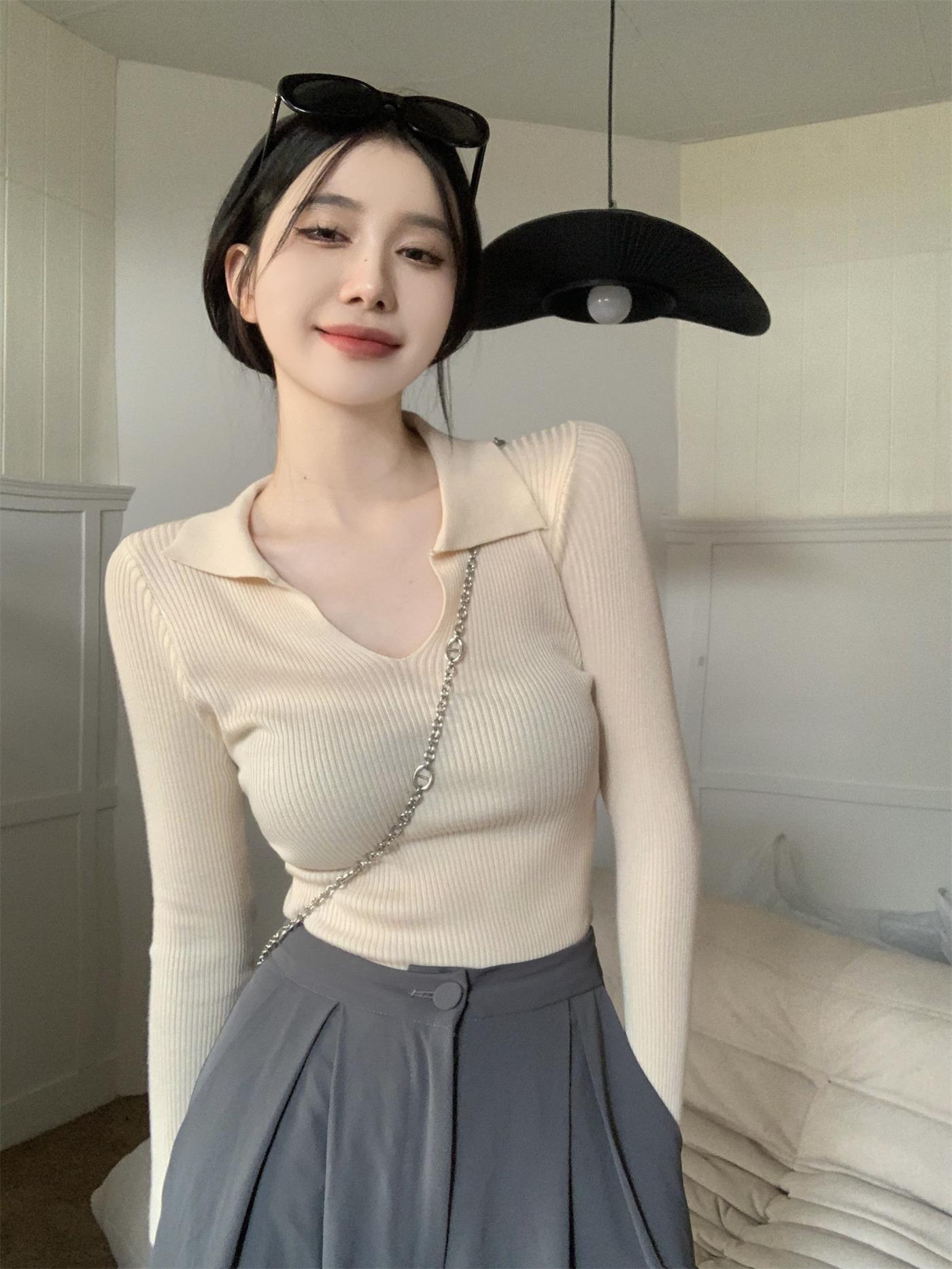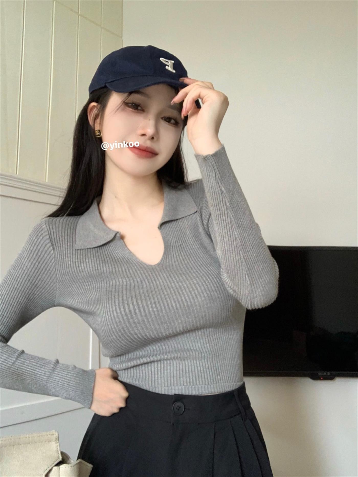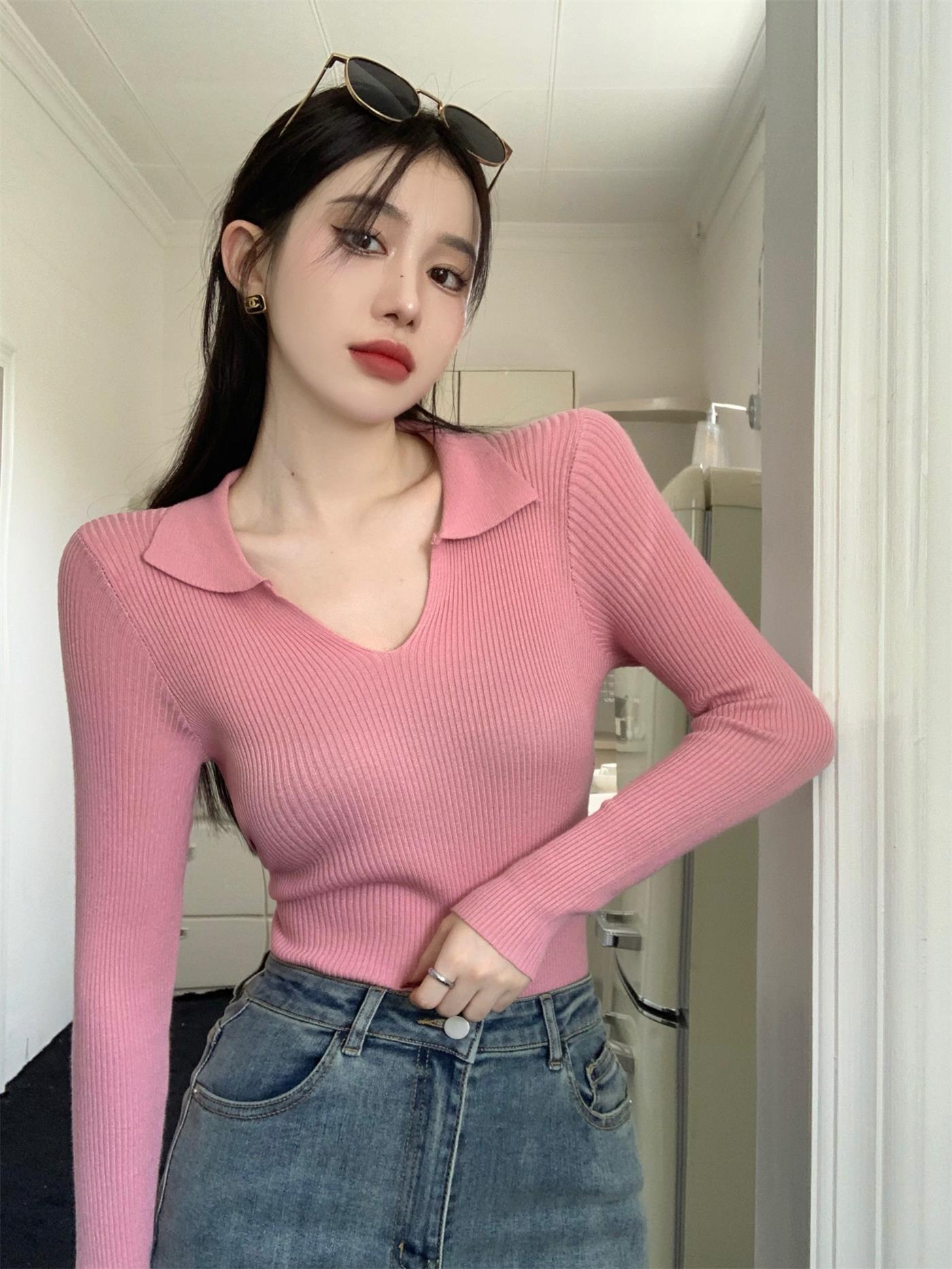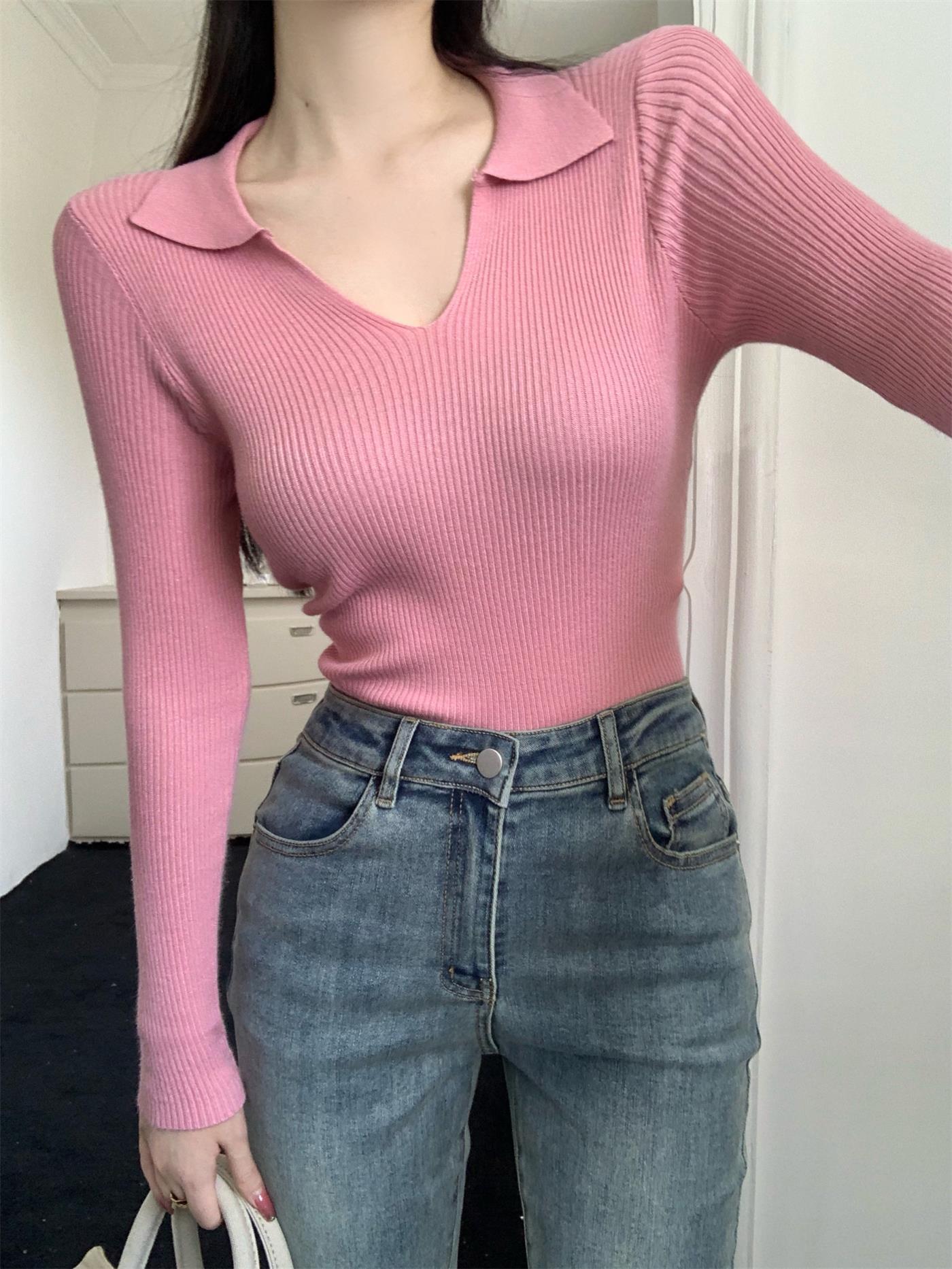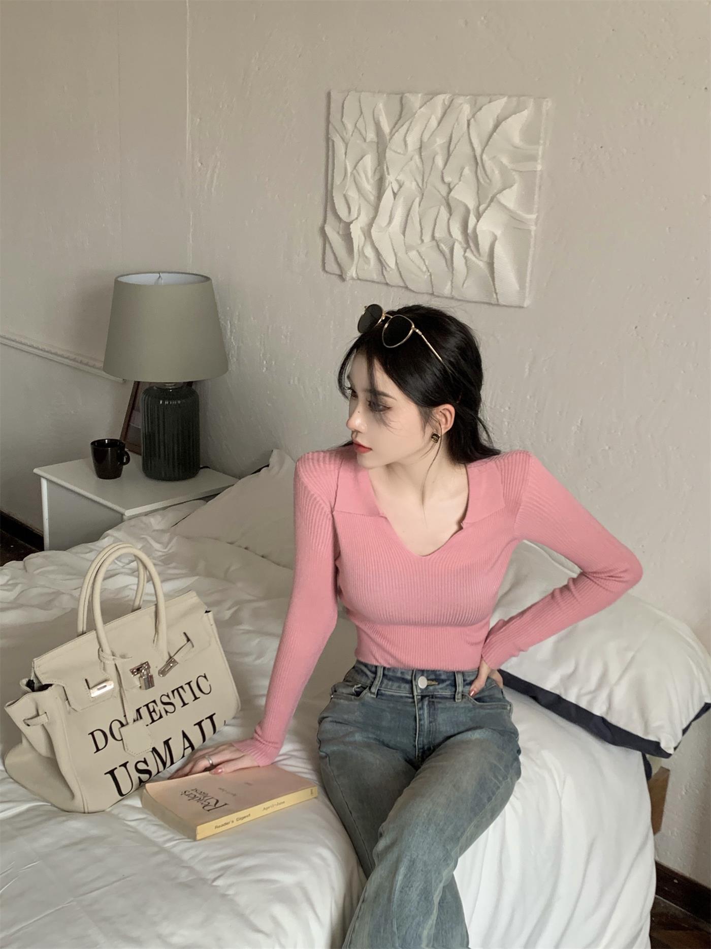 JMA-055 秋季新款韩系修身显瘦长袖辣妹V领修身短款打底针织衫上衣女
