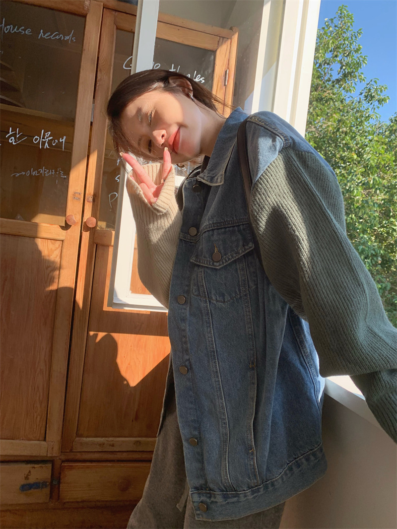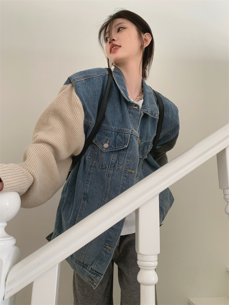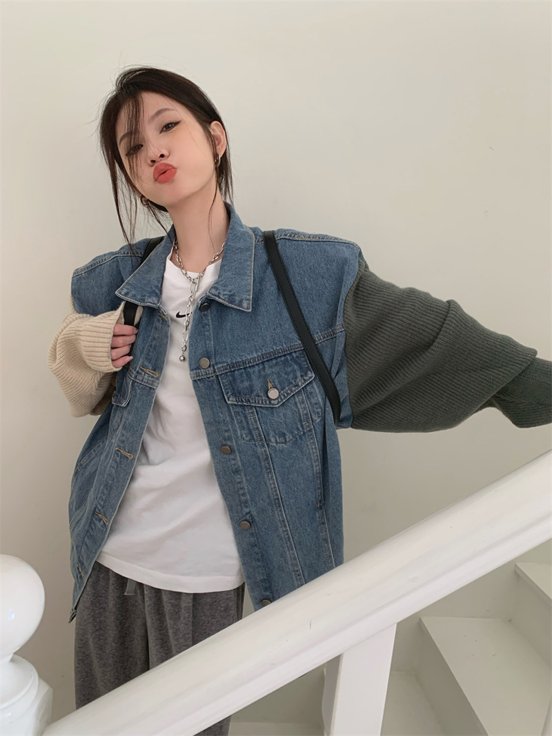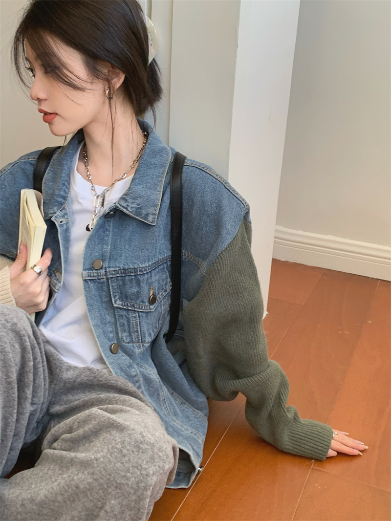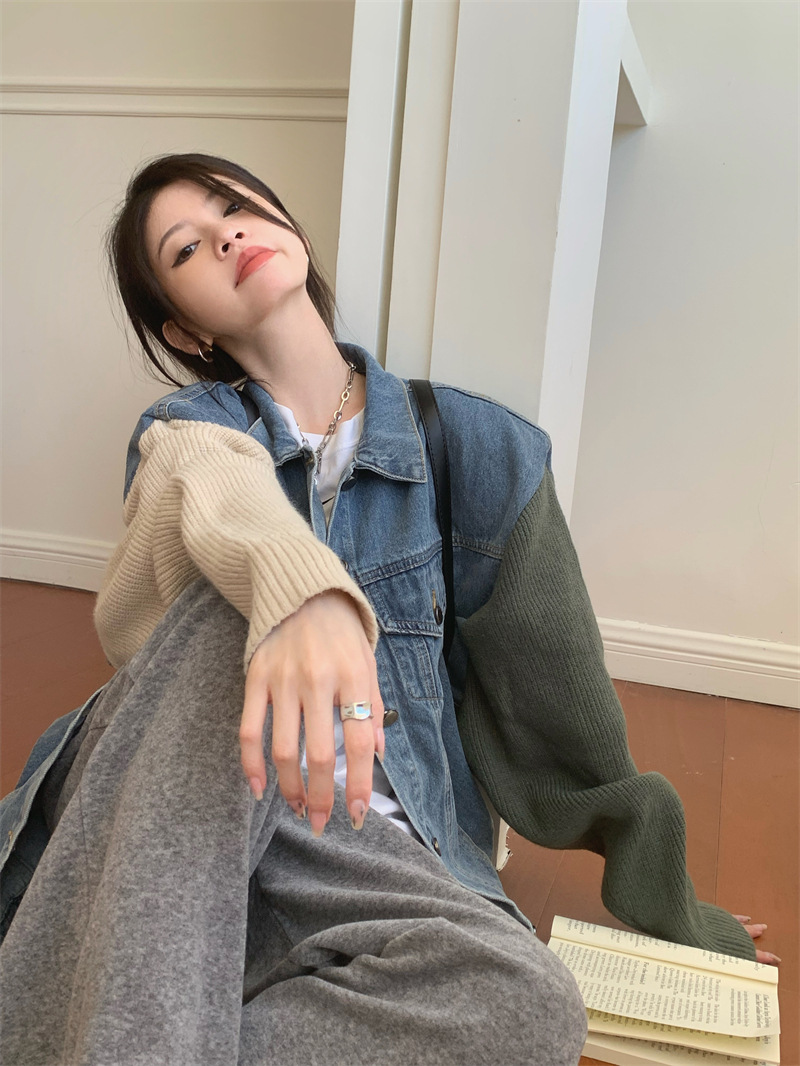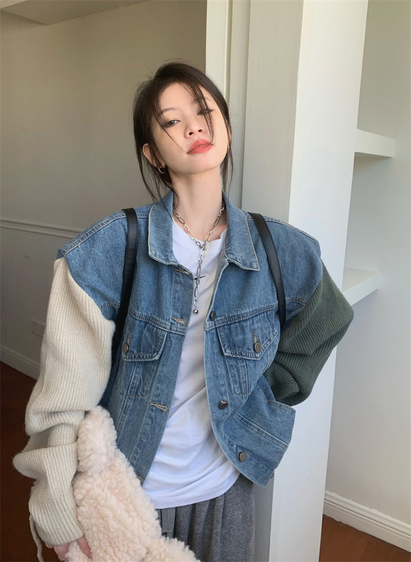 JMA-056 实拍 秋冬ins韩版洗水重工高级感撞色针织拼接牛仔外套上衣女