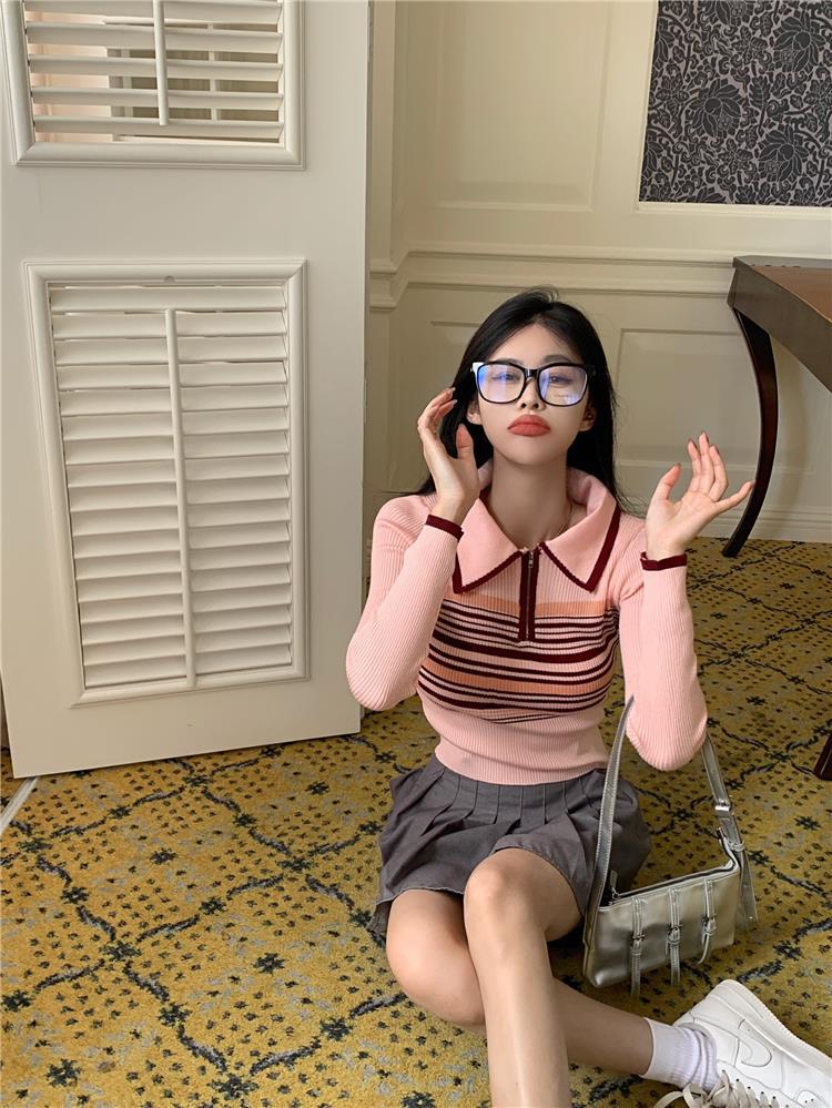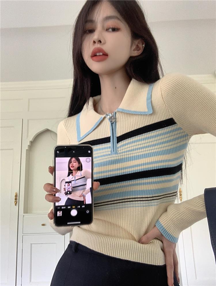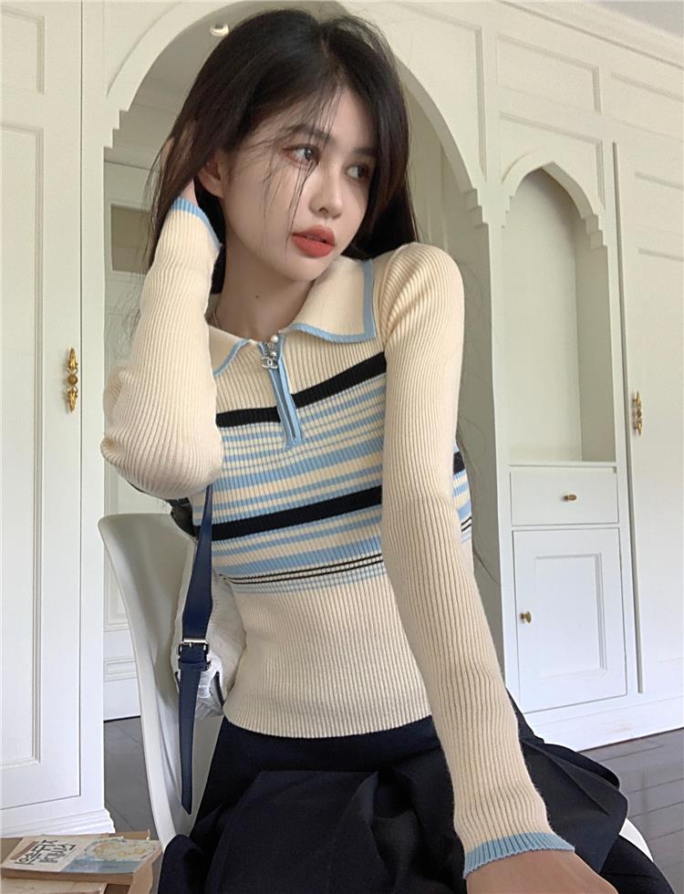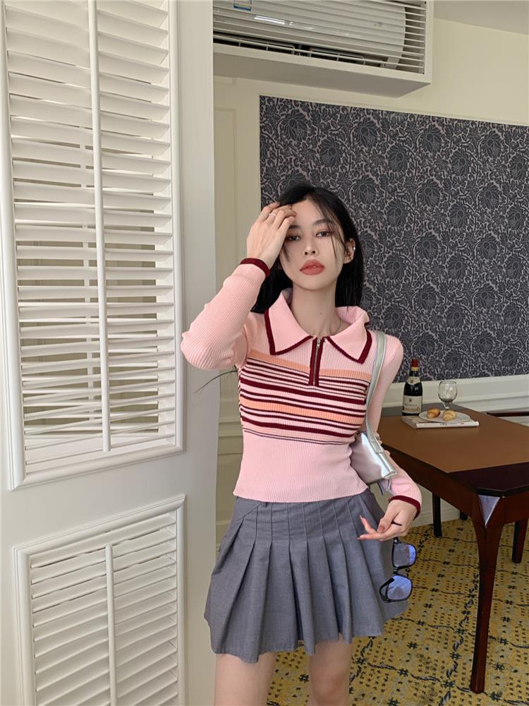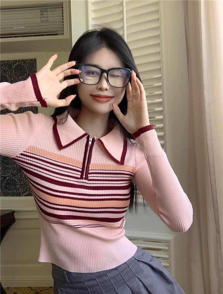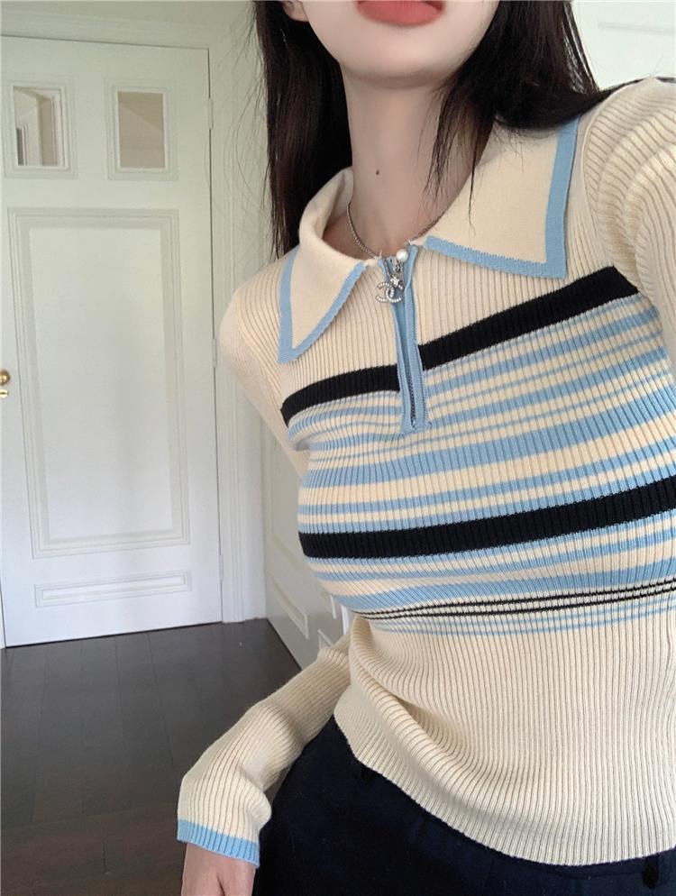 JMA-060 实拍 韩系chic修身撞色条纹针织衫女秋季长袖polo领设计感上衣潮