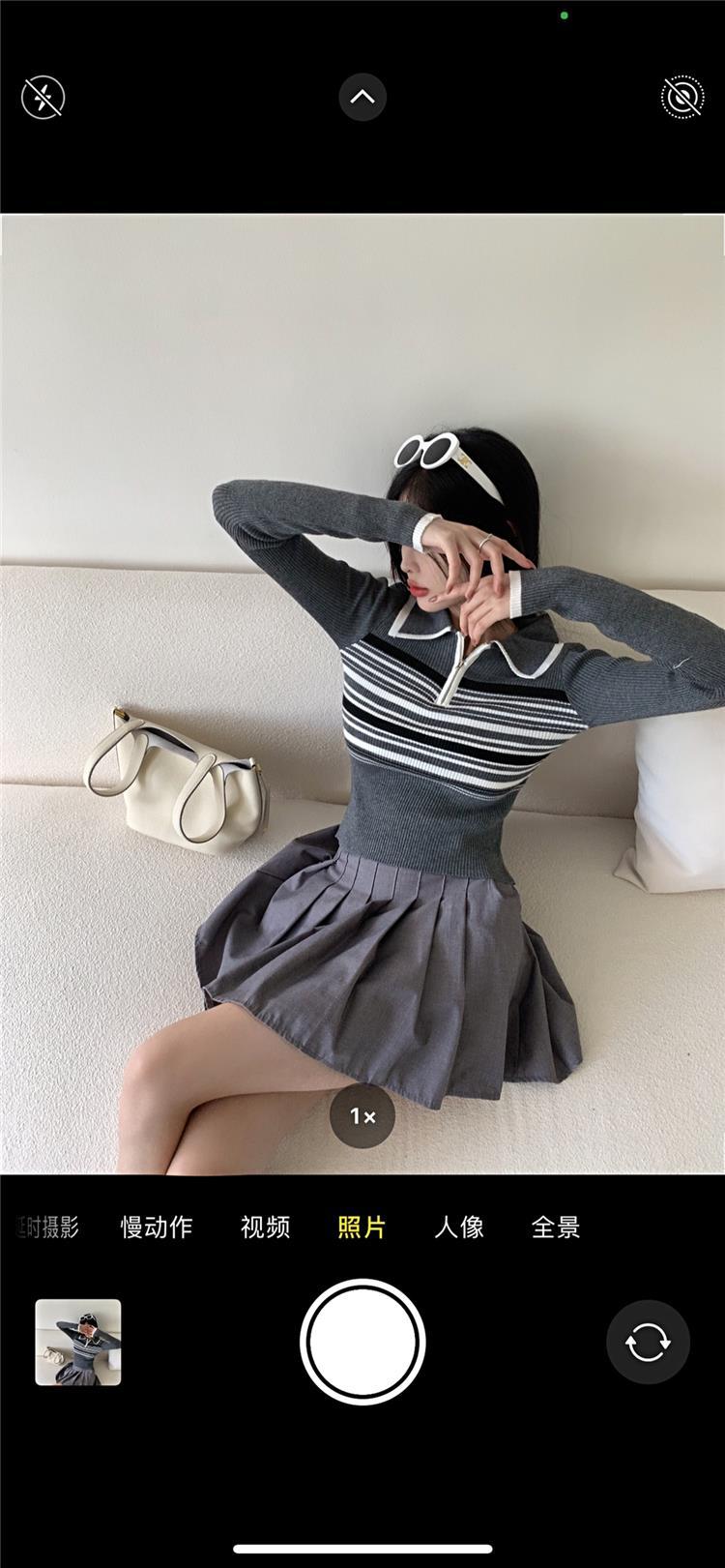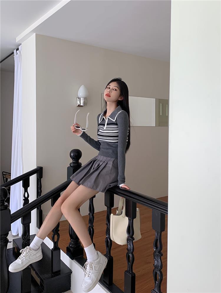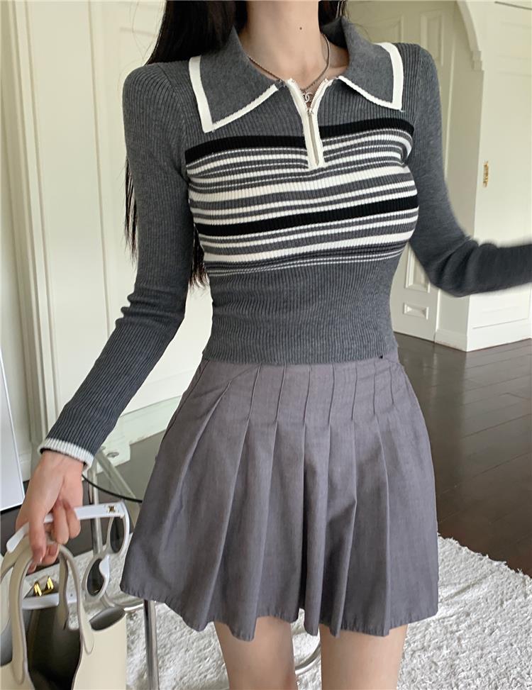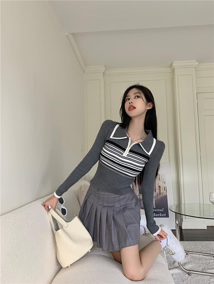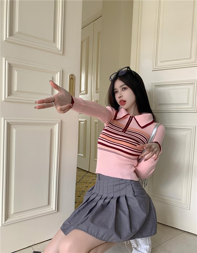 JMA-060 实拍 韩系chic修身撞色条纹针织衫女秋季长袖polo领设计感上衣潮