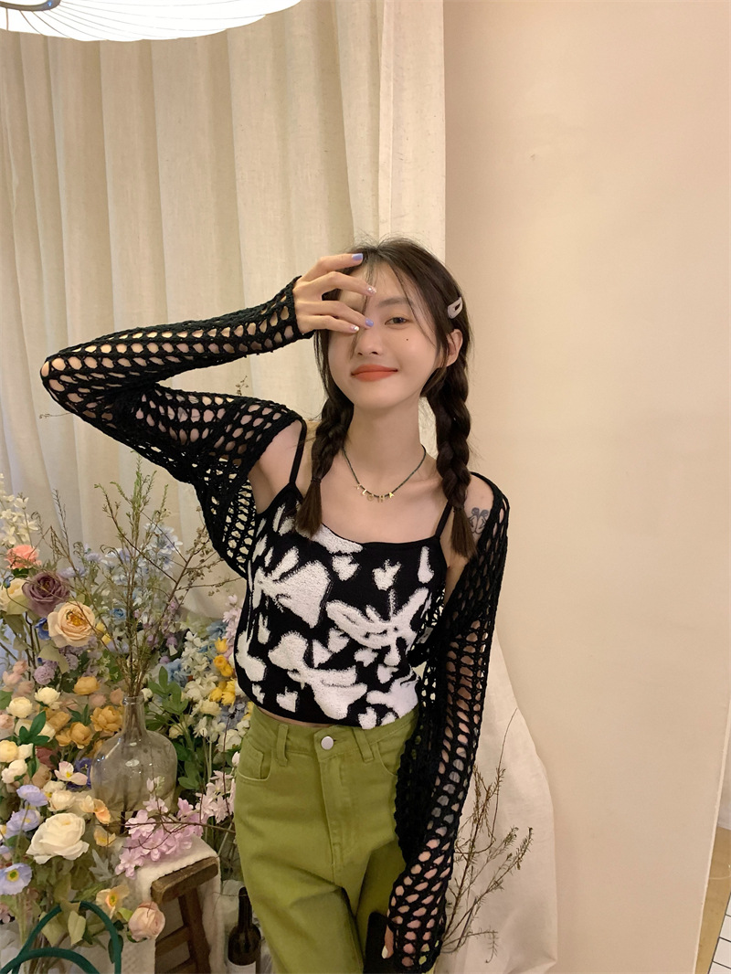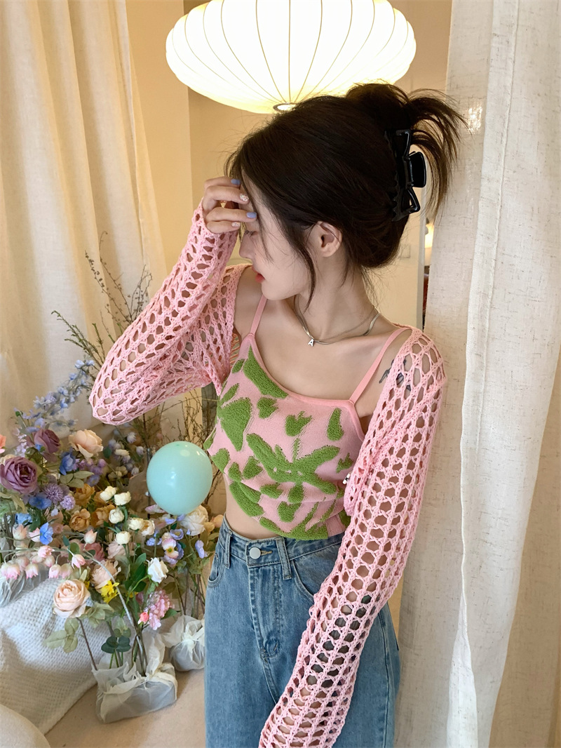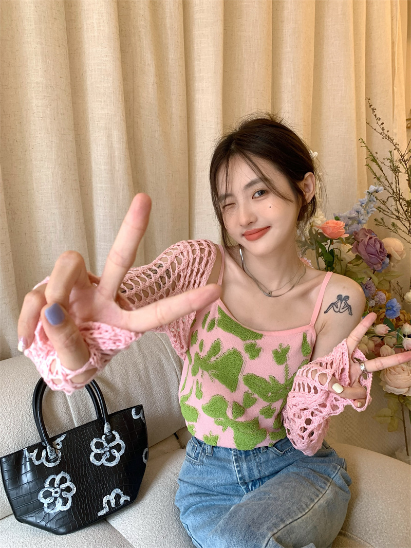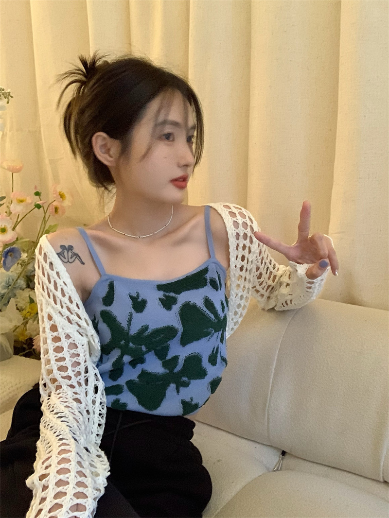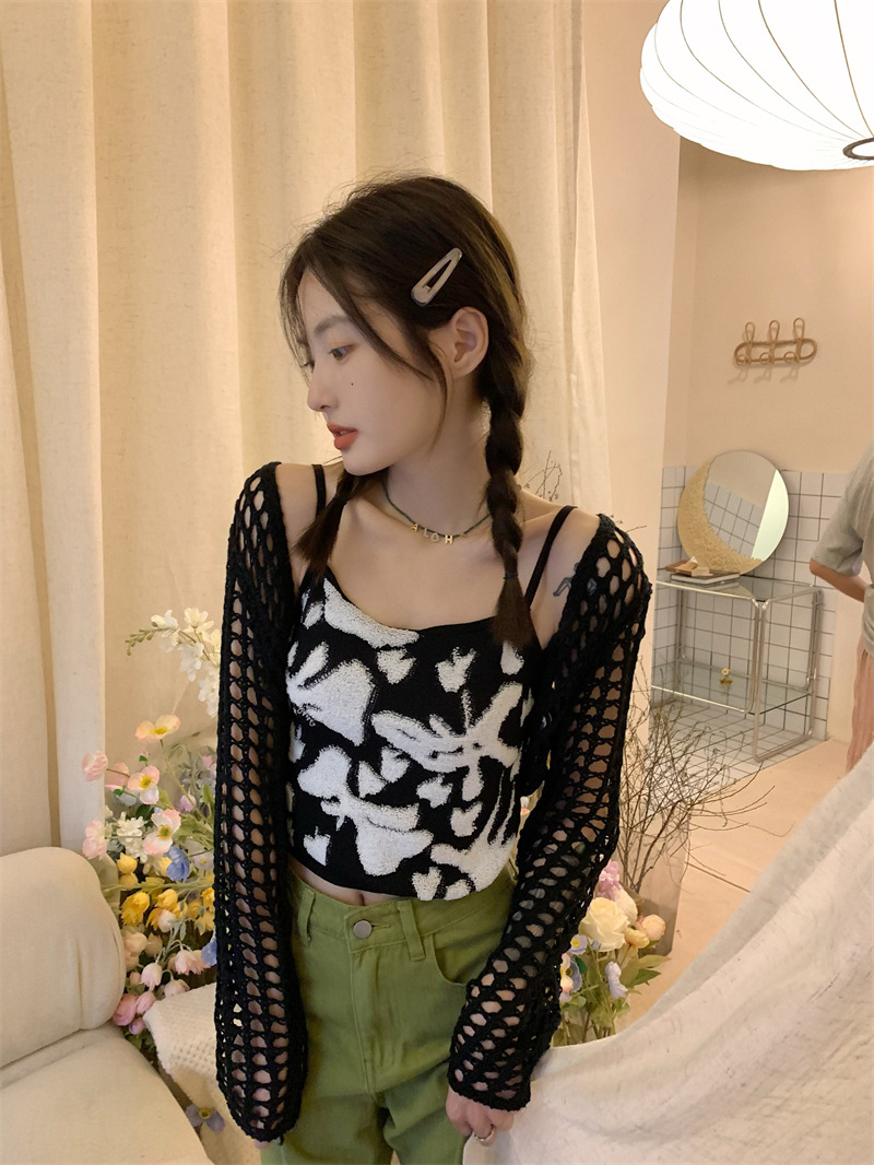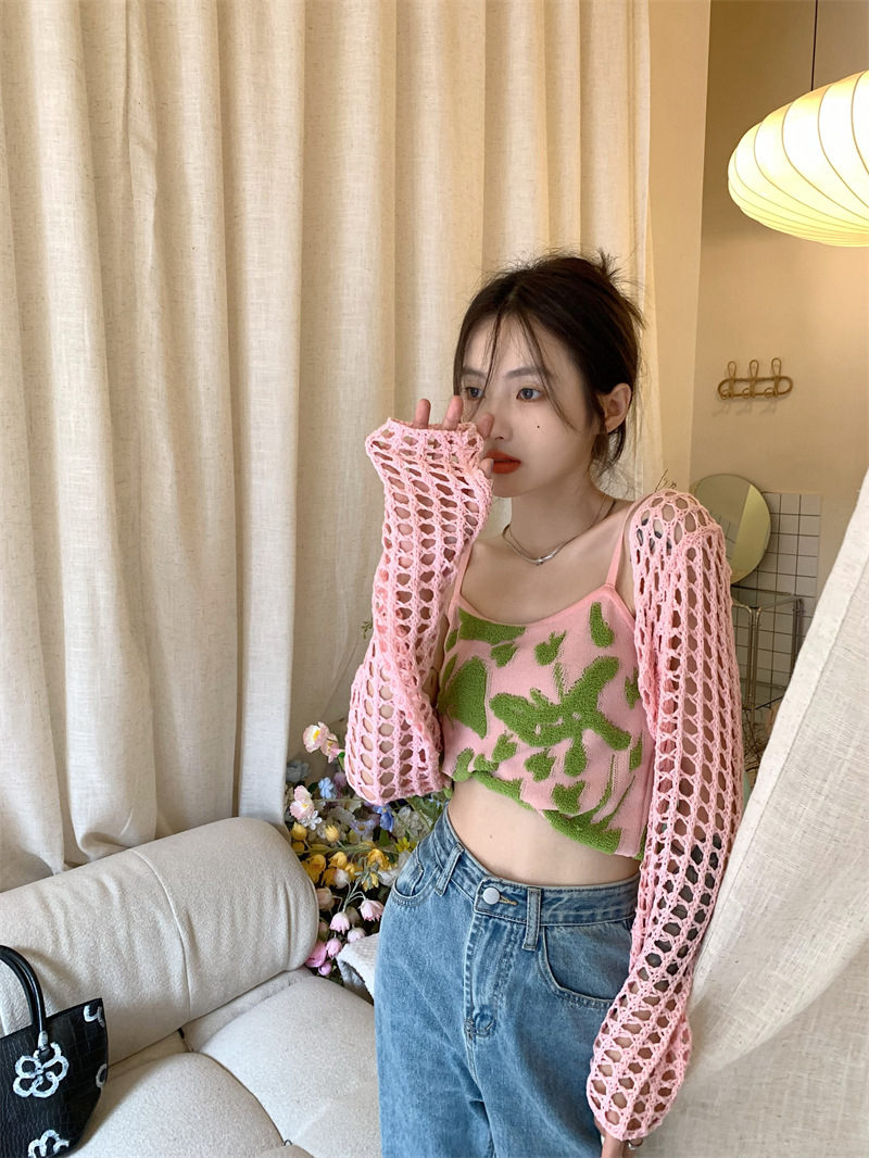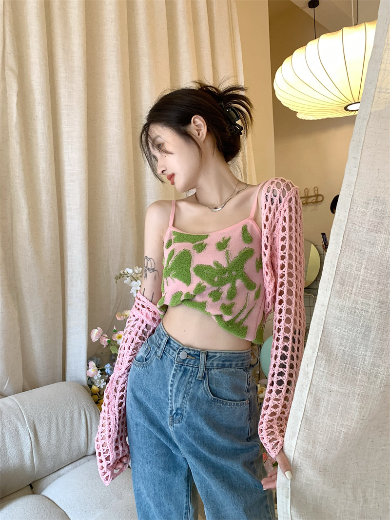 JMA-059 实拍 夏季新款韩版百搭设计感镂空针织防晒开衫+撞色提花吊带