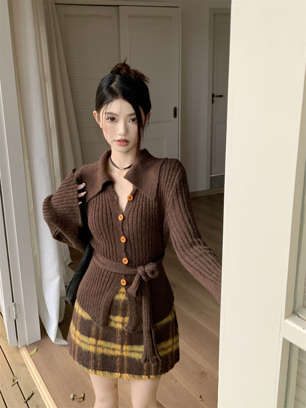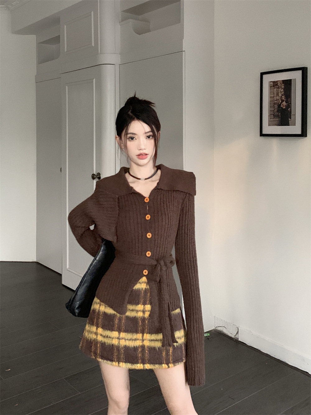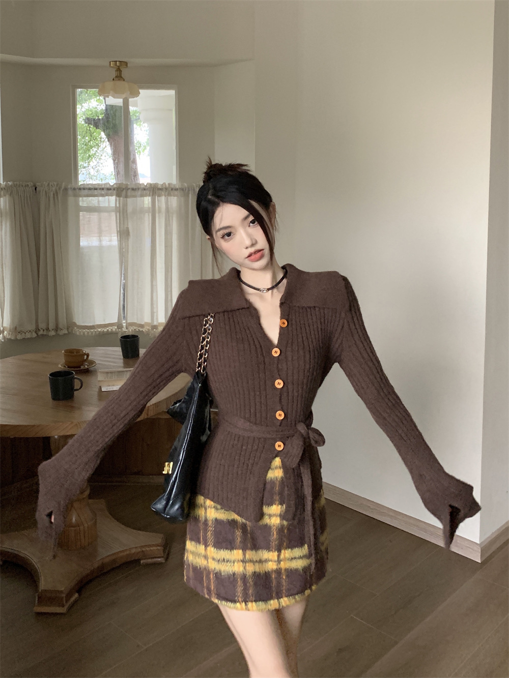 JMA-081 实拍 秋季法式V领单排扣收腰显瘦针织衫开衫+高腰格纹包臀半身裙