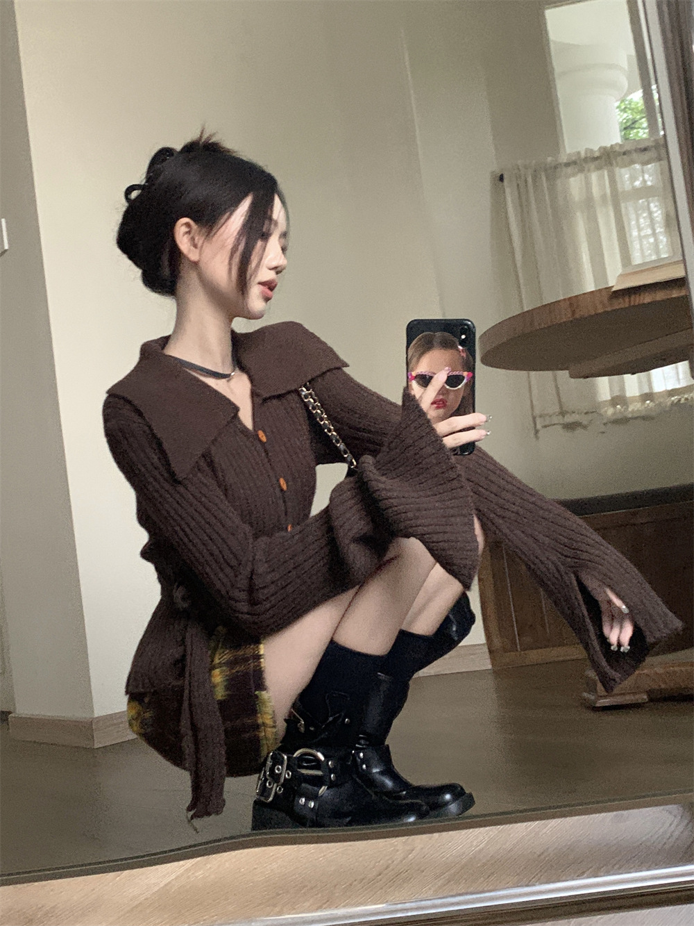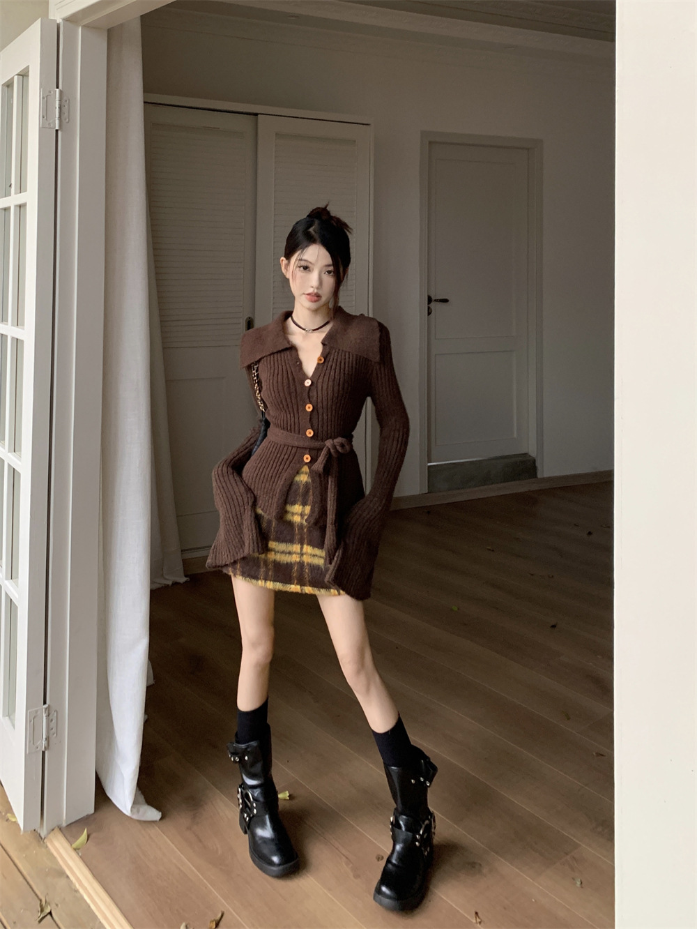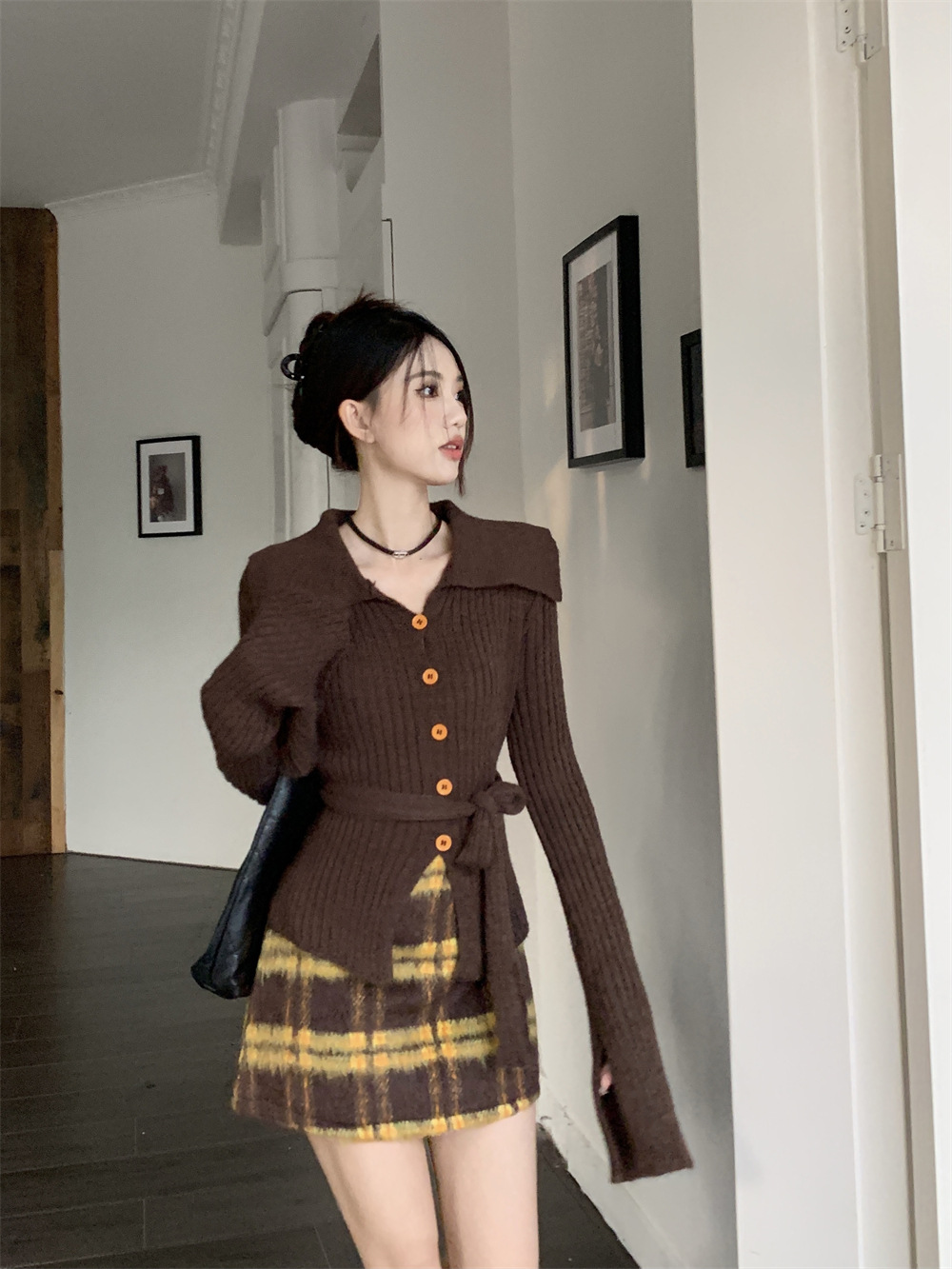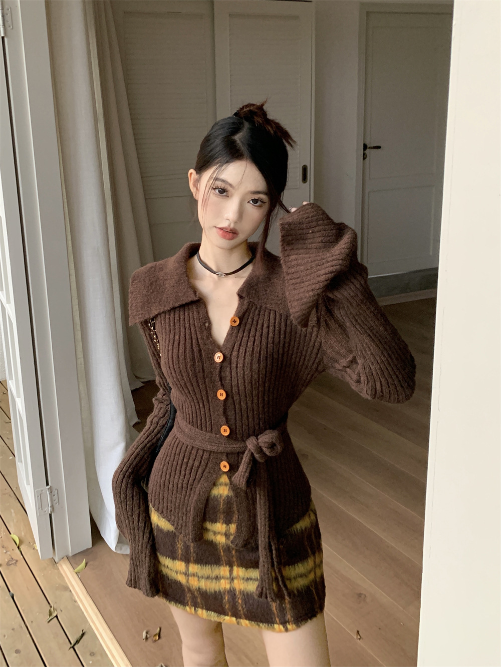 JMA-081 实拍 秋季法式V领单排扣收腰显瘦针织衫开衫+高腰格纹包臀半身裙