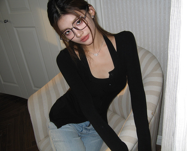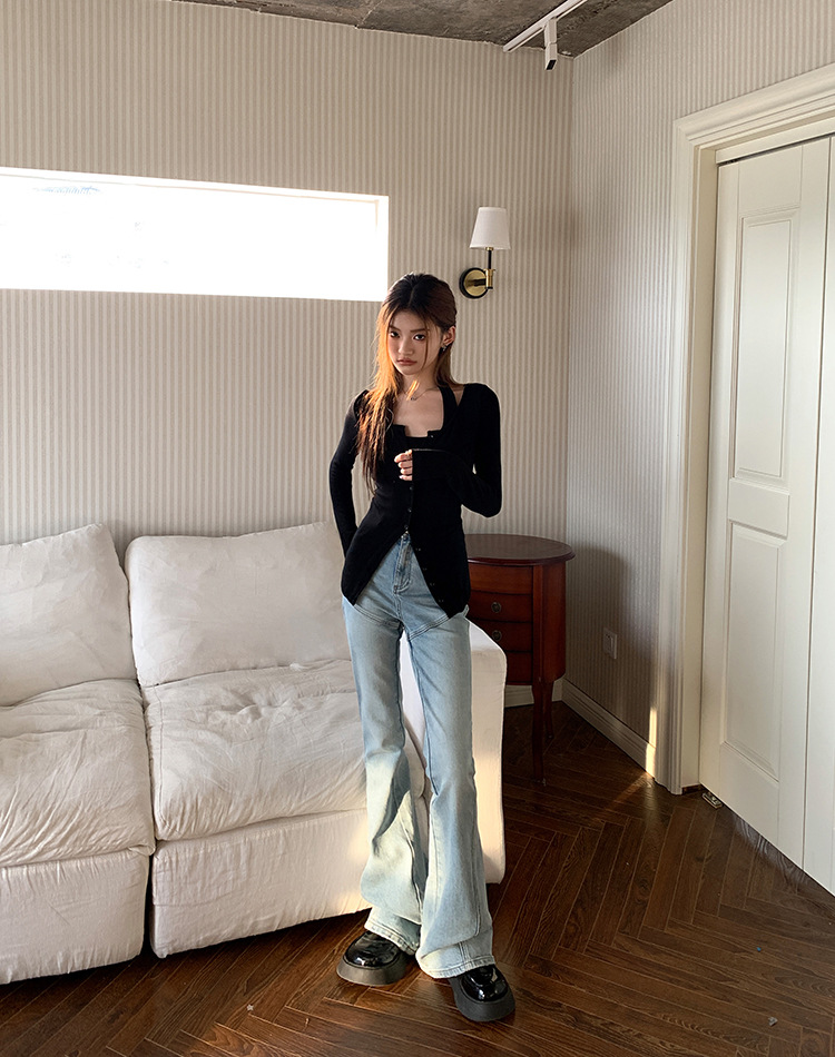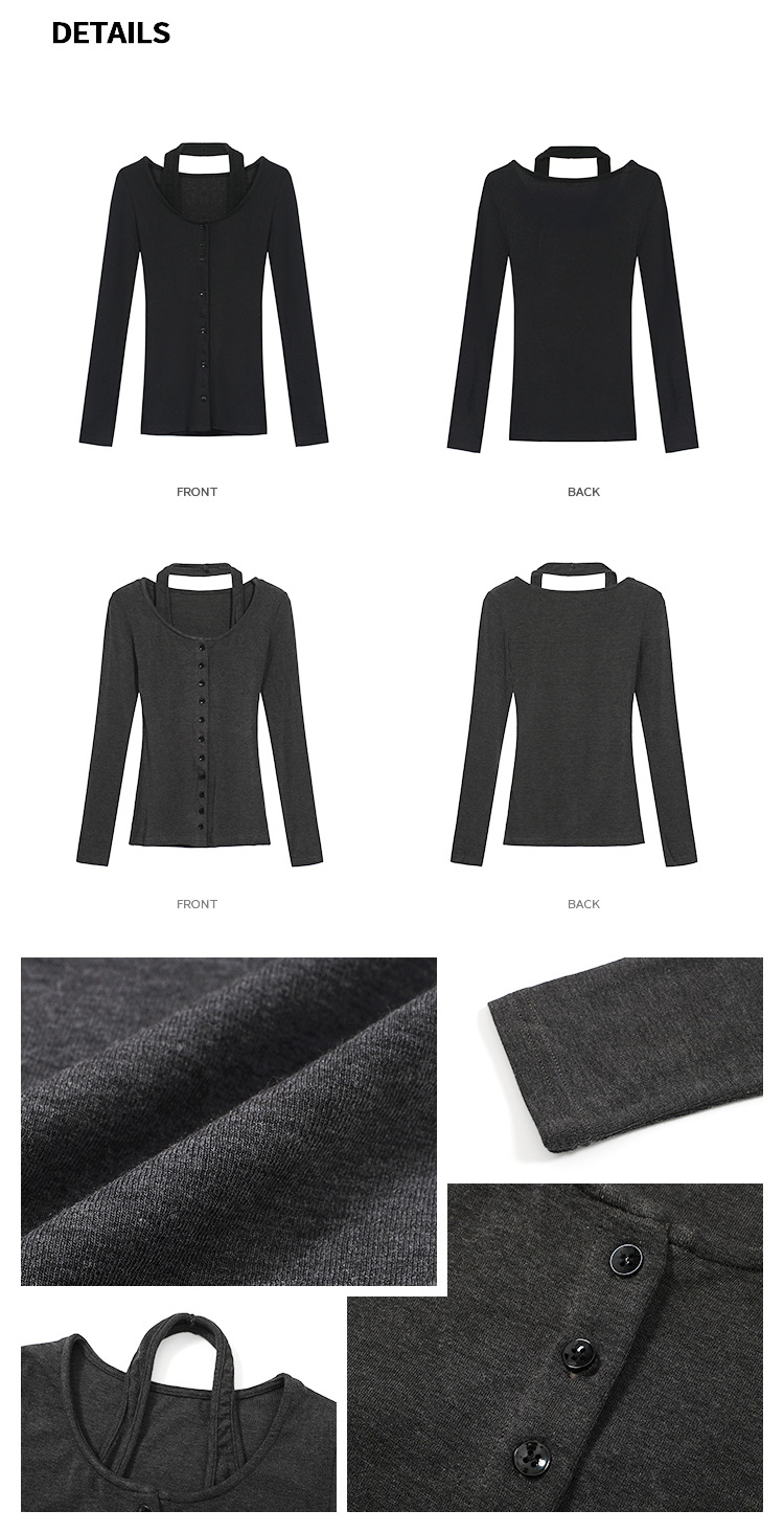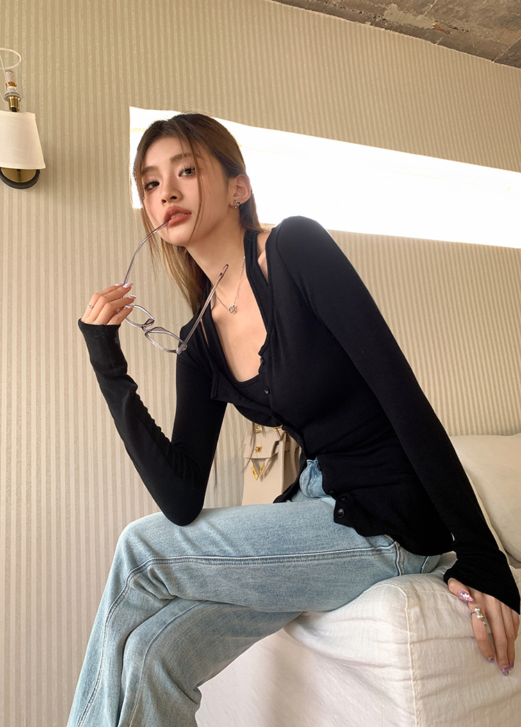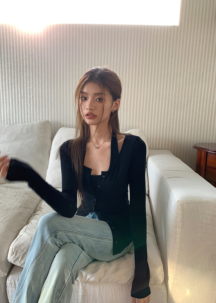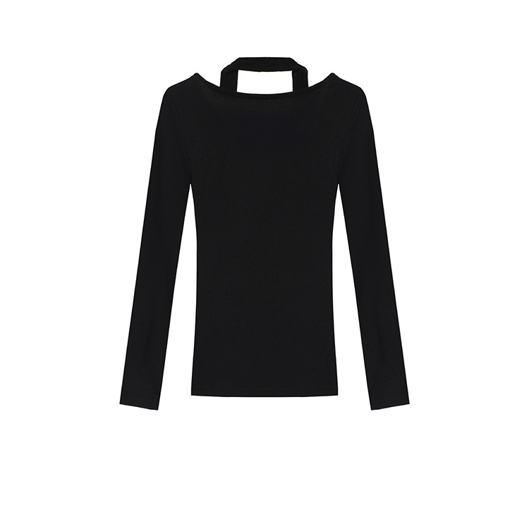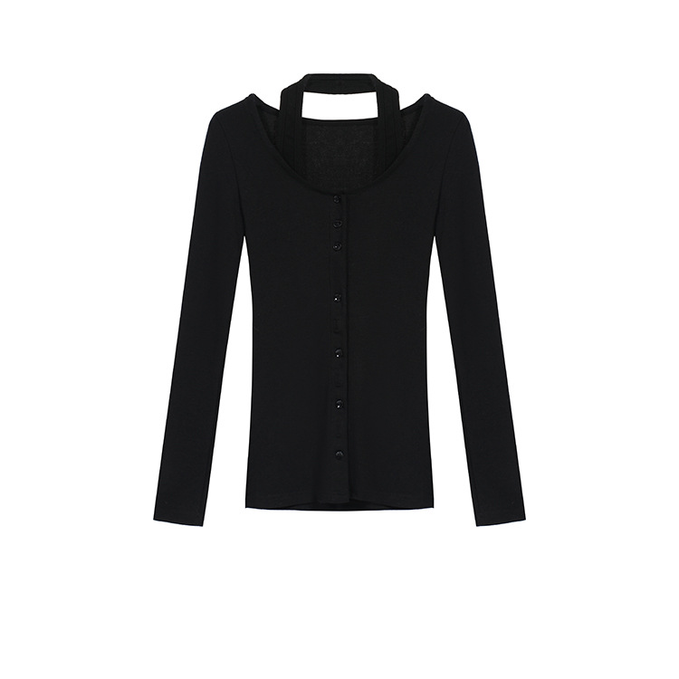 JMA-083 实拍 2023秋装新款灰黑显瘦修身长袖T恤女假两件打底挂脖辣妹上衣